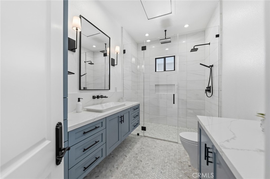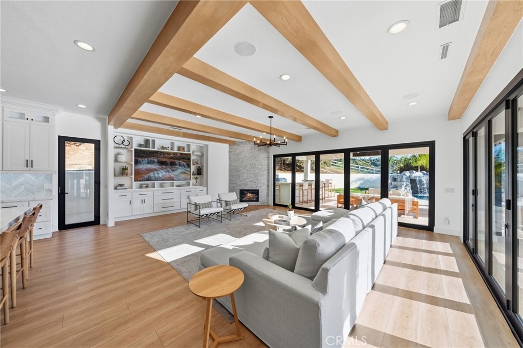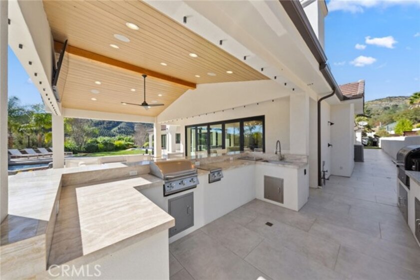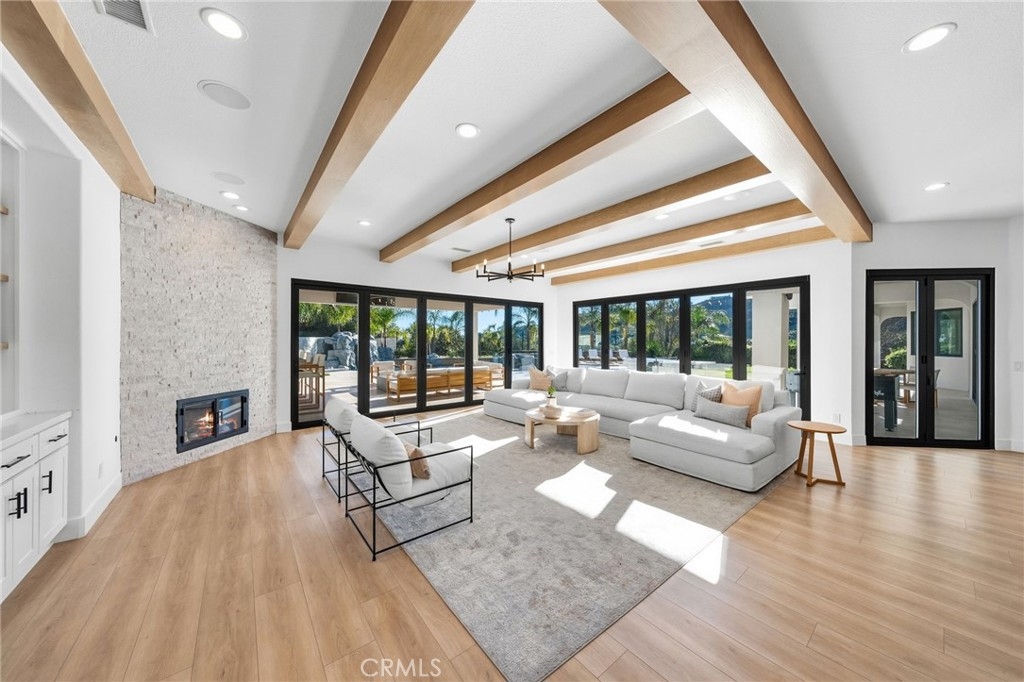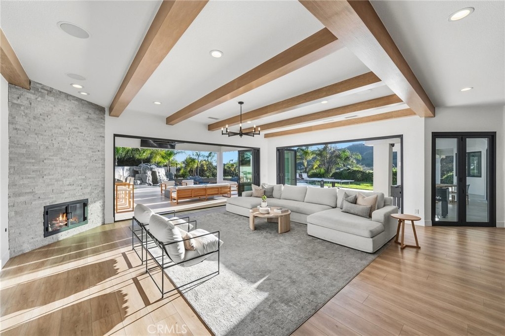 Welcome to a truly one of a kind, fully renovated single story estate, ideally situated in what is arguably one of the best locations De Luz has to offer. Perched at the top of the mountain while still just minutes from town. Set behind a private gated entrance and fully fenced for added privacy, this exceptional property combines luxury, functionality, and lifestyle in one remarkable offering. Spanning just over 4,000 square feet, the home features 4 spacious bedrooms and 4 bathrooms, including three secondary bedrooms with their own en-suite baths, each living like a private master suite, while the fourth bedroom is conveniently located across from a full bathroom. Designed with both comfort and style in mind, the home showcases high ceilings, stunning exposed beams, and an open, light filled floor plan enhanced by pocket doors in multiple rooms for seamless indoor outdoor living. The expansive kitchen is an entertainer’s dream, offering ample space, thoughtful design, and effortless flow into the main living areas. The primary suite is equally impressive, with pocket doors leading directly to the backyard and a beautifully appointed bathroom retreat. Set on approximately 8 acres, the property offers endless possibilities, including room to expand, private trails, and a resort style outdoor experience. Enjoy a sparkling pool and spa, a multipurpose sport court, and a covered patio featuring pitched beamed ceilings, custom tile flooring, misters, ceiling fans, built-in lighting, and multiple TVs. The outdoor kitchen is fully equipped with a built in pizza oven perfect for hosting and entertaining, along with the added luxury of an outdoor shower. Additional highlights include an oversized, nearly 700 square foot garage with custom epoxy flooring, extensive cabinetry, and a water softener system. This home truly has it all… privacy, luxury, space, and unmatched amenities creating a property that feels like it was pulled straight from a Pinterest dream. Opportunities like this are rare. Reach out today, this one will not last long.