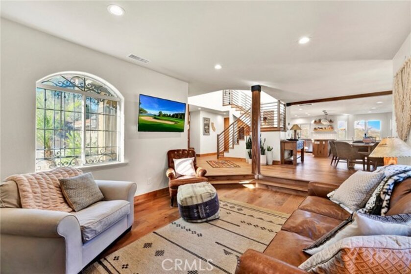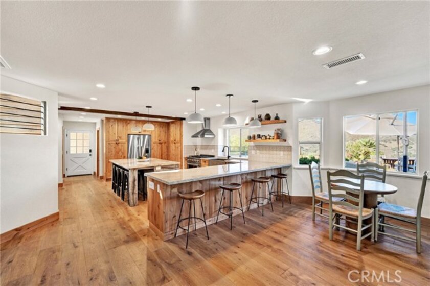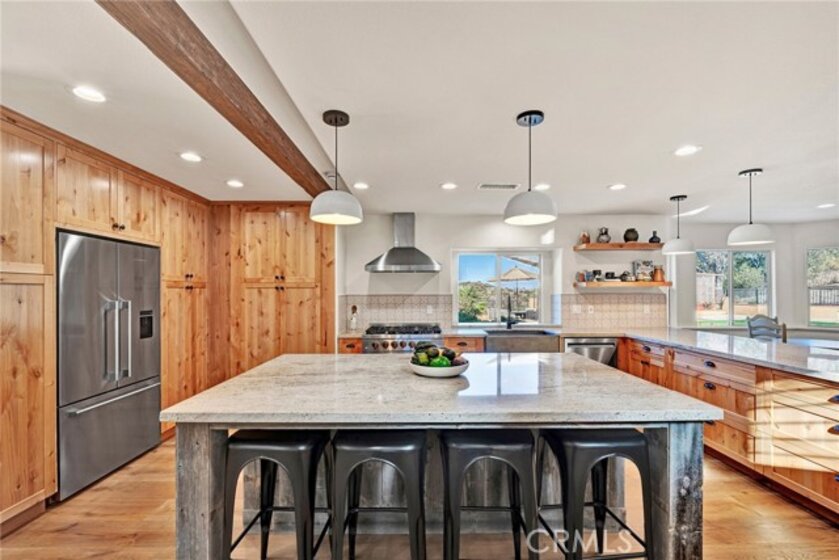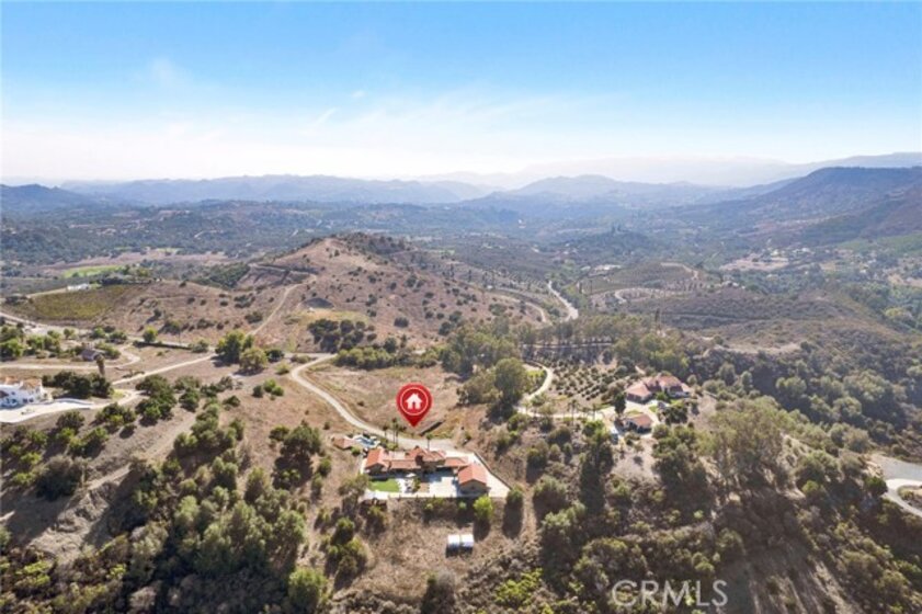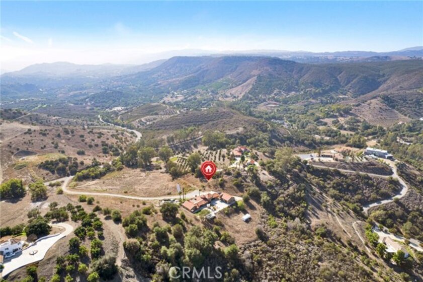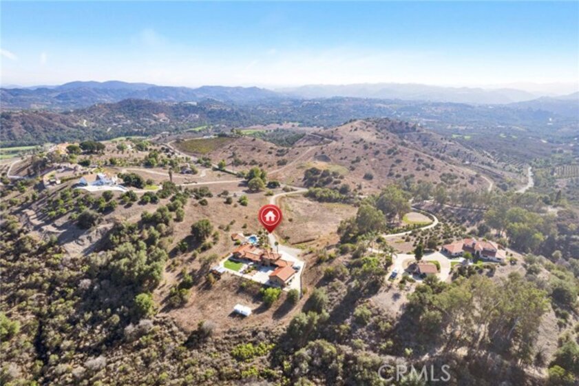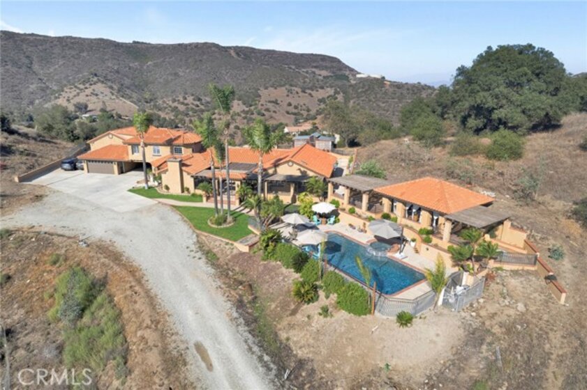 Welcome home to this stunning Mediterranean-inspired estate, set amidst the breathtaking views of Temecula Wine Country. Nestled on 8.63 peaceful acres of rolling land, this property offers the perfect balance of tranquility and luxury. The main home spans a generous 3,579 square feet and has recently undergone an extensive, high-end remodel. It features a beautifully appointed main-level primary suite, a junior suite, a guest bathroom, and a separate laundry room with ample storage. Upstairs, you’ll find an additional suite with two bedrooms, each with its own closet, and a shared full bathroom. The heart of the home is the chef’s kitchen, complete with top-of-the-line appliances, stunning "Knotty Alderwood" cabinetry, sleek granite countertops, and a cozy breakfast nook. The great room boasts a stately Venetian plaster-style fireplace, while the formal dining area offers the perfect setting for dinner parties. Step into the living room with a second fireplace, adding elegance to the living spaces. Throughout the home, you’ll enjoy beautiful engineered hardwood flooring, complemented by gorgeous tile and stone accents in the bathrooms. Multiple patios, including an expansive covered patio system, provide plenty of space for outdoor living. The outdoor cabana-style room with a mounted TV is perfect for entertaining, while the uncovered firepit patio overlooks your sparkling pool and spa—ideal for relaxing and unwinding. For extra versatility, an attached bonus room near the covered carport offers a great space for additional sleeping quarters, a gym, or a flexible room to suit your needs. The detached, two-story, 6-car garage is a true standout, featuring roll-up doors, a bonus/office space with a beautiful cabinet and sink, and an additional upstairs studio. The amazing backyard has panoramic views, multiple patios, planter boxes and pots around the backyard, along with a pickleball area and putting green. Additionally, there is a spacious chicken and small animal coop, plus 2 more small animal stalls on the lower level. With its stunning outdoor spaces, captivating views, and quality upgrades throughout, this property offers everything you could want in a home. There’s truly no place like it!