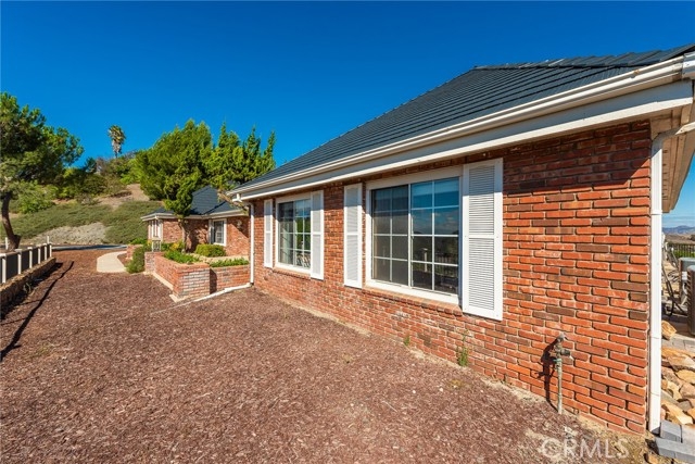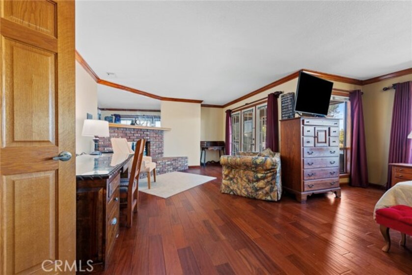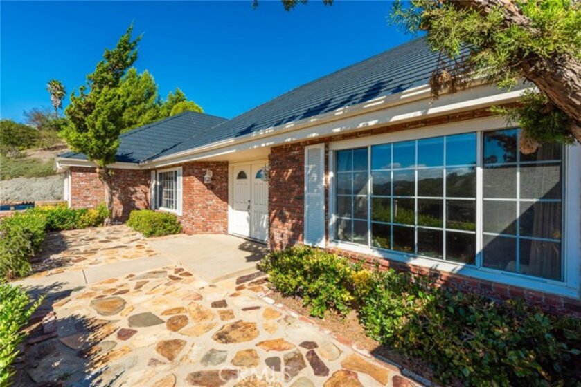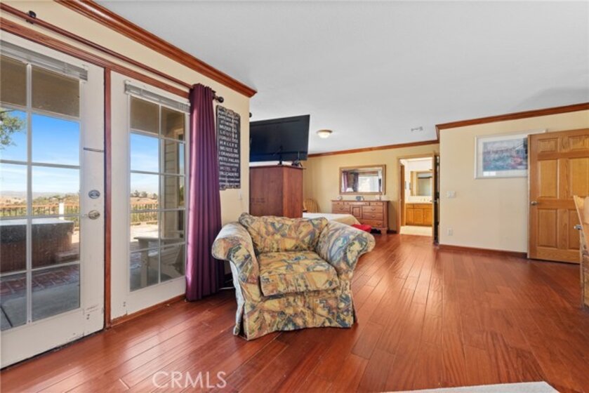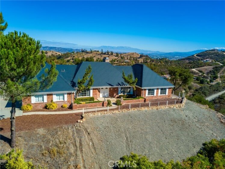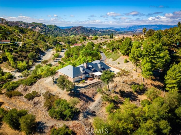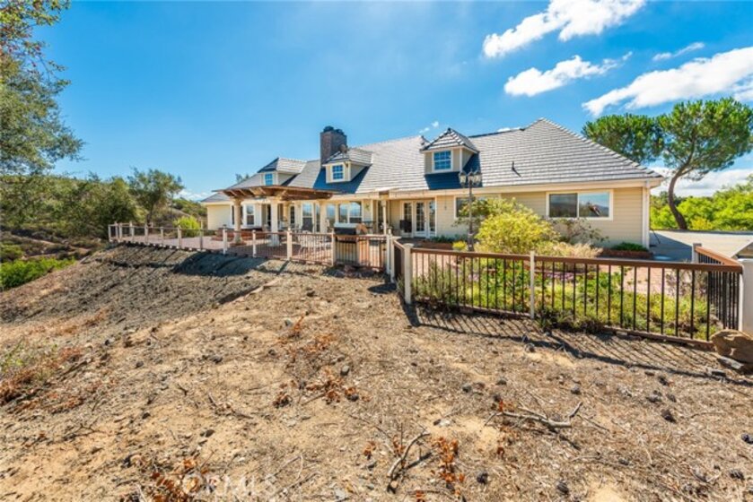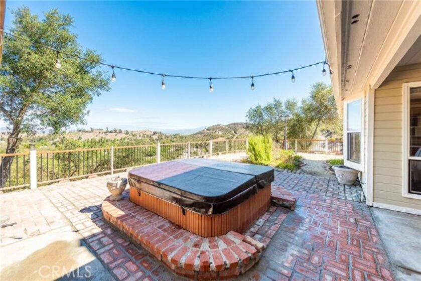 Nestled on a sprawling 5.15-acre lot in a desirable area of Temecula, this scenic single-story residence offers a tranquil, large-lot lifestyle with exceptional potential. The main level of the home provides a comfortable layout featuring 3 bedrooms and 2.5 bathrooms. The inviting, open-concept design flows through expansive living areas, including a formal dining room and a large family room. Elegant details abound, such as Brazilian Cherry engineered flooring, classic wainscoting, and French doors leading to the exterior. The large kitchen is the heart of the home, featuring oak wood cabinetry, travertine tile flooring, and a convenient butler’s pantry. The adjacent dedicated dining area is perfect for casual meals. Utility spaces include a spacious laundry room with a large porcelain sink, upper and lower cabinets, and matching travertine tile. The luxurious Primary Suite offers a walk-in closet, a dedicated fireplace, and an en-suite bathroom complete with double basins and a relaxing Jacuzzi tub. A unique opportunity exists in the upper level, which features two rooms and a loft—perfect for extra storage or flexible space. Outside, the backyard features extensive brick paving and a 7-foot Jacuzzi-brand hot tub, ideal for enjoying the quiet acreage.