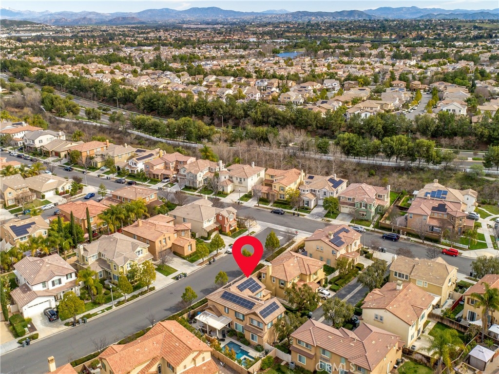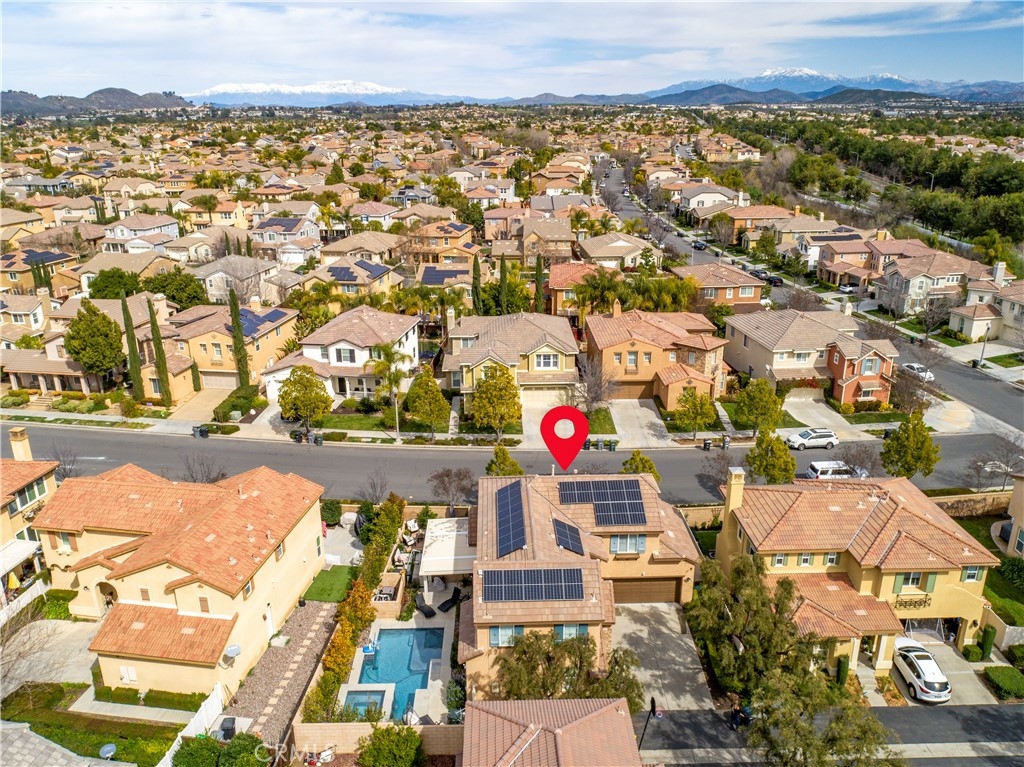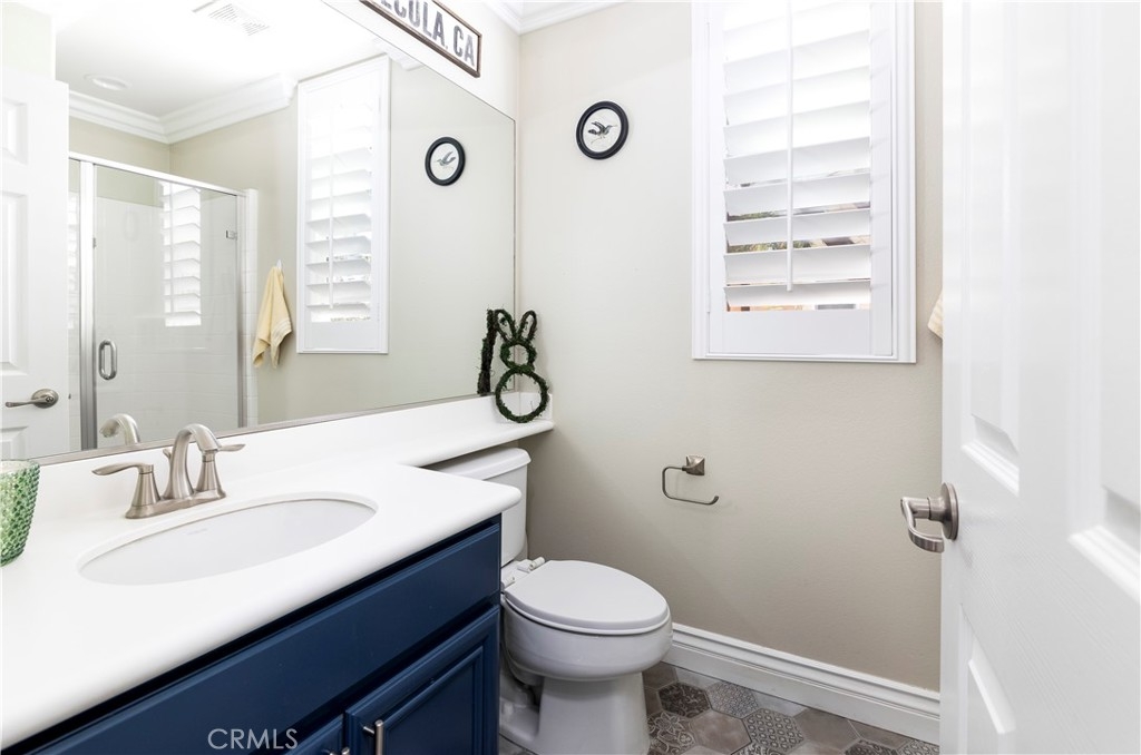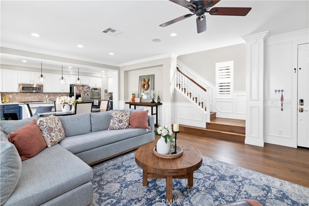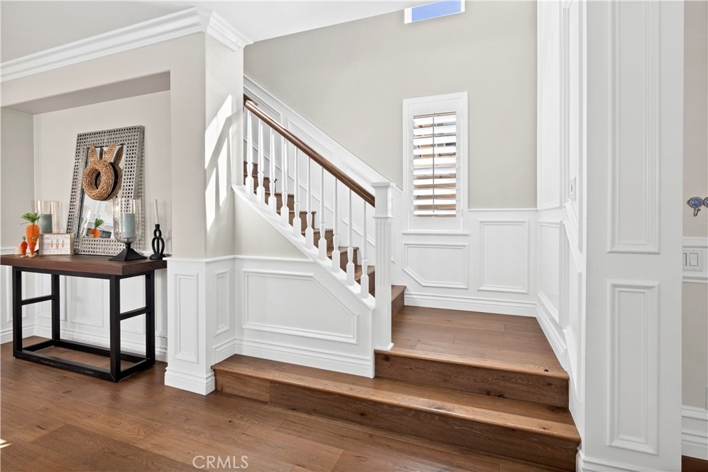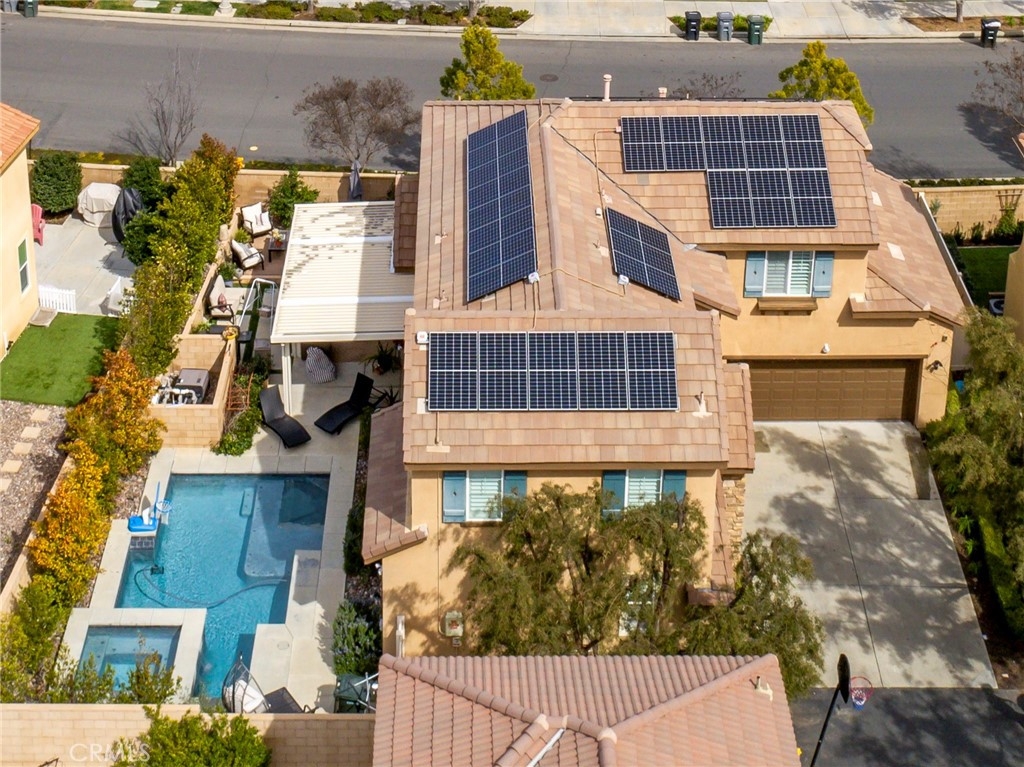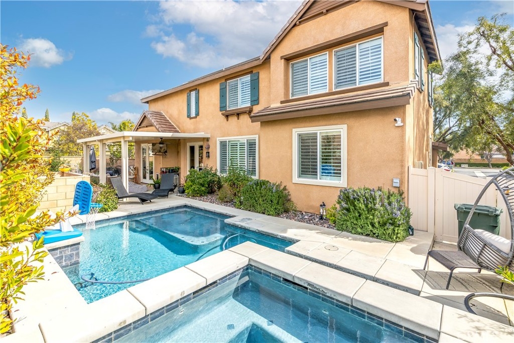 Welcome to this stunning Harveston home with all the upgrades you could dream of! Salt Water Pool, Spa and PAID Solar. This 4 bedroom, 3 bath home features a main floor bedroom and bathroom, perfect for guests or multi-generational living. As you enter the home, you'll notice the beautiful wainscoting, custom door casing, and European Oak flooring throughout. The living room and downstairs bedroom boast custom built-in cabinets, while crown molding and plantation shutters add an elegant touch. The kitchen is a chef's dream with quartz countertops, marble backsplash, pendant lighting, and stainless steel appliances. The open concept living space includes a dining room and family room with fireplace, perfect for entertaining. Upstairs you'll find the primary suite with a completely remodeled bathroom featuring dual sinks, a walk-in shower, and a large soaking tub. Two additional bedrooms and a laundry room complete the upstairs living space. Custom French doors lead you outside to your own private paradise with a salt water pool and spa, covered patio with fans and TV, and a putting green on the side yard. The block wall and Carolina Cherry Trees add extra privacy. This home is zoned for award-winning Temecula schools and walking distance to Ysabel Barnett Elementary and Chaparral High School. Enjoy all the amenities Harveston has to offer, including a Jr. Olympic pool, spa, and children's splash park. Conveniently located near shopping, restaurants, Old Town, Wine Country, and the freeway, this home truly has it all. Don't miss your chance to own this beautiful Harveston property!