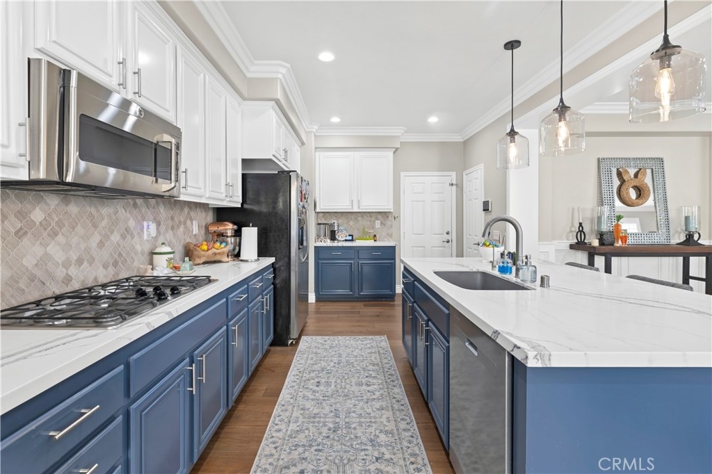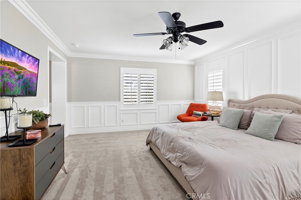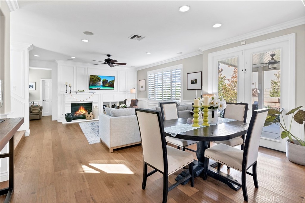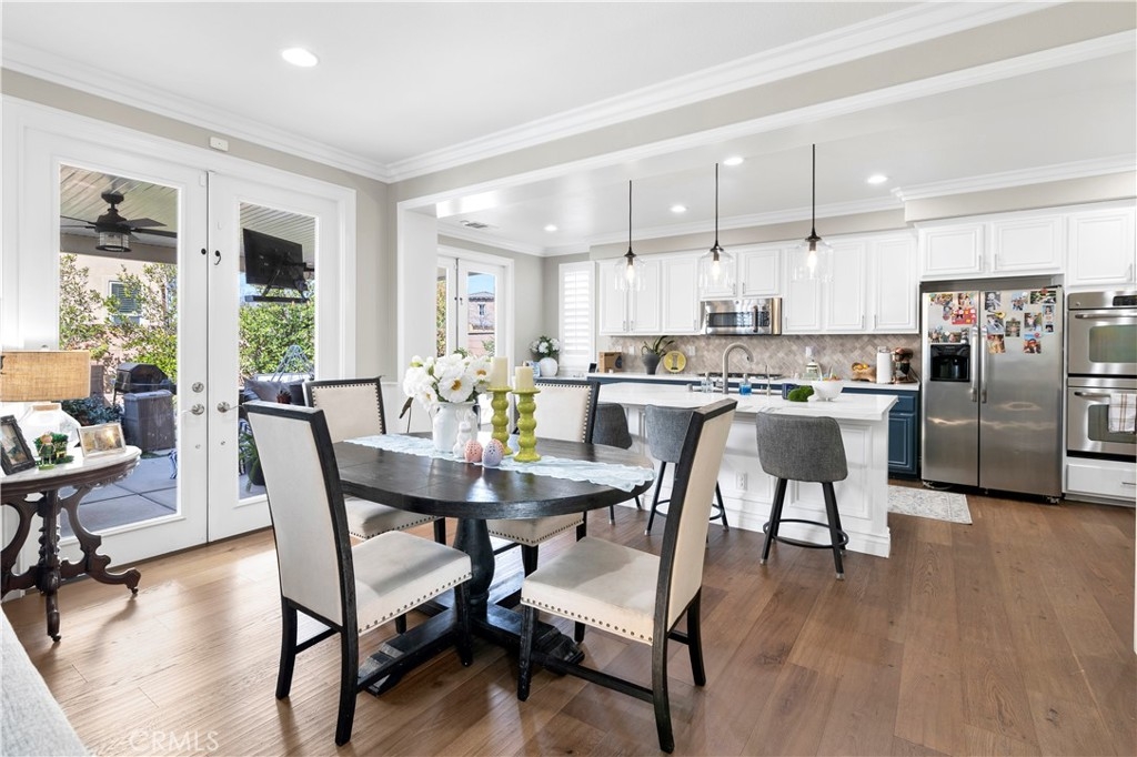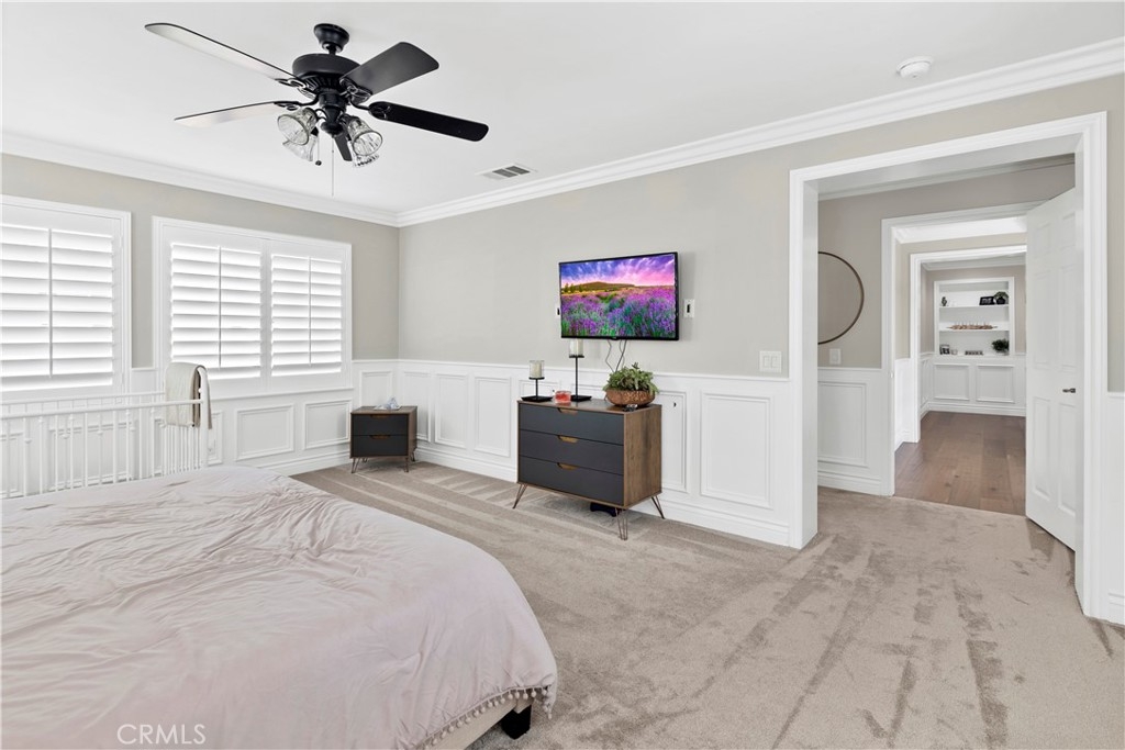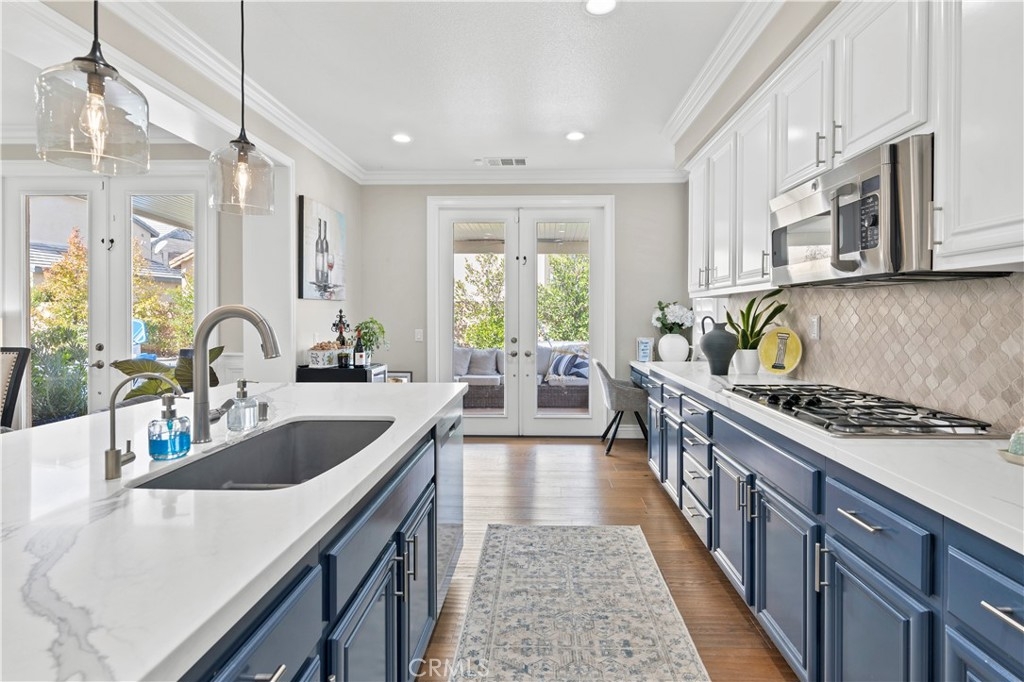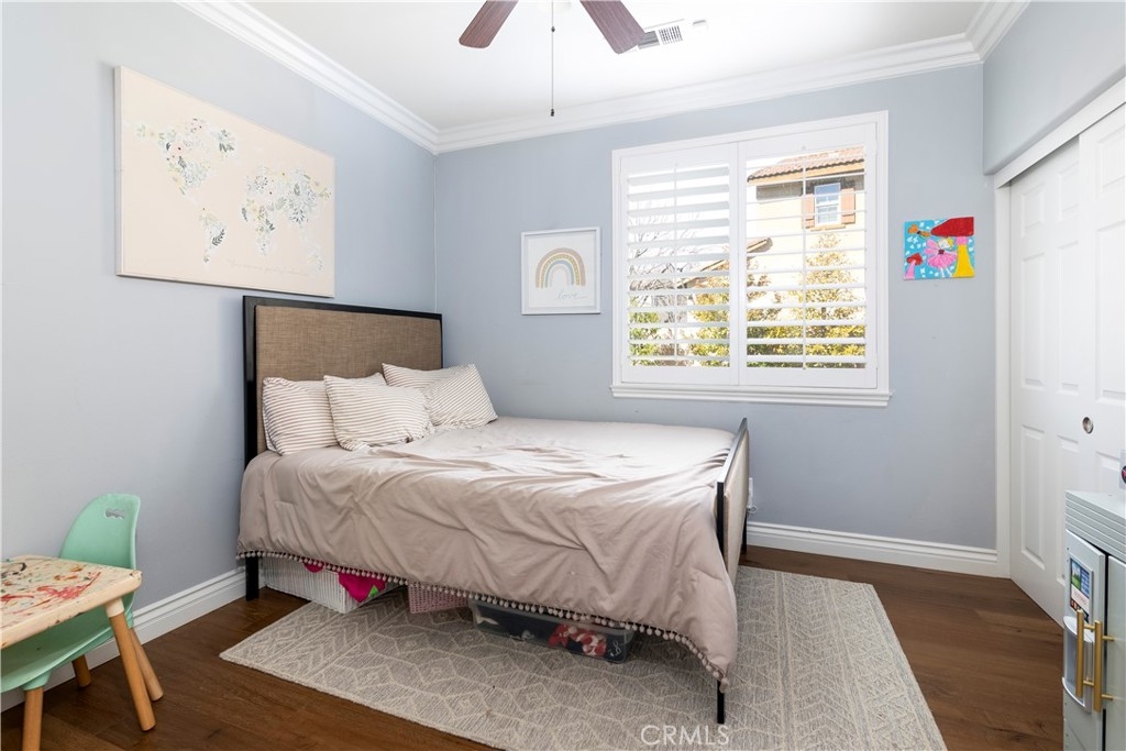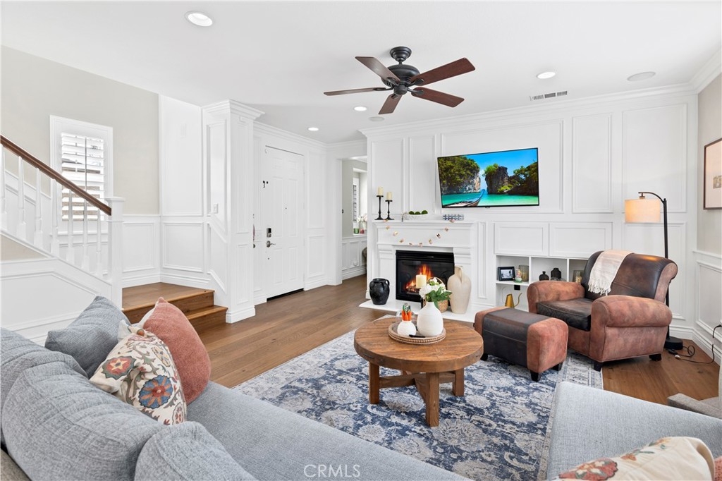 Welcome to this stunning Harveston home with all the upgrades you could dream of! Salt Water Pool, Spa and PAID Solar. This 4 bedroom, 3 bath home features a main floor bedroom and bathroom, perfect for guests or multi-generational living. As you enter the home, you'll notice the beautiful wainscoting, custom door casing, and European Oak flooring throughout. The living room and downstairs bedroom boast custom built-in cabinets, while crown molding and plantation shutters add an elegant touch. The kitchen is a chef's dream with quartz countertops, marble backsplash, pendant lighting, and stainless steel appliances. The open concept living space includes a dining room and family room with fireplace, perfect for entertaining. Upstairs you'll find the primary suite with a completely remodeled bathroom featuring dual sinks, a walk-in shower, and a large soaking tub. Two additional bedrooms and a laundry room complete the upstairs living space. Custom French doors lead you outside to your own private paradise with a salt water pool and spa, covered patio with fans and TV, and a putting green on the side yard. The block wall and Carolina Cherry Trees add extra privacy. This home is zoned for award-winning Temecula schools and walking distance to Ysabel Barnett Elementary and Chaparral High School. Enjoy all the amenities Harveston has to offer, including a Jr. Olympic pool, spa, and children's splash park. Conveniently located near shopping, restaurants, Old Town, Wine Country, and the freeway, this home truly has it all. Don't miss your chance to own this beautiful Harveston property!