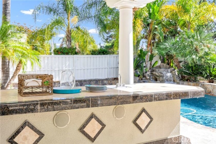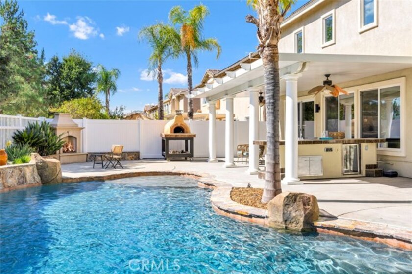 Luxury executive pool home in the highly sought-after neighborhood of Paseo Del Sol - fully upgraded and remodeled. Enjoy the sounds of the pool waterfall and sights of a backyard oasis from your brand new kitchen with soft-closing light oak cabinets, quartz counters, new high-end appliances, tiled backsplash, floating shelves, custom range hood and large island. Boasting a large main floor primary suite with huge tiled shower, double vanities, soaking tub, quartz counters, plus large walk-in closet! The upstairs bedrooms are spacious with walk-in closets in two, plus built-in office furniture in another. The upstairs loft with built-in cabinets overlooks the vaulted ceiling in the kitchen and open-concept living room with contemporary staircase, railings, and fireplace. Recently added full bathroom downstairs with a large tiled onyx-look shower with bench seat. The house has high ceilings, lots of light, and many desirable interior finishes like arched doorways and wood accent walls. The pool was recently redone with a pebbletec surface, variable speed pump for the waterfall controlled by an app, new filter and pool light. Your dream backyard has a built-in gas fireplace, wood-burning pizza oven, and grill island with new Lion grill plus beverage fridge to entertain throughout the year! With no rear neighborhoods, peek-through mountain views and a quiet street, this is truly a backyard dream! Minimize utilities through a large solar system (28 panels with low monthly lease or buyout option) and pool heating via solar as well. The 3 car garage is oversized and comes with an additional storage room. The house is nicely situated in one of the best neighborhoods in Temecula with low low taxes (no Mello Roos) and low HOA, with walking trails, community pools, shopping and schools are all a close distance away.