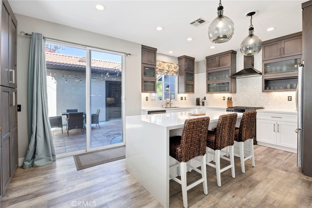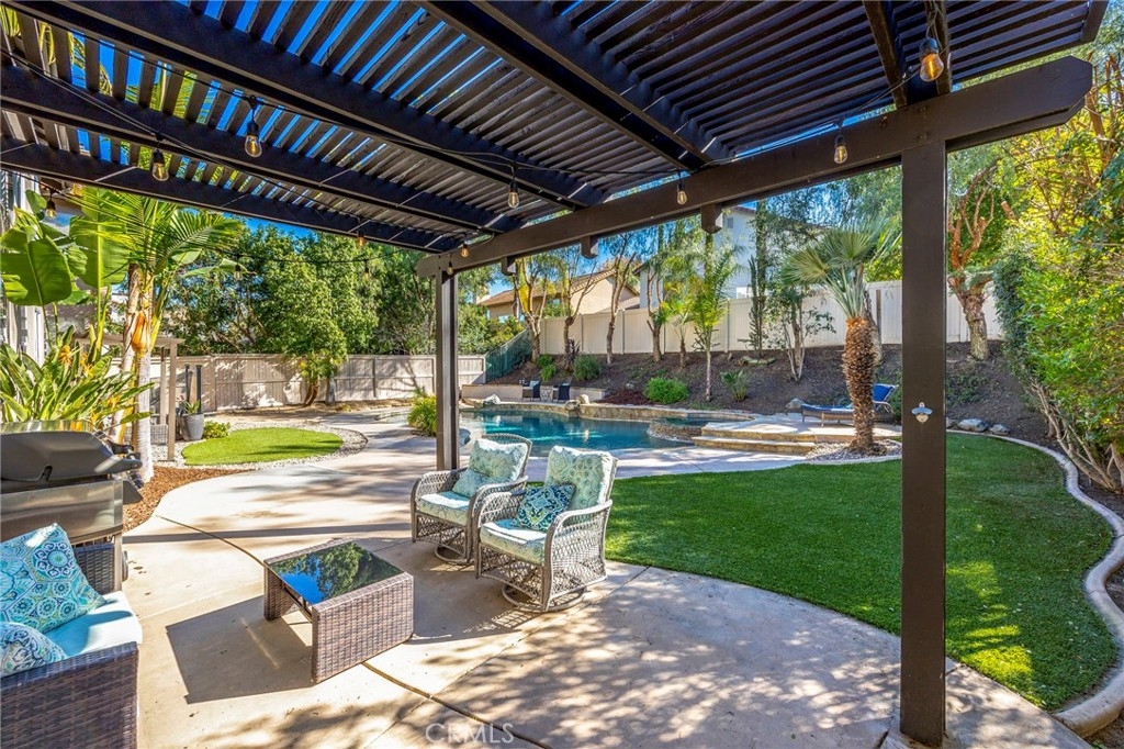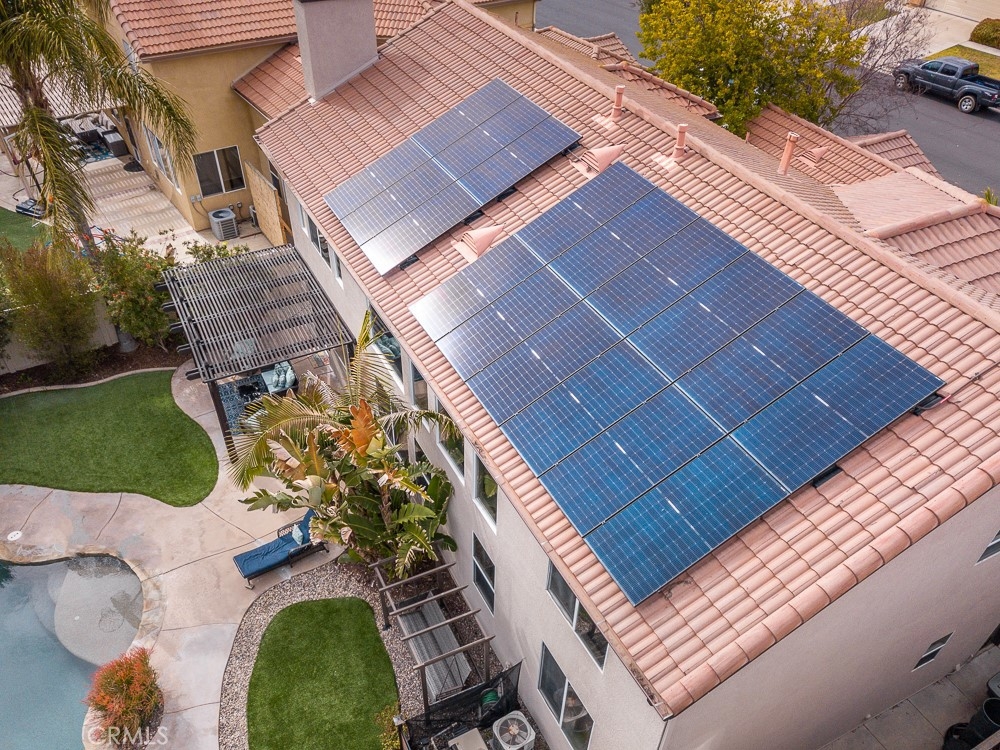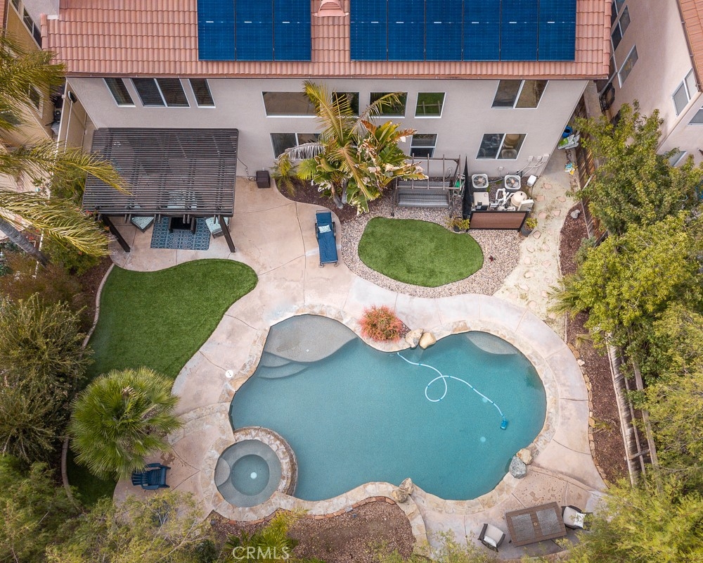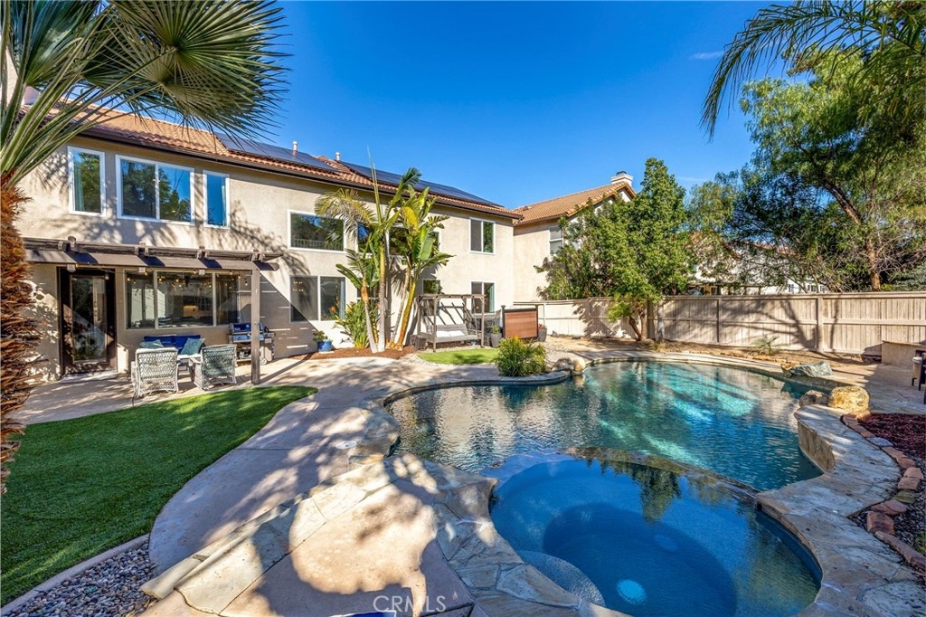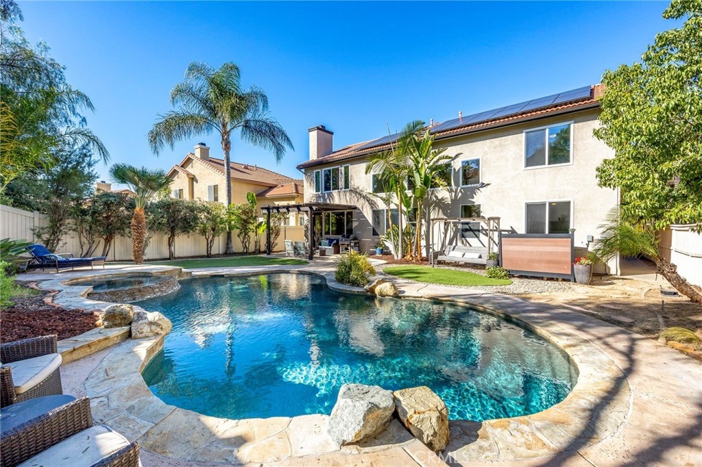 Welcome home to your fully remodeled and upgraded pool/spa home in the highly sought-after Paseo Del Sol community. This bright, spacious, 5-bedroom, 3-bathroom home offers luxurious well-designed living space in one of Temecula’s most desirable neighborhoods complete with 2 resort-like community pools plus tennis, parks, and walking distance to Abby Reinke Elementary. Beyond the gorgeous street presence awaits a secluded front courtyard complete with cafe lights and Saltillo tile. Inside, the functional and open layout with vaulted ceilings in the living and dining areas creates an airy and inviting feel in this unique floor plan - one main floor office/bedroom with no closet adjacent to a full bath. The reimagined kitchen features a large waterfall quartz island, quartz countertops, a custom backsplash with mother of pearl mini subway tile, solid wood Shaker cabinets, contemporary glass euro-hinged upper cabinets, and a walnut countertop between the pantry cabinets, along with upgraded appliances. The primary suite is a contemporary show-stopper with a stand-alone soaking tub, huge tiled and glass shower with two powerful showerheads, plus a freestanding double sink vanity with vessel sinks and recessed medicine cabinets. The primary bedroom has a custom acacia wood accent wall along with a cavernous walk-in closet. Upstairs, the interior doors are solid alder. The large and private backyard is perfect for relaxing and entertaining, boasting a pebbletec pool and spa, newer pool equipment, artificial turf plus a pergola and swing. A rare bonus is the detached 3rd car garage, with endless possibilities for storage, workspace/flex-space uses, or the option to finish to living space. Paid-for solar panels, two new AC units, whole-house fan, plus smart home features like Nest thermostats, Ring cameras, and many new high-end windows help keep energy costs down year-round. The main floor has high-end LVP, 5” baseboards, and a custom concrete ramp sink in the downstairs bathroom. Must see to appreciate all the unique features of this beautiful home. Low taxes, low HOA, no Mello Roos. Ideally located close to Temecula’s best amenities, such as top-rated schools, parks, golf courses, wine country, shopping, dining, and more.