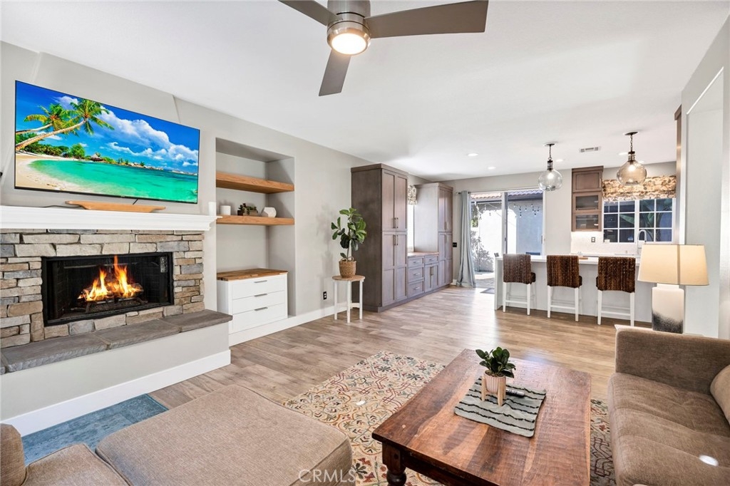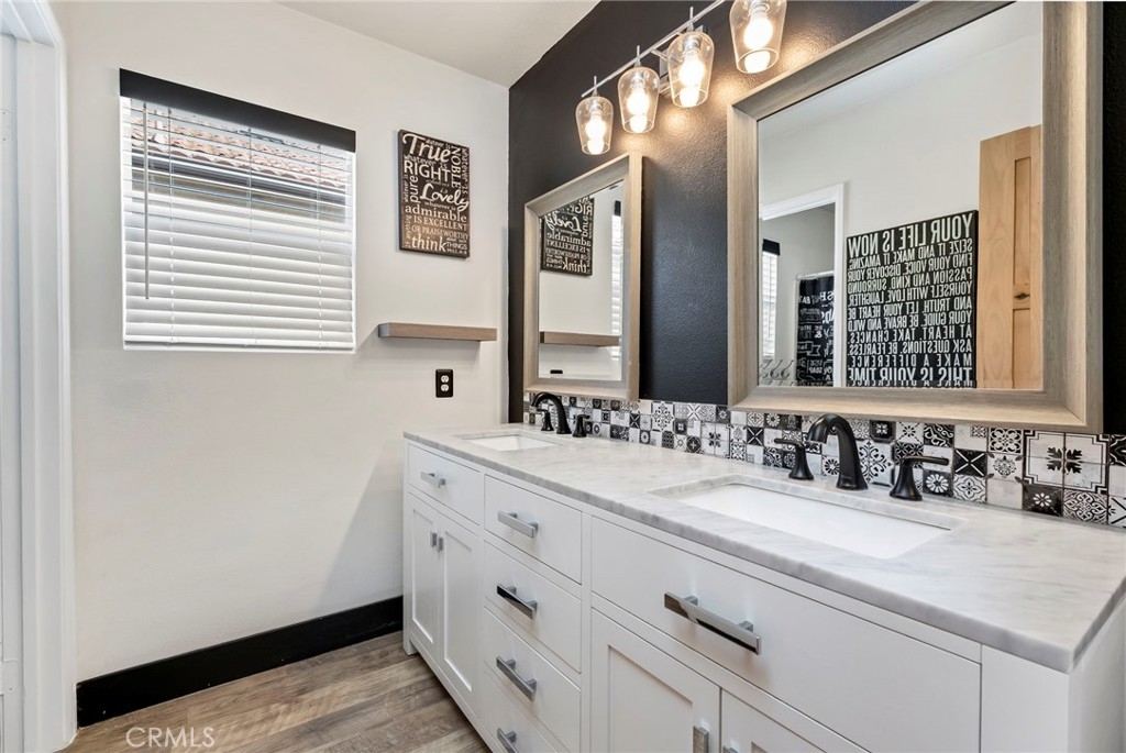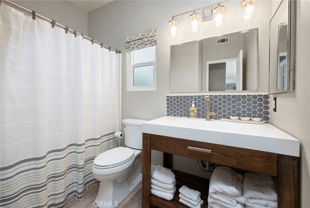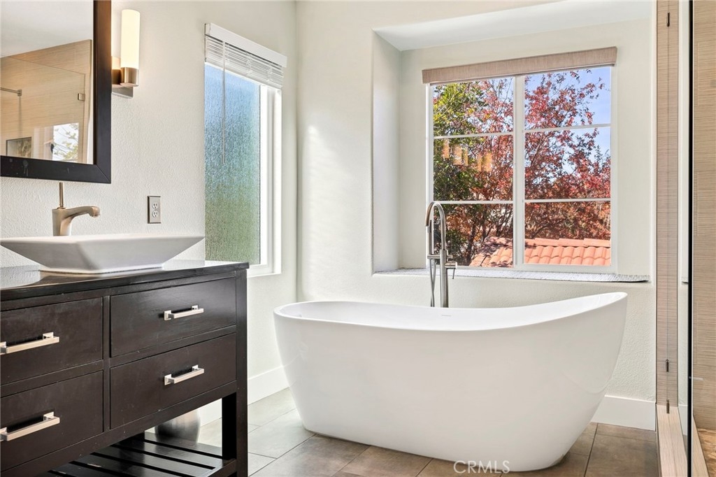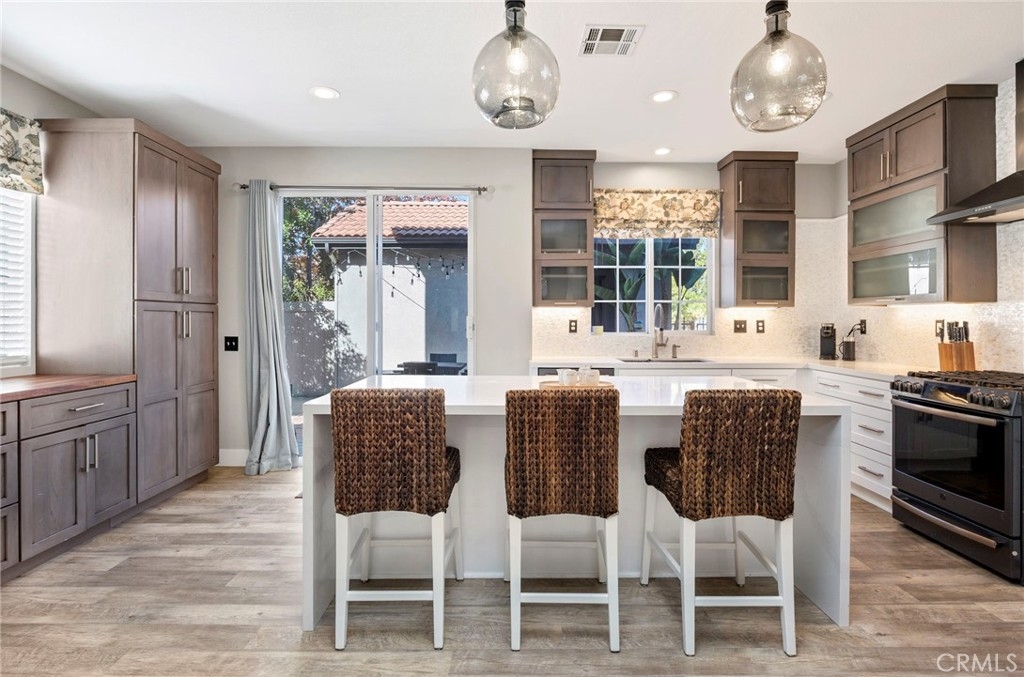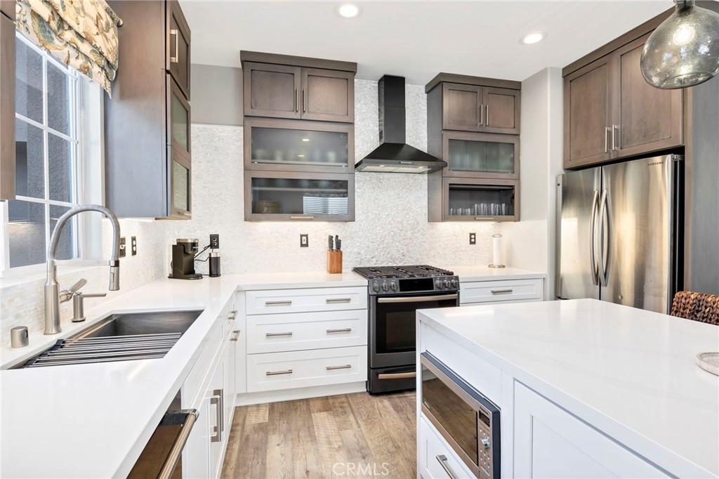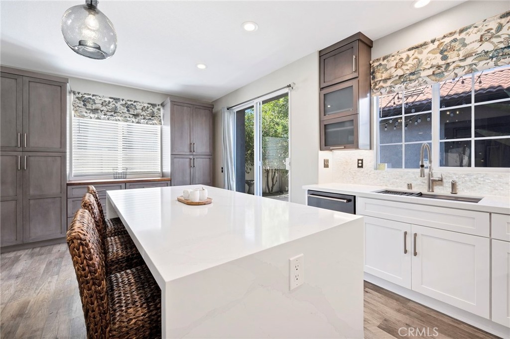 Welcome home to your fully remodeled and upgraded pool/spa home in the highly sought-after Paseo Del Sol community. This bright, spacious, 5-bedroom, 3-bathroom home offers luxurious well-designed living space in one of Temecula’s most desirable neighborhoods complete with 2 resort-like community pools plus tennis, parks, and walking distance to Abby Reinke Elementary. Beyond the gorgeous street presence awaits a secluded front courtyard complete with cafe lights and Saltillo tile. Inside, the functional and open layout with vaulted ceilings in the living and dining areas creates an airy and inviting feel in this unique floor plan - one main floor office/bedroom with no closet adjacent to a full bath. The reimagined kitchen features a large waterfall quartz island, quartz countertops, a custom backsplash with mother of pearl mini subway tile, solid wood Shaker cabinets, contemporary glass euro-hinged upper cabinets, and a walnut countertop between the pantry cabinets, along with upgraded appliances. The primary suite is a contemporary show-stopper with a stand-alone soaking tub, huge tiled and glass shower with two powerful showerheads, plus a freestanding double sink vanity with vessel sinks and recessed medicine cabinets. The primary bedroom has a custom acacia wood accent wall along with a cavernous walk-in closet. Upstairs, the interior doors are solid alder. The large and private backyard is perfect for relaxing and entertaining, boasting a pebbletec pool and spa, newer pool equipment, artificial turf plus a pergola and swing. A rare bonus is the detached 3rd car garage, with endless possibilities for storage, workspace/flex-space uses, or the option to finish to living space. Paid-for solar panels, two new AC units, whole-house fan, plus smart home features like Nest thermostats, Ring cameras, and many new high-end windows help keep energy costs down year-round. The main floor has high-end LVP, 5” baseboards, and a custom concrete ramp sink in the downstairs bathroom. Must see to appreciate all the unique features of this beautiful home. Low taxes, low HOA, no Mello Roos. Ideally located close to Temecula’s best amenities, such as top-rated schools, parks, golf courses, wine country, shopping, dining, and more.