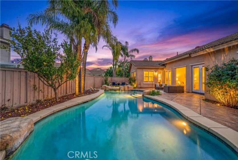 **OPEN HOUSE Mar 1, 11:00-2:00PM**LUXURY SINGLE-STORY POOL RETREAT WITH A TRUE INDOOR-OUTDOOR LIFESTYLE IN PASEO DEL SOL!**Rare executive pool home offering 4 bedrooms, 2.5 bathrooms, and approximately 2,816 square feet of beautifully designed living space on a private, resort-style lot. The grand entry opens into an entertainer’s dream, featuring a spacious great room with three sets of double French doors that frame the sparkling pool and invite natural light throughout. High ceilings, recessed lighting, and slate flooring that extends from indoors to out create a seamless California lifestyle experience perfect for gatherings and everyday luxury living. The chef’s kitchen is a true centerpiece, showcasing a built-in SubZero refrigerator, Thermador induction cooktop, Miele oven and microwave, ultra-quiet Miele dishwasher, hand-hewn live edge granite countertops, a large quartz center island with seating, and a stunning farm-style copper sink. Abundant cabinetry and thoughtful design make this space as functional as it is impressive. Privately situated on one wing of the home, the expansive primary suite offers a tranquil retreat complete with dual sinks, separate soaking tub and shower, and a fully built-out custom closet featuring sliding racks accommodating up to 32 pairs of shoes. On the opposite wing, three additional bedrooms are complemented by a full bath, guest powder room, and a flexible optional 5th room ideal for a den, office, or formal dining space. The backyard delivers true resort-style living with a sparkling pool and spa, built-in stainless BBQ island with approximately 48” grill, sink, side burner, storage, and bar seating, plus a hardscape gas fire pit with semi-circular seating surrounded by lush landscaping. Pre-wired outdoor and in-wall family and great room speakers enhance the entertaining experience, along with a custom built-in media cabinet wired for TV and lighting. Additional highlights include two brand new A/C units, central heating, individual laundry room, and a finished 3-car “man cave” garage featuring slate floors, ceiling fans, built-in cabinetry, in-wall speakers, and wiring for a large screen TV. Enjoy Paseo del Sol’s resort-style amenities including pools, tennis courts, parks, and clubhouses, all with a low HOA and low tax rate. Ideally located near top-rated schools, shopping, dining, Temecula’s renowned wine country, golf+play at Pechanga and more.