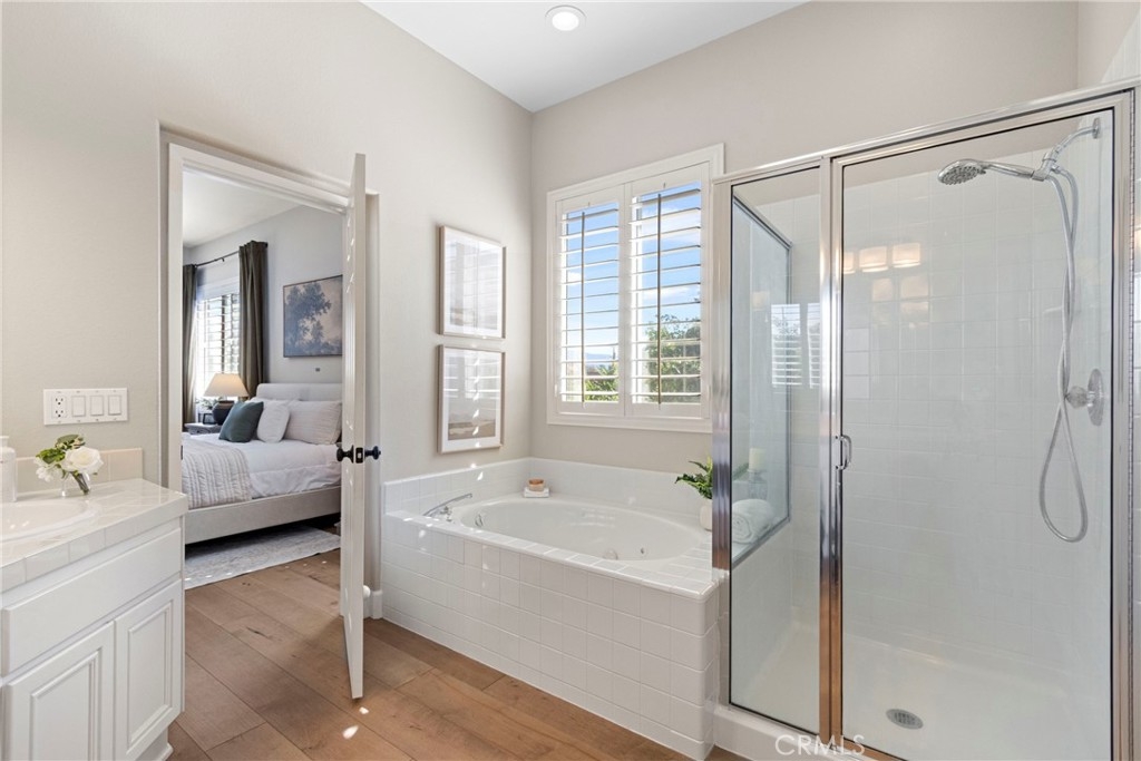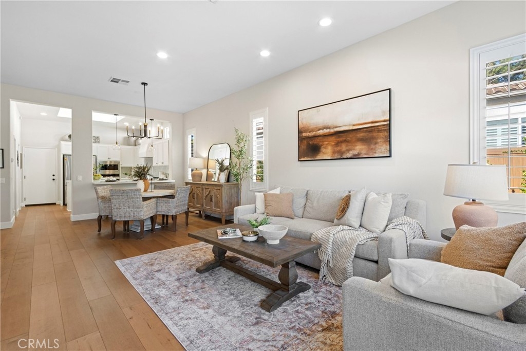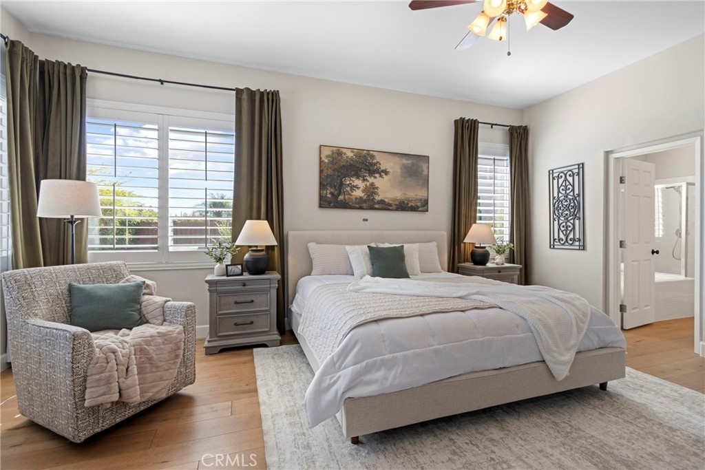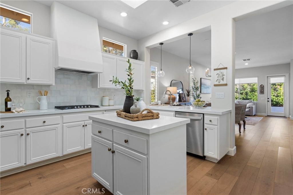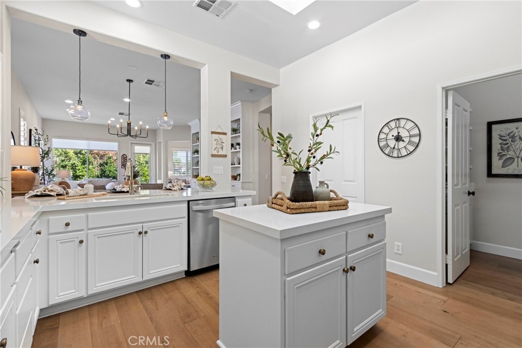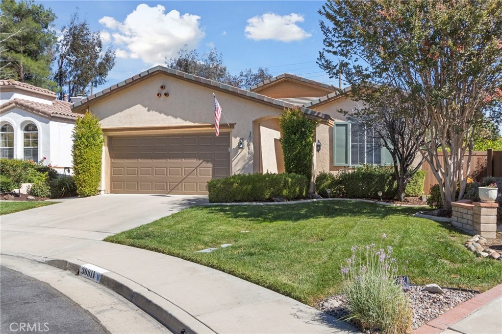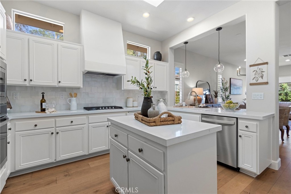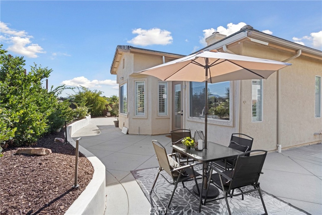 Splendor awaits in this rare, turnkey single-story home in the highly desirable Temeku Hills community! Ideally situated at the end of a quiet cul-de-sac with no rear neighbors, this property offers peaceful mountain views, exceptional privacy, and wonderful proximity to all that Temecula living has to offer. Enjoy easy freeway access and be just minutes from Wine Country, Pechanga Resort & Casino, Old Town, and top-tier shopping and dining. Step inside and instantly feel the warmth and sophistication of this pristine home, where pride of ownership shines throughout. Rich maple hardwood flooring, plantation shutters, and abundant natural light—enhanced by lovely kitchen skylights—create a bright, welcoming ambiance. A spacious den/flex room flows effortlessly into the open-concept great room, framing beautiful backyard and mountain views. The gourmet kitchen is a showpiece, boasting quartz countertops, elegant zellige tile backsplash, stainless steel appliances, a center island with storage, large walk-in pantry, and barstool seating—perfect for gatherings. Through elegant French doors, the primary suite is a serene retreat offering a custom-designed walk-in closet, an ensuite bath with dual sinks, vanity area, separate tub and shower, and a private water closet. The large laundry room with storage cabinets adds everyday convenience, while the secondary bedroom enjoys a charming view of the front garden and easy access to the full guest bath. Step outside to a low-maintenance backyard designed for relaxation and entertaining—complete with mountain views, open space behind the home, and a built-in gas line ready for your BBQ. Residents of Temeku Hills enjoy a premier resort-style lifestyle with access to a grand clubhouse, Olympic-size pool and spa, fitness center, sports courts, golf, tot lots, and beautifully maintained grounds.
