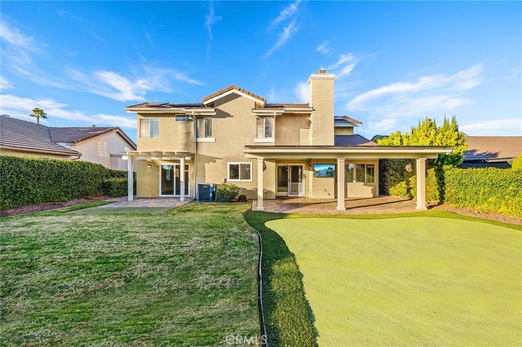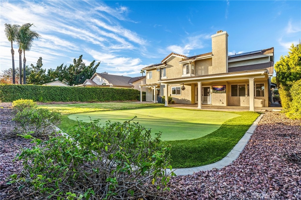 Gorgeous home located in the highly coveted Villa Avanti community of Temecula, ideally situated within walking distance to Temecula Valley High School and Ronald Reagan Sports Park. LARGE PAID OFF SOLAR SYSTEM included!! As you arrive, you’re welcomed by a long driveway and a charming brick front porch. Inside, enjoy fresh interior paint, brand-new carpet, and beautiful hardwood floors. The flexible floor plan features a spacious living room with vaulted ceilings and a custom built-in entertainment center, along with a formal dining area highlighted by a stunning slider that fills the home with natural light.The remodeled kitchen is a showstopper, boasting custom cabinetry with rollout drawers, granite countertops, stainless steel cooktop and dishwasher, brand-new high-end stainless steel oven, and a brand-new built-in stainless steel refrigerator. A stylish wine bar with a custom built-in wine refrigerator creates the perfect space for entertaining. Additional kitchen upgrades include updated lighting, tumbled travertine backsplash, custom stainless steel sink, and an upgraded kitchen faucet. The open-concept family room is open to the kitchen and offers gorgeous backyard views, creating a warm and inviting space for everyday living. Enjoy the cozy fireplace with custom iron doors while taking in the serene outdoor setting. There is a bedroom and ¾ bathroom on the first floor providing ideal flexibility for guests or multigenerational living or home office. Upstairs, the spacious primary suite features a walk-in closet plus a secondary closet with custom organizer. The views from the primary bedroom of the city and mountain views are a must see. The primary bathroom includes dual sinks, a soaking tub, and a separate step-in shower. Two additional generously sized bedrooms are connected by a convenient Jack-and-Jill bathroom.The backyard is designed for relaxation and entertaining with two separate Alumawood patio covers, including an oversized covered area with ceiling fans and an outdoor TV is included—perfect for game days—along with a custom putting green. Additional highlights include a large three-car garage with extensive built-in storage cabinets, HVAC and furnace replaced approximately six years ago, a tankless water heater installed about four years ago, and a large paid-off solar system. Enjoy super-low property taxes and a low HOA, making this exceptional home a must-see.