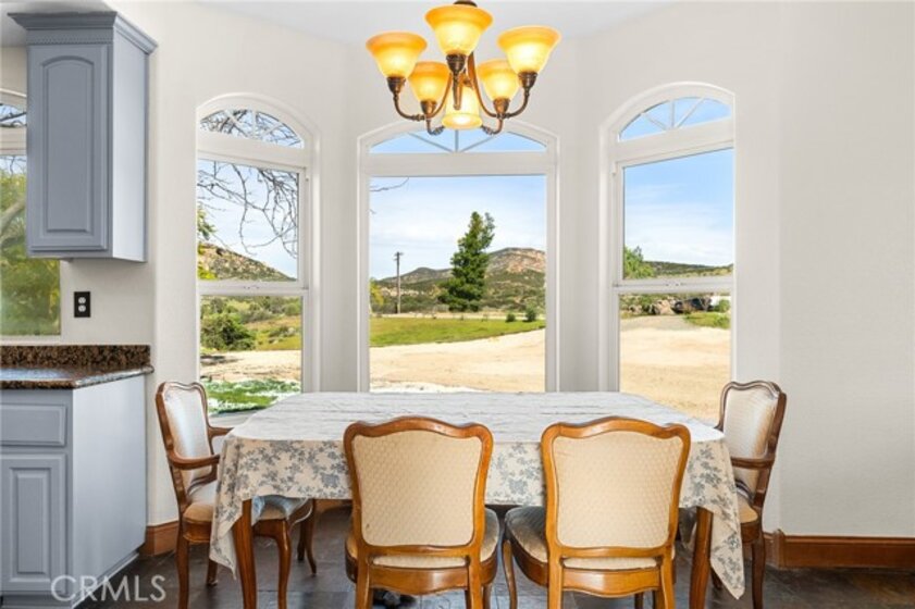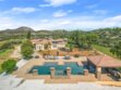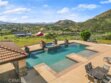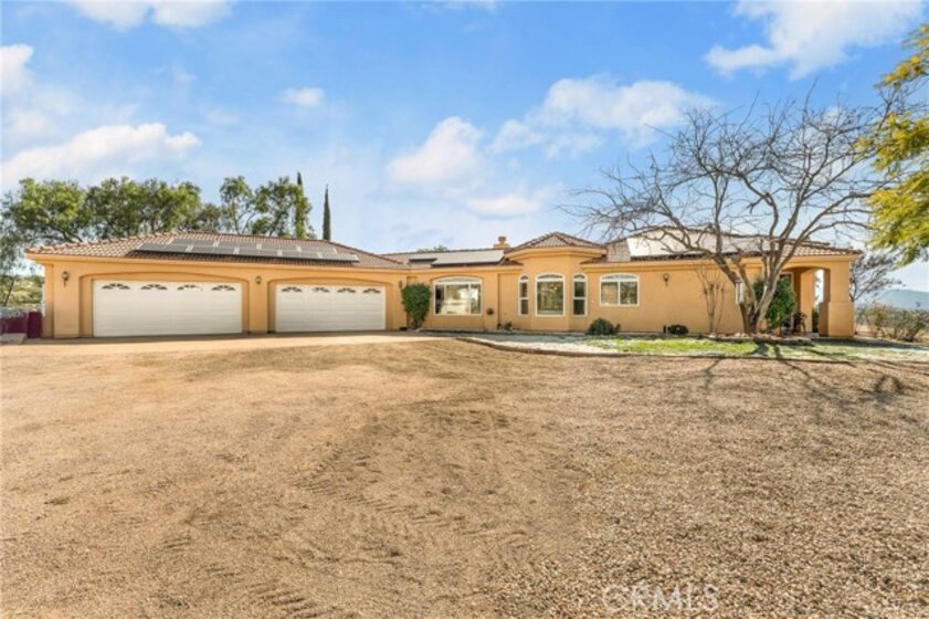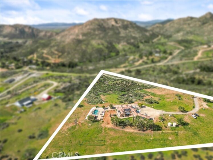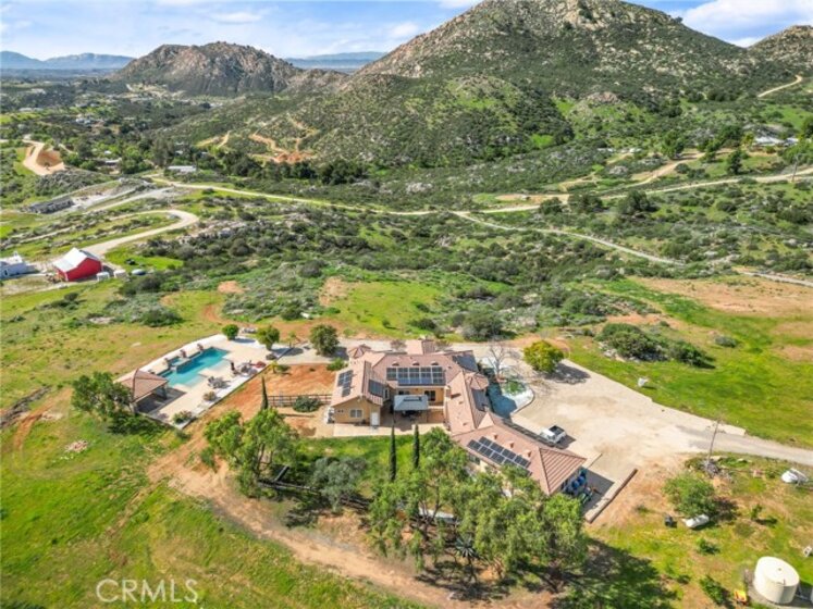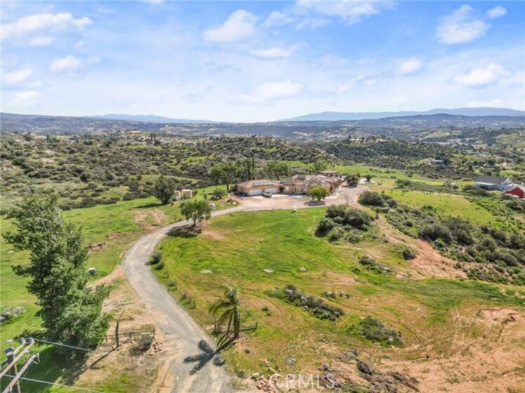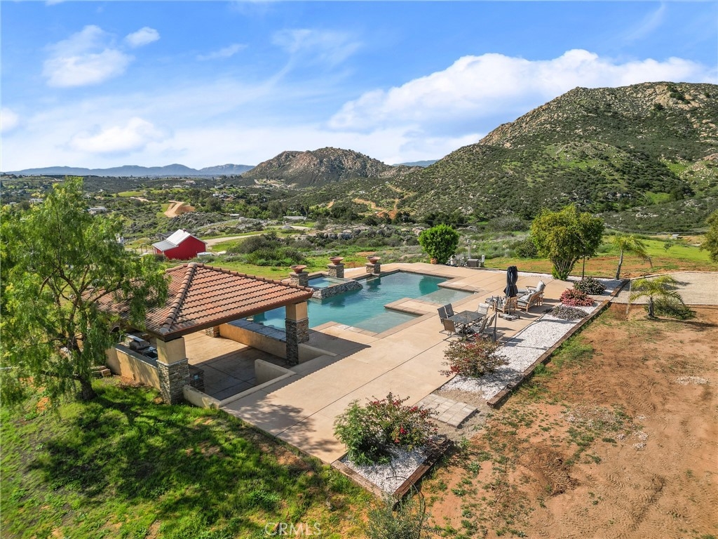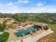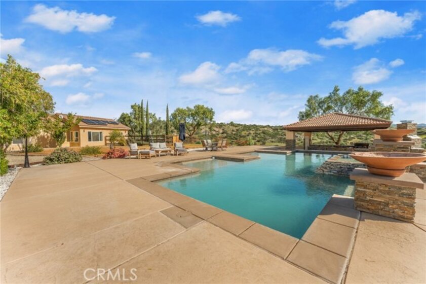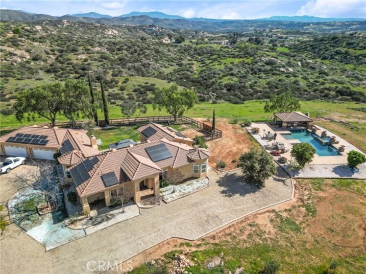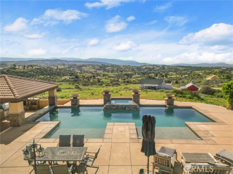 Experience serene country living in Temecula Wine Country at this stunning single-story ranch estate. Nestled within the Oakridge Ranches community, this custom-built home offers privacy, panoramic views, and refined indoor-outdoor living on nearly 10 acres of gently rolling hillside. Constructed to be view centric, each window and door is a portal to breathtaking valley and hillside views. Spanning 2,844 square feet, this thoughtfully designed residence features 4 spacious bedrooms and 2.5 bathrooms, with a functional single-level layout that unites the common areas and provides privacy for the bedroom wing. The kitchen is well appointed with stainless steel appliances, commercial range, double ovens, granite counter tops, and breakfast bar seating. Designed for unforgettable gatherings, the backyard is a true showpiece. The pool and attached pavilion are masterfully integrated into the natural hillside, creating an opulent resort-style experience while preserving the unobstructed panoramic views. At over 40’ long, the pool offers dual baja steps, expansive stained decking, and a raised spa with a cascading waterfall. A swim up bar is adjacent to the attached pavilion. Soaring ceilings with exposed roughhewn lumber shade the outdoor kitchen, fireplace, bar, and entertainment areas. This outstanding build out can accommodate nearly any gathering or simply serve as a restful retreat to enjoy the sunset from. A fire pit lounge and multiple outdoor seating areas complete this private retreat. Additional highlights include a 4-car attached garage with ample space for toys and storage, private well, solar power system, room for horses, and exceptional privacy. Blending natural terrain, a stately residence, staggering views, and an exceptional backyard pool build, this is one extraordinary offering.