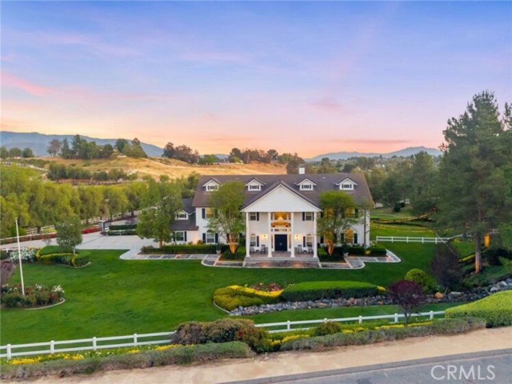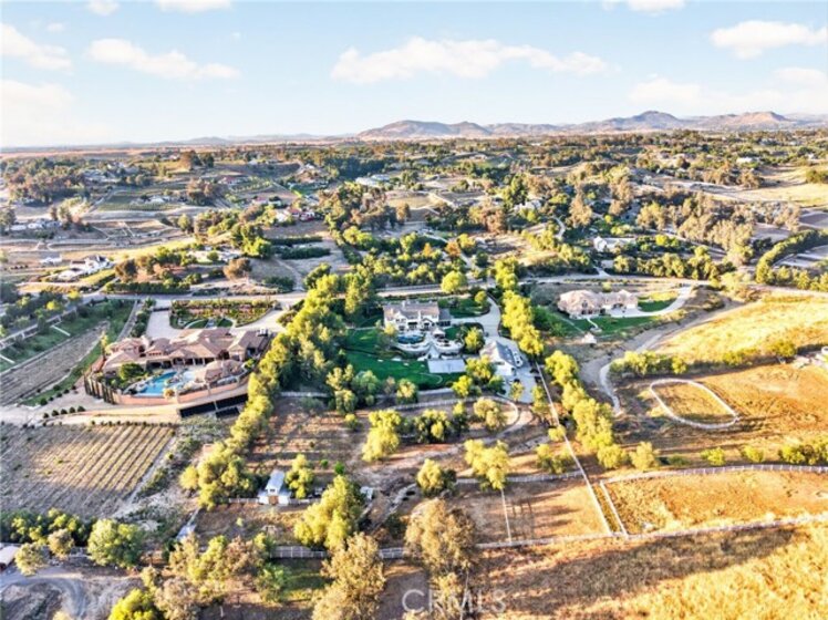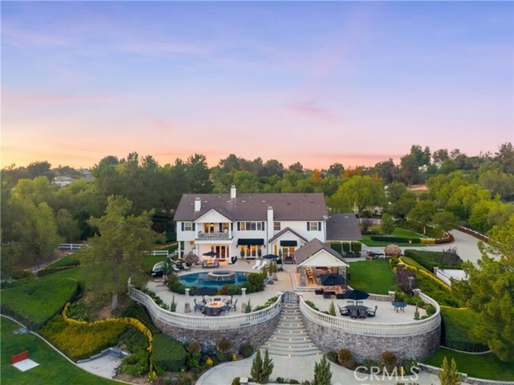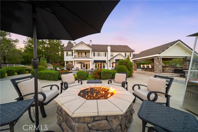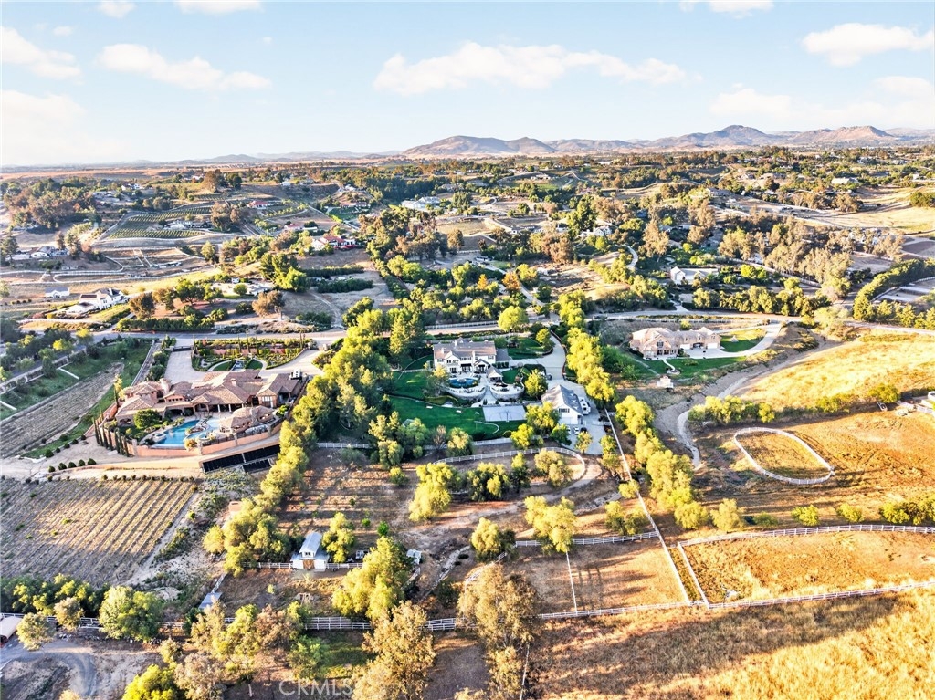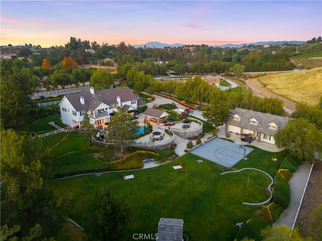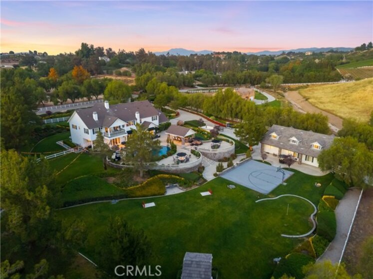 Experience refined country living in this extraordinary luxury estate in Temecula Wine Country, offering approximately 6,887 square feet of thoughtfully crafted living space on five usable acres. The estate features a main home and a guest home with the main home having six spacious bedrooms, including two on the main level, and five and a half bathrooms. The oversized kitchen impresses with a striking large granite island, Thermador double ovens, and a Sub-Zero refrigerator. Hardwood flooring enhances the main living areas, while a carpeted staircase leads to the second level, where hardwood floors continue alongside four additional bedrooms, three bathrooms, a laundry room, and a bonus movie room. Step outside to a true backyard retreat, complete with a resort-style pool and spa, outdoor kitchen, and beautifully landscaped patio. Dramatic, castle-inspired stairways lead to a basketball court, detached garage and pasture with barn and arena. A private ADU guest home sits above the garage, offering a versatile space ideal for guests, extended family, or potential rental income, with convenient RV parking nearby. The expansive, flat acreage also provides ample opportunity for equestrian use or additional outdoor amenities. This exceptional property offers a rare blend of luxury, privacy, and endless potential in one of Southern California’s most desirable settings. For added convenience, RV parking with a dedicated plug is located adjacent to the ADU. This 6 bedroom home is located in Country Road Estates which consists of 128 - 5 acre parcels just on the edge of Temecula Wine Country. The location is super convenient to town and centrally located to some of the best schools Temecula has to offer. Neighboring homes features large acreages, groves and vineyards. Just minutes from highly desirable Linfield Private School and Saint Jeanne De Lestonnac.