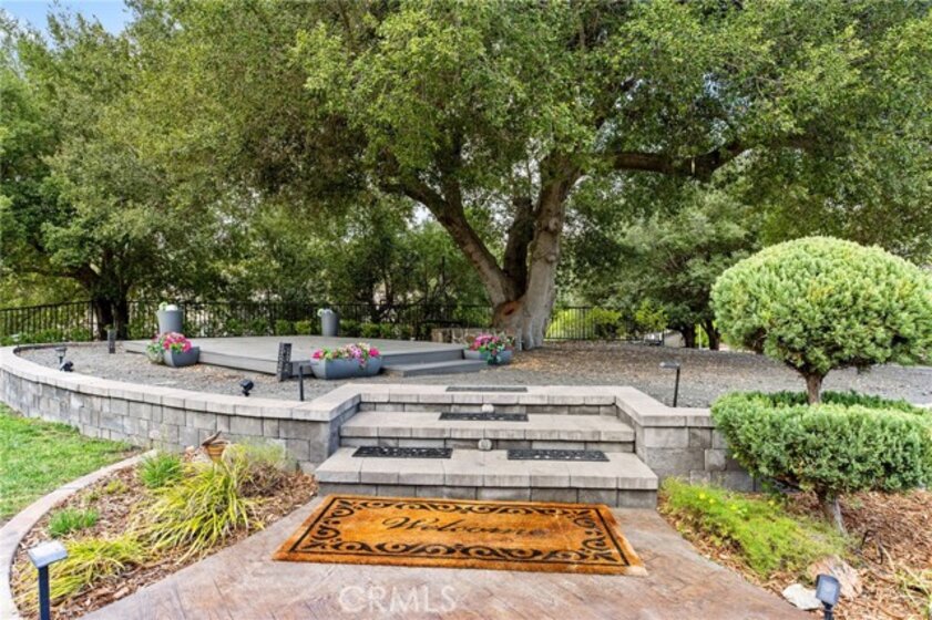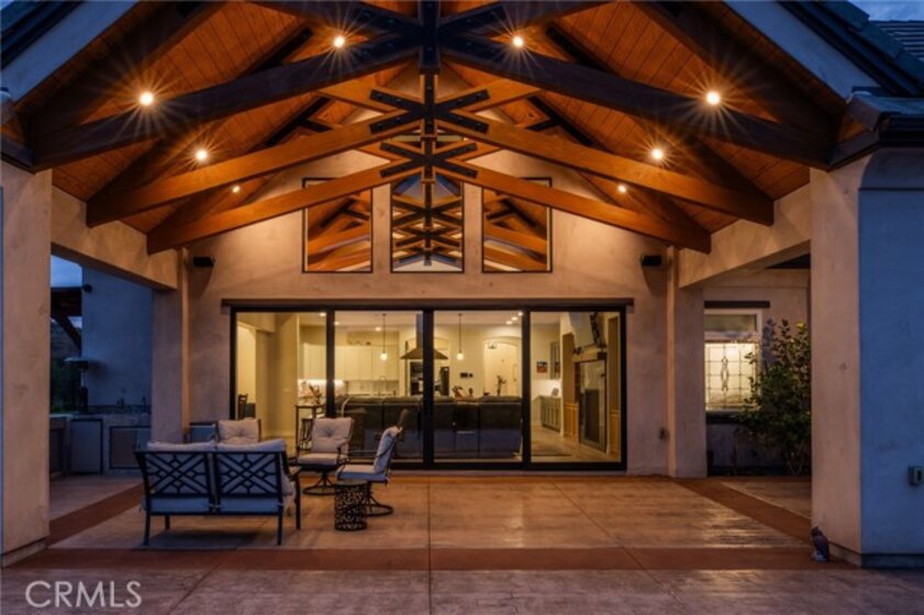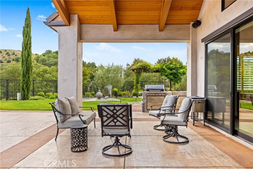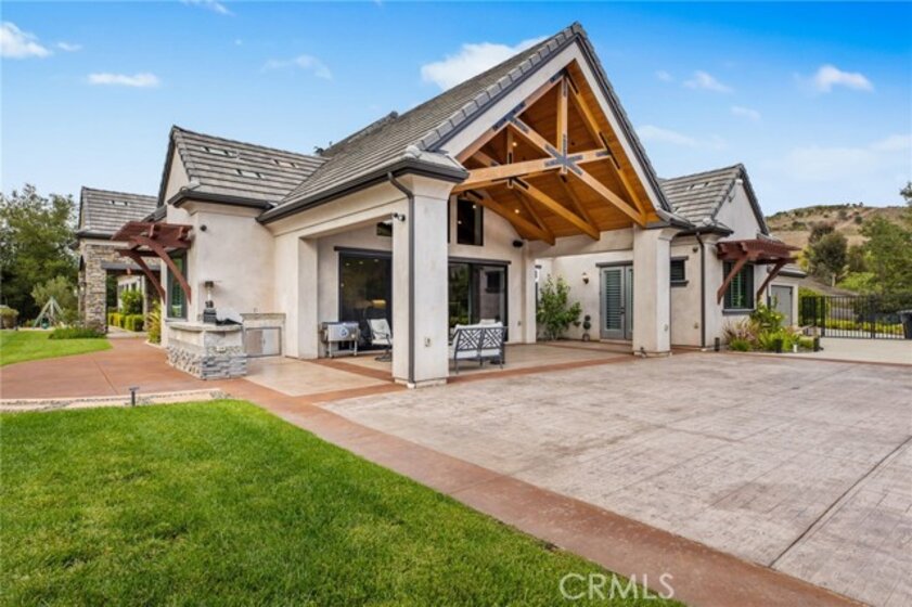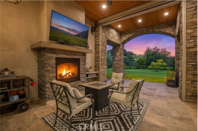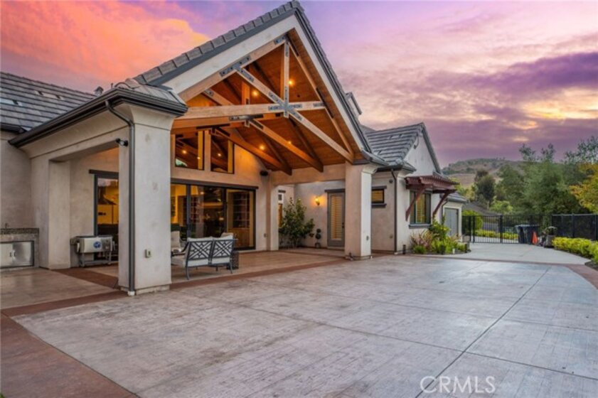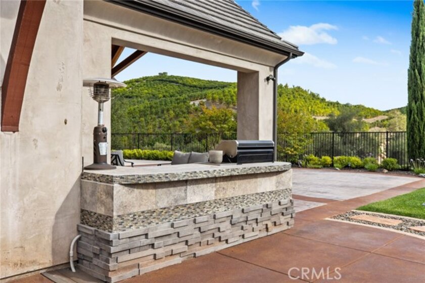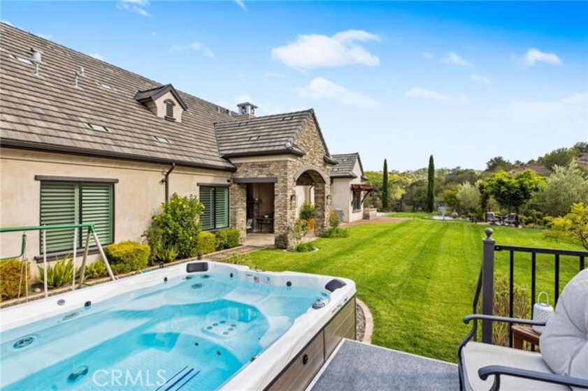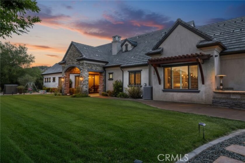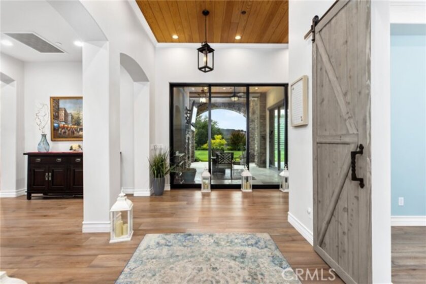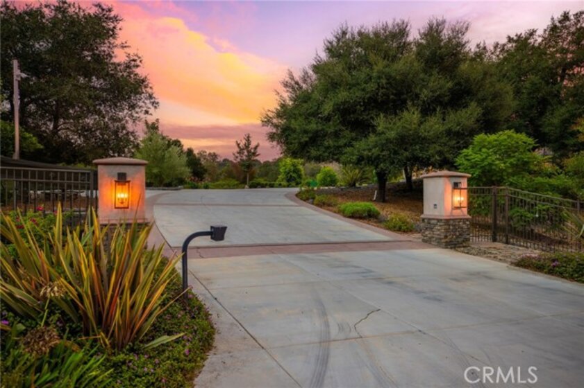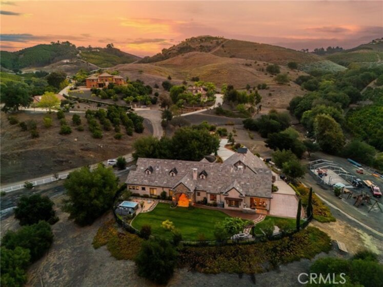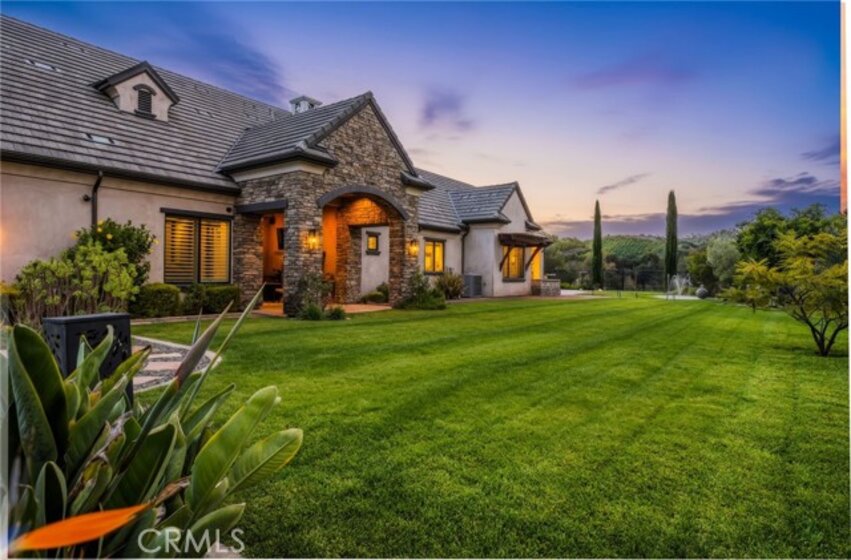 Exquisite single-story estate nestled in Temecula’s prestigious De Luz community—a rare blend of sophistication, functionality, and serene country luxury just minutes from town. Nearly 4 acres of usable land, this 4,280 sq ft custom home is framed by 360-degree panoramic views offering total privacy and timeless elegance from every angle. From the moment you arrive through the private gated entrance and long scenic driveway, the property commands attention with modern architecture, lush landscaping, and grand covered entry accented by custom double doors. Inside, the home opens to a soaring foyer and expansive great room highlighted by exposed wood-beam ceilings, cantina-style doors, and California room with multi-panel sliding doors and grand stone fireplace—perfectly designed for seamless indoor-outdoor entertaining. The chef’s kitchen is a true masterpiece, featuring an oversized island with seating for up to 10 comfortably, top-of-the-line appliances, walk-in pantry, and additional prep kitchen—ideal for hosting at scale. Flowing effortlessly into the family room and outdoor spaces, every detail was thoughtfully curated for comfort and connection. The primary suite is a luxurious retreat- offering direct patio access, two walk-in closets with custom cabinetry, and spa-inspired bathroom featuring oversized walk-in shower with dual shower heads and soaking tub positioned beneath an artisan stained-glass window. 4 additional bedrooms are generously sized, including a guest suite with a private entrance and patio, and another with its own wet bar—easily converted into a kitchenette. Spacious executive office with double-door access and views of the mature oak tree completes the thoughtful layout. Outdoors, the estate was custom-built for entertaining and relaxation. Enjoy expansive stamped-concrete patios, outdoor kitchen, splash pad, and oversized swim spa—all surrounded by lush landscaping and breathtaking views. The property also features a newly constructed (2025) 48’×24’ barn-14’ sliding door, picture window, and passenger door - with lower-gate private access—perfect for storage, hobbies, or future customization. Additional highlights include a 3-car garage with epoxy floors, built-in cabinetry, pull-down storage, and utility sink, a large designer laundry room, and a custom walking labyrinth surrounded by fruit trees and scenic garden paths. Every element of this estate was intentionally crafted for the ultimate Temecula, De Luz lifestyle.