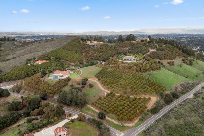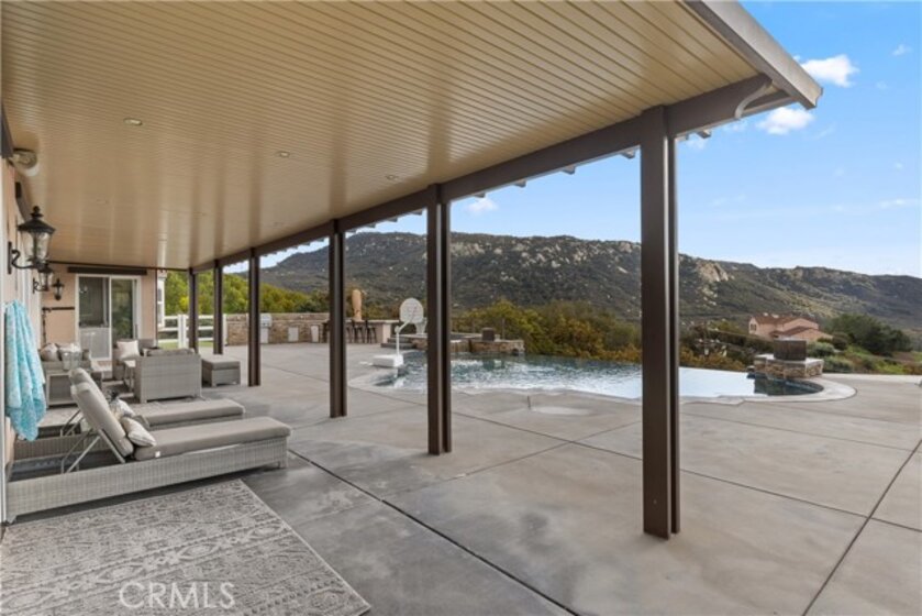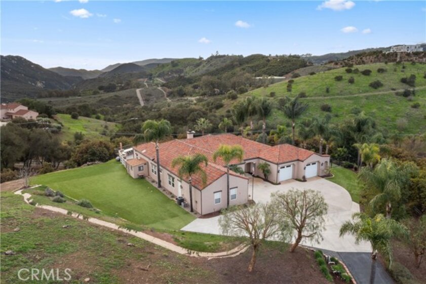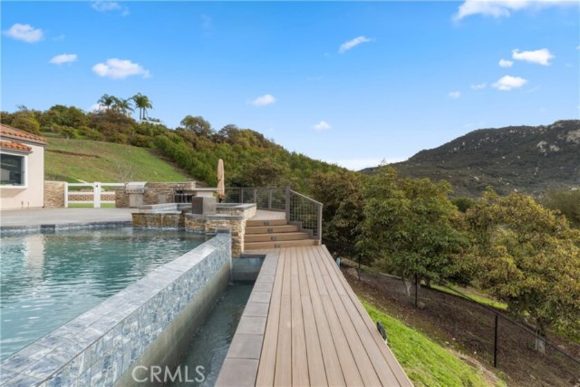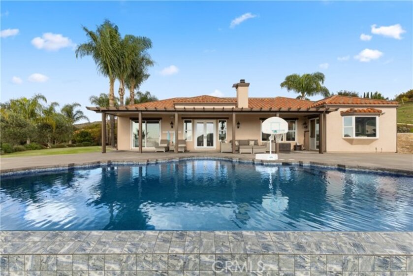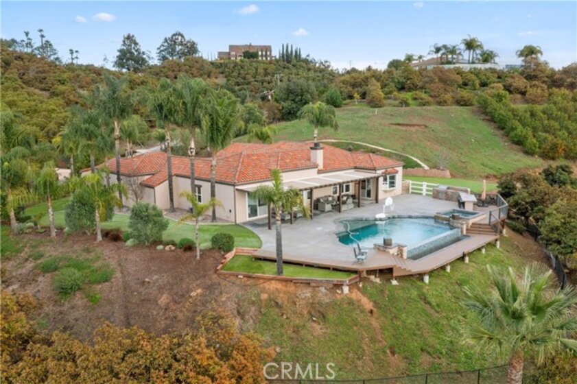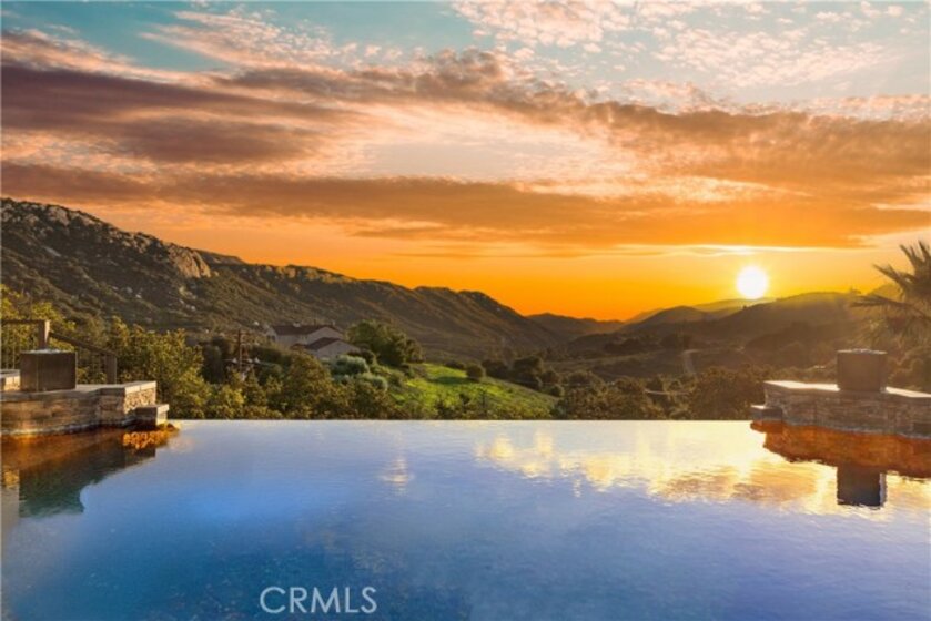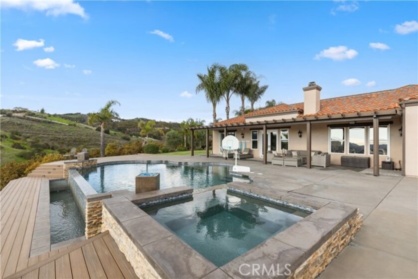 Incredible canyon and sunset views set the stage for this luxury De Luz estate pool home, perched at the end of a private cul-de-sac on over 4.55 acres of productive orchard land overlooking the protected Santa Margarita Preserve. This 4-bedroom, 3.5-bath, 3,272 sq ft residence offers the perfect blend of privacy, elegance, and resort-style living, complete with a breathtaking saltwater infinity-edge pool and spa framed by sweeping hillside vistas. A palm-lined paved driveway leads to a charming courtyard and oversized leaded double doors opening to a light-filled, open floor plan designed for entertaining. Interior features include new interior paint, crown molding, smooth hand-textured walls, graded baseboards, ceiling fans, exterior electric window shades, and carpeted bedrooms. Formal living and dining rooms flow into a welcoming family room with fireplace and a gourmet kitchen featuring a six-burner Viking stove, double KitchenAid ovens, quartz countertops, Bosch dishwasher, walk-in pantry, built-in buffet with wine refrigerator, breakfast bar, and eat-in dining area. The primary suite is a private retreat offering a walk-in closet, spa-style bath with dual sinks, vanity, jetted tub, walk-in shower, and a private office located just off the suite. Two guest bedrooms share a Jack-and-Jill bathroom with dual sinks, providing comfort and functionality. Outdoor living is exceptional with a custom deck surrounding the infinity pool and spa, an Alumawood-covered patio, built-in BBQ, two blue bowl fire pits, outdoor refrigerator, and expansive entertaining spaces ideal for enjoying unforgettable sunsets. The property includes over 200 avocado trees and more than 340 tangerine trees, along with fig, lemon, lime, pomegranate, Asian pear, and olive trees. Additional features include RV parking, room for an ADU, custom chicken coop with run, whole-house fan, dedicated laundry room, ample storage, and a charming half bath with custom wine barrel sink. Located just minutes from Old Town Temecula, wine country, golf, dining, and Pechanga Resort & Casino. Unincorporated Riverside County offers lower tax rates and the option for Temecula or Murrieta schools. A rare opportunity to own a true luxury orchard estate with views, privacy, and lifestyle.