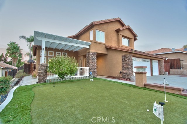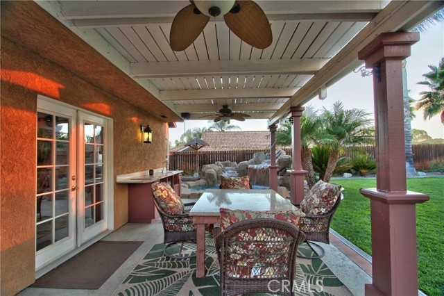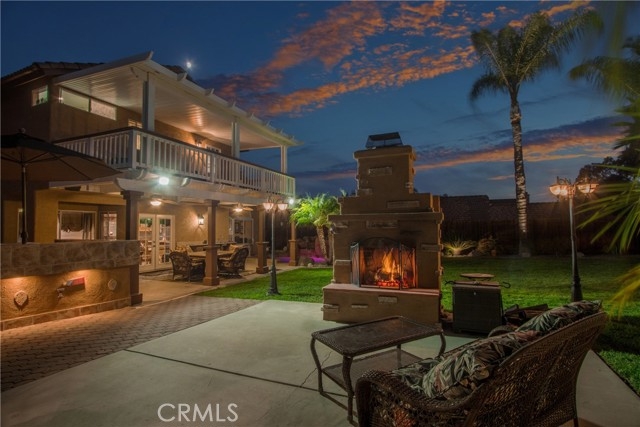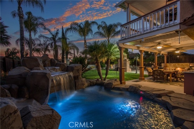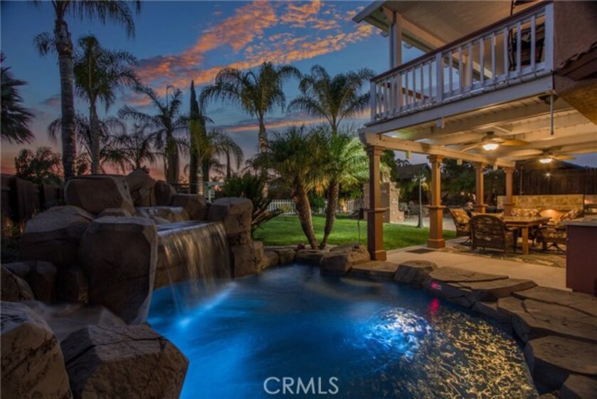 Want to entertain without breaking the bank? You have found your perfect match! You will not find another backyard like this. The large lagoon style saltwater spool is six feet deep and features an incredible waterfall, led color changing lighting and the ability to control it all from your smartphone. The spacious backyard has a wood burning fireplace, huge custom built in water fountain, and outdoor kitchen with bbq and fridge. There's also a full width patio cover/deck with ceiling fans. Enjoy free electricity with a HUGE PREPAID SOLAR SYSTEM covered for the next 13 years. There's even a new AC system, whole house water filtration and softener, and a fully redone roof. Inside you will find gorgeous luxury vinyl plank flooring with new carpet. The kitchen has granite counter tops and newer high end KitchenAid appliances. All of the bathrooms have been beautifully upgraded. 3 car garage provides plenty of storage. Low taxes, no HOA and close to the Promenade Mall, top rated schools, golf courses, and freeways. Come see this one fast!
