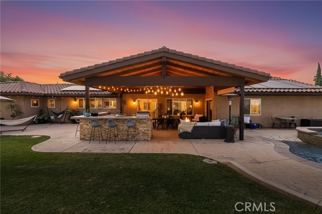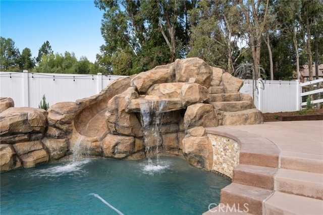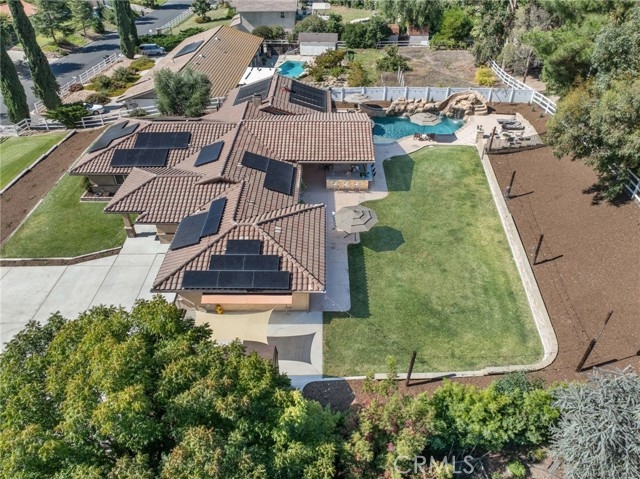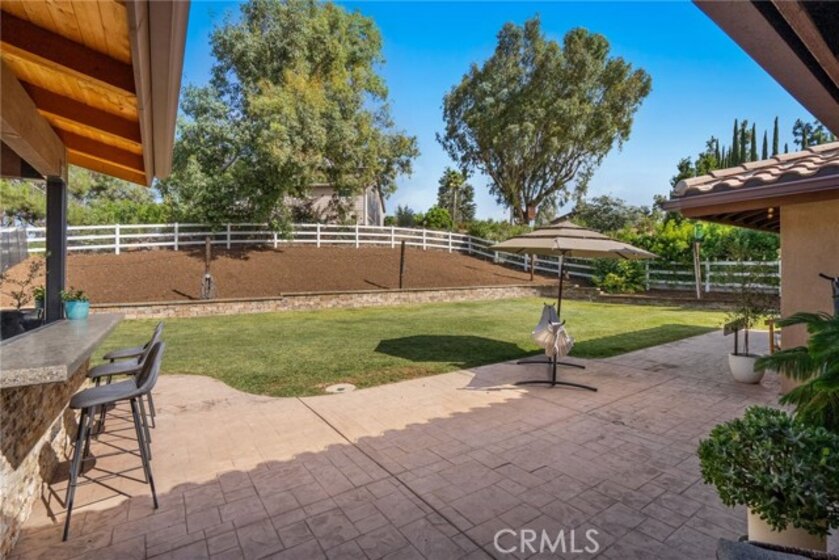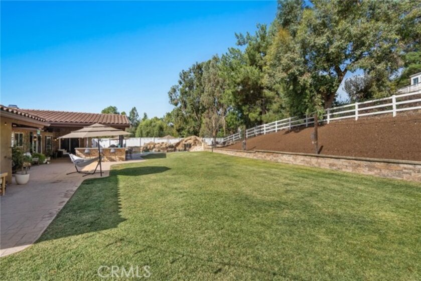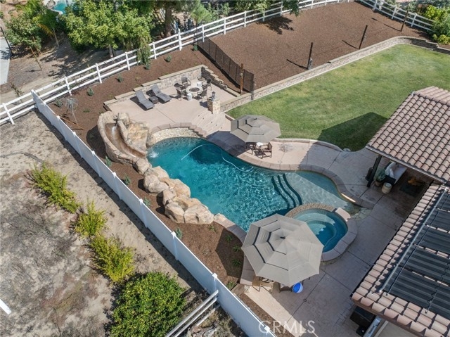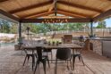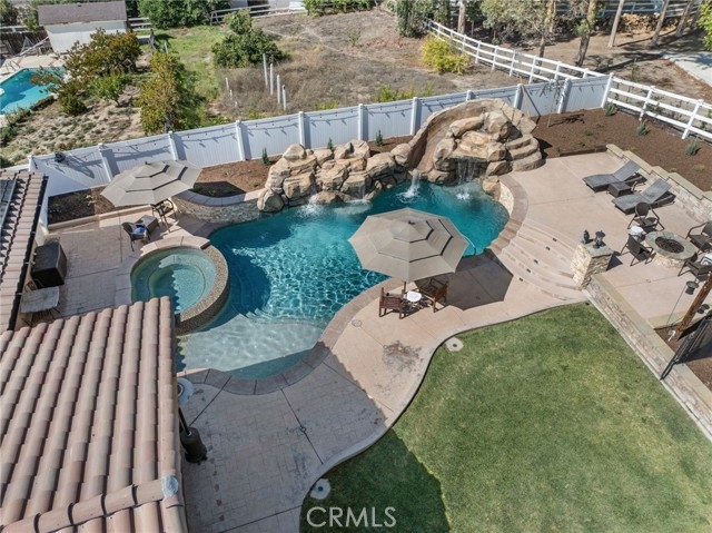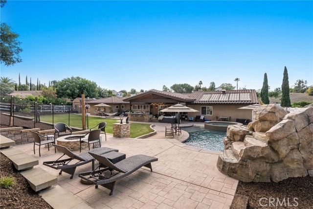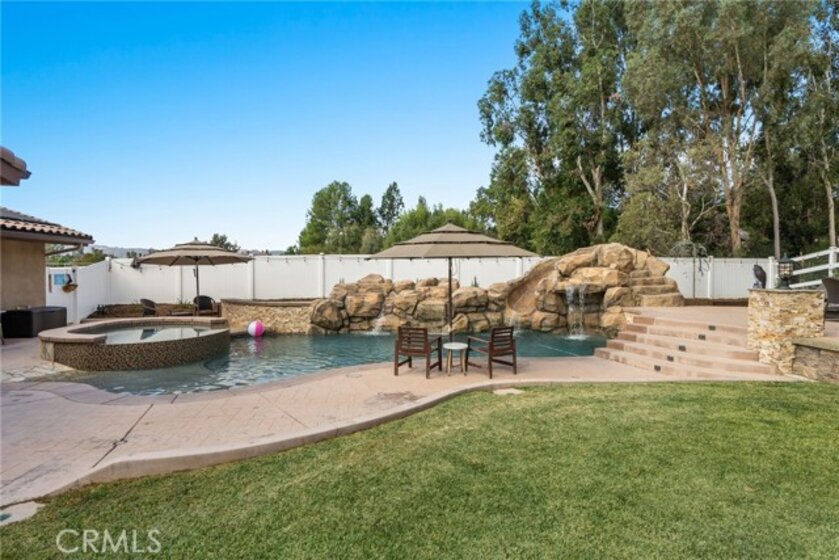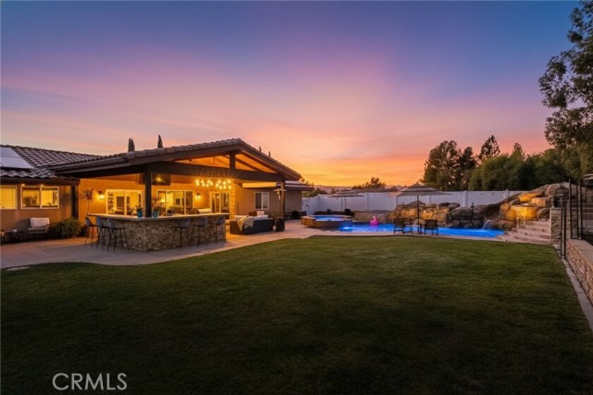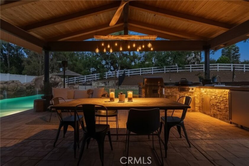 Meadowview – Refined living and outsized entertaining opportunities come together in this Meadowview residence. Sited on an elevated lot spanning just over ½ acre, this 2,875 square foot home has been thoughtfully upgraded throughout. The quintessential chef’s kitchen anchors the living space, combining vintage character with modern convenience. Expansive granite countertops and an oversized island offer generous preparation and gathering space, complemented by custom cabinetry and premium stainless-steel appliances, including a professional-grade cooktop. An elegant apron-front copper sink and bronze fixtures enhance the presentation, while the warm engineered wood flooring seamlessly flows into the adjacent open living and dining spaces. Vaulted ceilings with exposed beams and abundant natural light create an inviting, airy atmosphere throughout the common areas. At approximately 750 square feet, the primary suite maintains the design theme of the home with vaulted ceilings, multiple windows and slider access to the backyard, all anchored by a dual sided fireplace with a stacked stone fireplace surround. The ensuite bathroom is a spa-like escape with marble finishes, a freestanding claw foot tub, and walk-in shower. The interior of this home impresses, and the outside is no different. The focal point of the outdoor gathering space is the robust pavilion. Hulking beams, inlaid wood ceiling treatment, and artisan lighting set the tone for the backyard space. Under the shade of the pavilion is a full outdoor kitchen: Evo cooktop, Coyote smoker/grill, Beer Meister, and sink. The stamped and stained concrete makes its way to the exceptional pool and spa. A beach entrance, pebbletec finish, raised spa, water slide, grotto, and multiple waterfalls all come together to create this extraordinary aquatic retreat. Additional value add items include the paid solar power system, RV parking, new paint throughout the interior of the home, completely landscaped grounds, a gated driveway entry, and meadow (nature/trail system) access at the end of the cul de sac. Residents of the Meadowview community enjoy a robust list of amenities including hiking and riding trails, equestrian amenities, pools, and a clubhouse. Homes with this much to offer are seldom available in this community; take a look today.