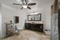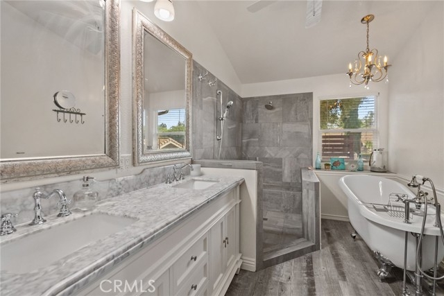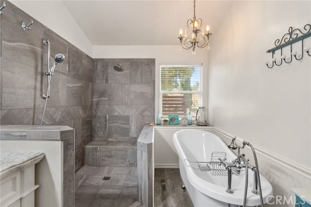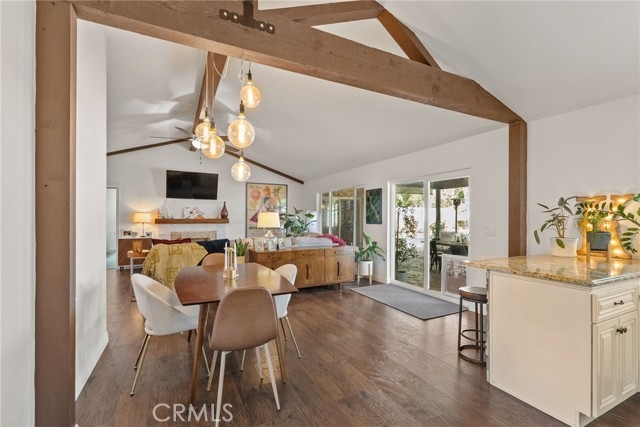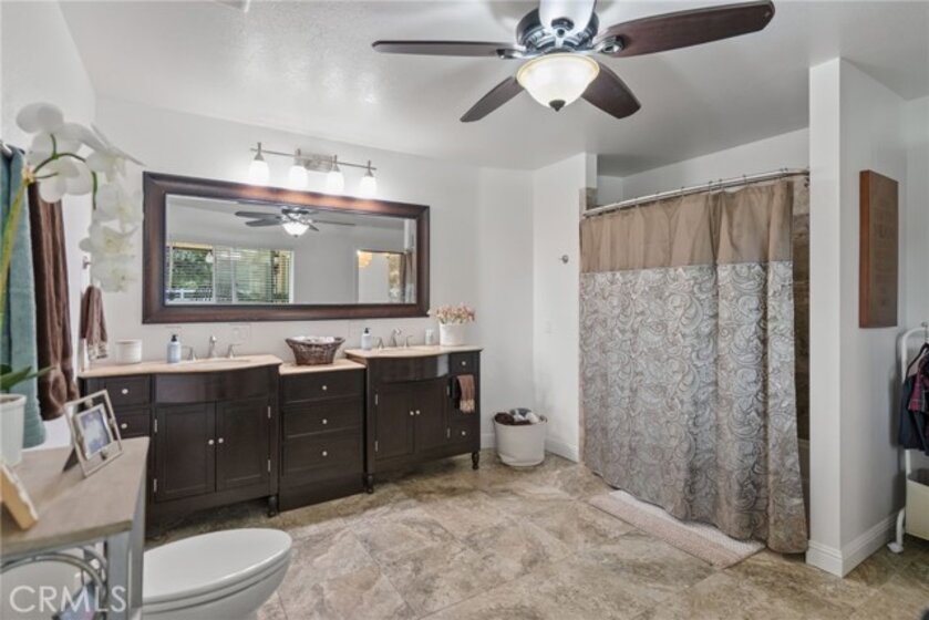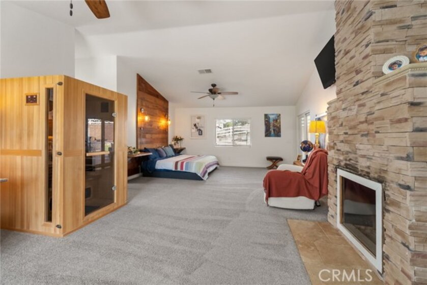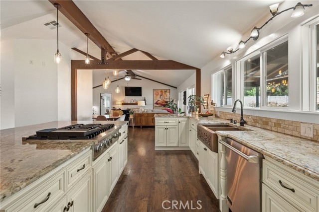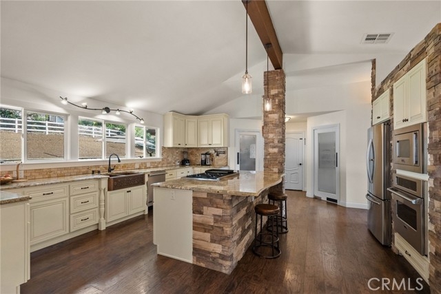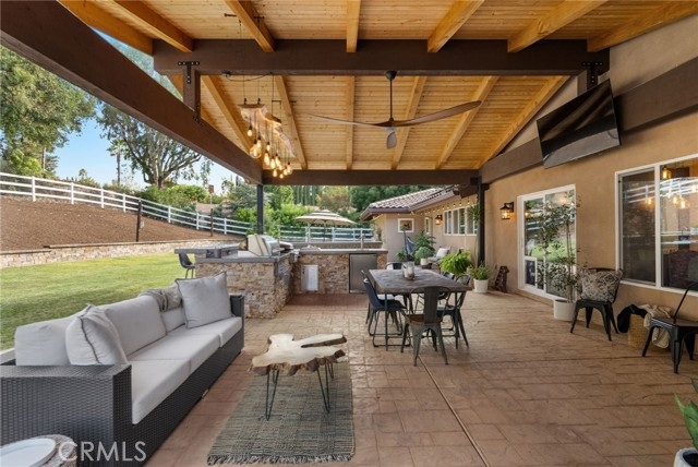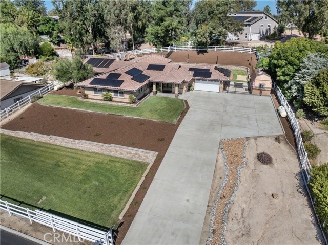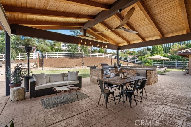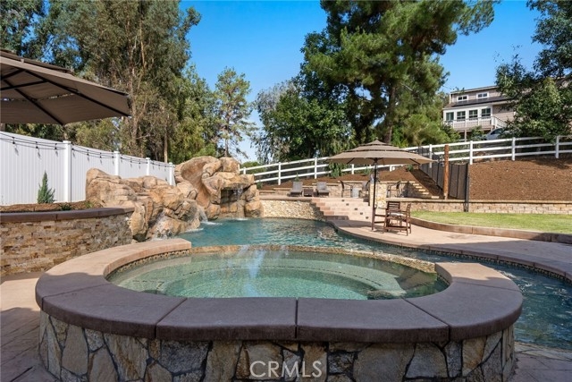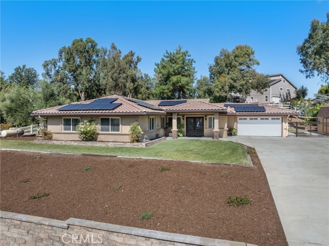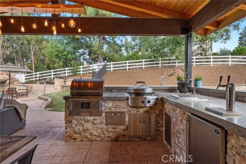 Meadowview – Refined living and outsized entertaining opportunities come together in this Meadowview residence. Sited on an elevated lot spanning just over ½ acre, this 2,875 square foot home has been thoughtfully upgraded throughout. The quintessential chef’s kitchen anchors the living space, combining vintage character with modern convenience. Expansive granite countertops and an oversized island offer generous preparation and gathering space, complemented by custom cabinetry and premium stainless-steel appliances, including a professional-grade cooktop. An elegant apron-front copper sink and bronze fixtures enhance the presentation, while the warm engineered wood flooring seamlessly flows into the adjacent open living and dining spaces. Vaulted ceilings with exposed beams and abundant natural light create an inviting, airy atmosphere throughout the common areas. At approximately 750 square feet, the primary suite maintains the design theme of the home with vaulted ceilings, multiple windows and slider access to the backyard, all anchored by a dual sided fireplace with a stacked stone fireplace surround. The ensuite bathroom is a spa-like escape with marble finishes, a freestanding claw foot tub, and walk-in shower. The interior of this home impresses, and the outside is no different. The focal point of the outdoor gathering space is the robust pavilion. Hulking beams, inlaid wood ceiling treatment, and artisan lighting set the tone for the backyard space. Under the shade of the pavilion is a full outdoor kitchen: Evo cooktop, Coyote smoker/grill, Beer Meister, and sink. The stamped and stained concrete makes its way to the exceptional pool and spa. A beach entrance, pebbletec finish, raised spa, water slide, grotto, and multiple waterfalls all come together to create this extraordinary aquatic retreat. Additional value add items include the paid solar power system, RV parking, new paint throughout the interior of the home, completely landscaped grounds, a gated driveway entry, and meadow (nature/trail system) access at the end of the cul de sac. Residents of the Meadowview community enjoy a robust list of amenities including hiking and riding trails, equestrian amenities, pools, and a clubhouse. Homes with this much to offer are seldom available in this community; take a look today.
