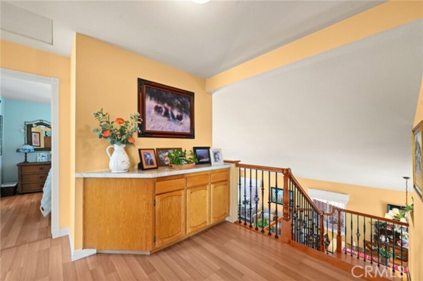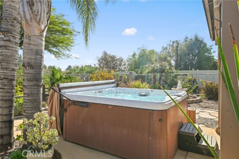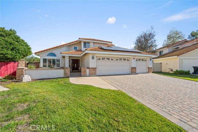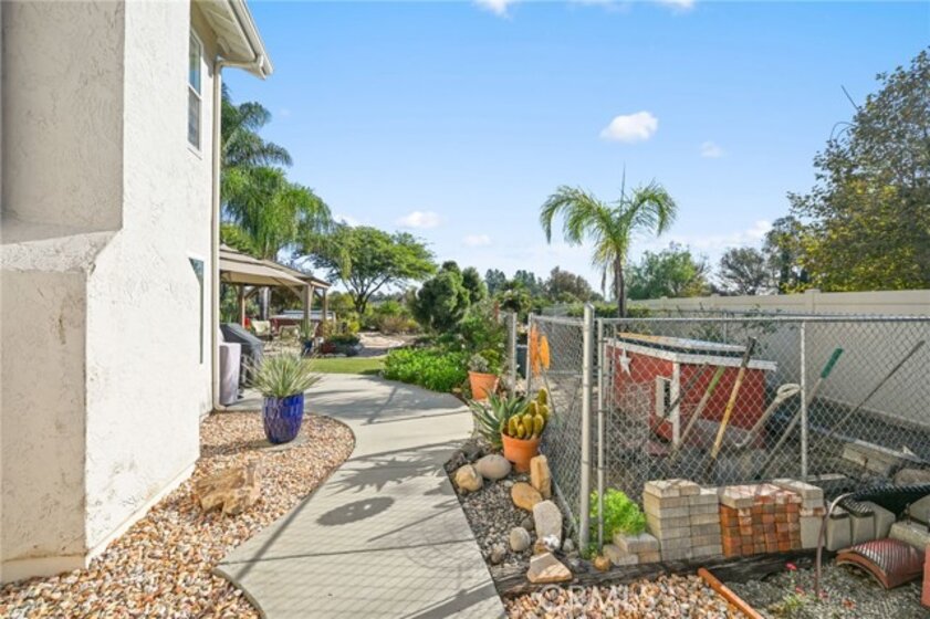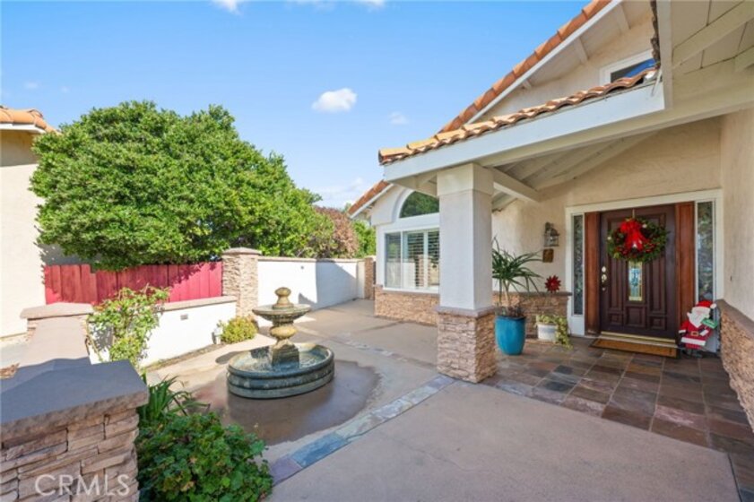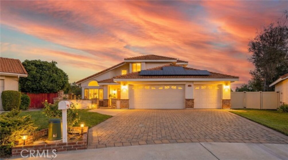 Welcome to this beautifully upgraded cul-de-sac home offering exceptional finishes and thoughtful details throughout. A gorgeous custom hardwood maple staircase with wrought-iron balusters elevates the entry, while dual-pane windows with custom window coverings—including shutters and blackout shades—provide comfort and style. The gourmet kitchen features stunning natural stone quartzite countertops, a marble tile backsplash, a new stainless steel sink and microwave, custom pull-out drawers in the lower cabinets, soft-close doors, and a spacious walk-in pantry. The convenient downstairs bedroom is perfect for guests, and the downstairs bathroom is elegantly finished with a natural stone quartzite countertop. Durable LVP flooring flows throughout the first level. Upstairs, the primary bathroom offers new cabinetry, a sleek quartz countertop, new double sinks & light fixtures and a tiled shower. The Jack & Jill bathroom features a vanity with a marble countertop, tile floor and barn door. The upstairs living areas are complemented by uniform 3M laminate flooring. Stepping outside, the inviting front courtyard features a peaceful fountain and wrought-iron gate, creating a charming outdoor retreat. The oversized backyard is an entertainer’s dream, showcasing two Yardistry wooden gazebos, a custom stone propane CalFlame fireplace, and a 2017 CalSpa. Additional outdoor highlights include vinyl privacy fencing, a dedicated dog run with a custom dog condo, and four large raised garden beds for gardening enthusiasts. Energy efficiency is enhanced by owned solar, offering long-term utility savings. This home is truly one-of-a-kind—move-in ready, meticulously upgraded, and perfectly situated on a quiet cul-de-sac.