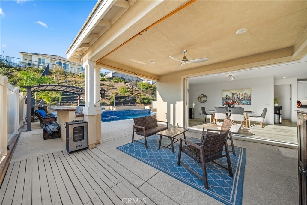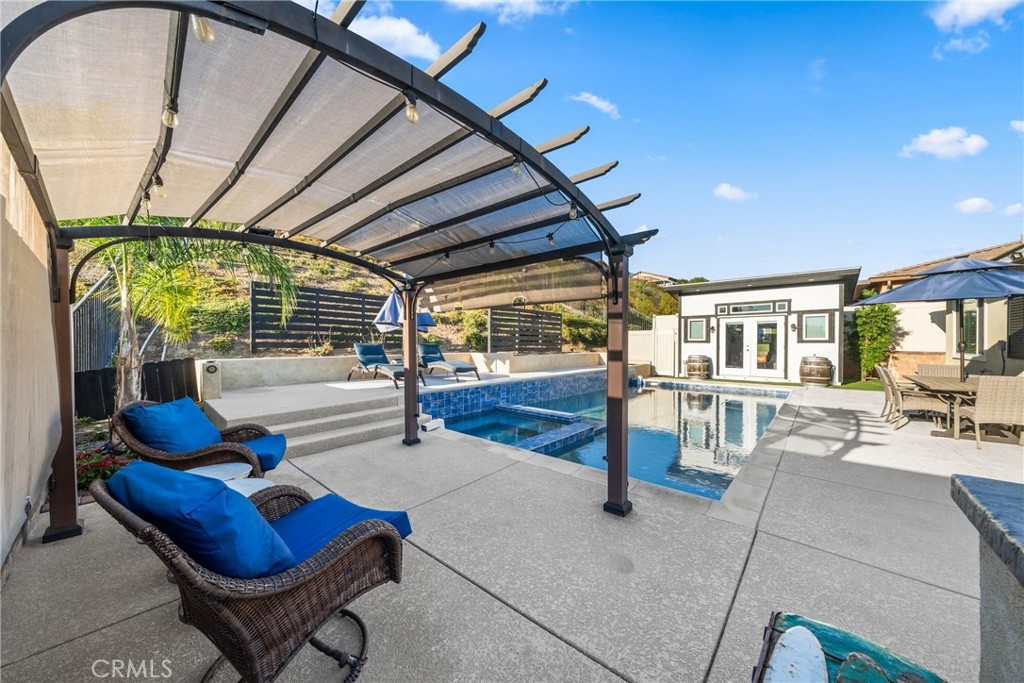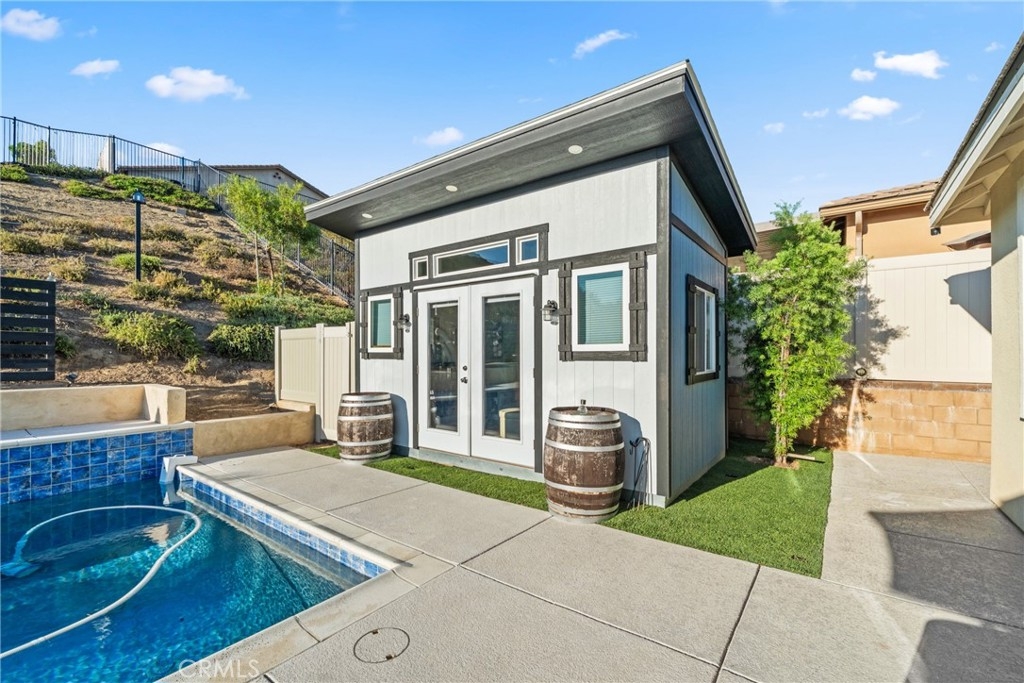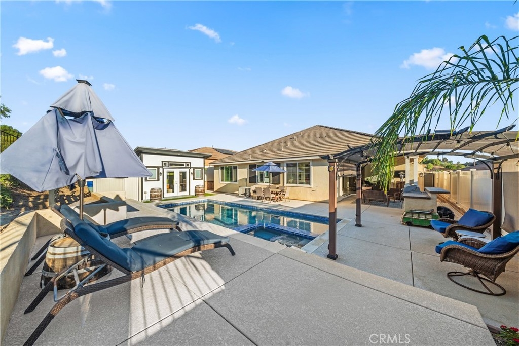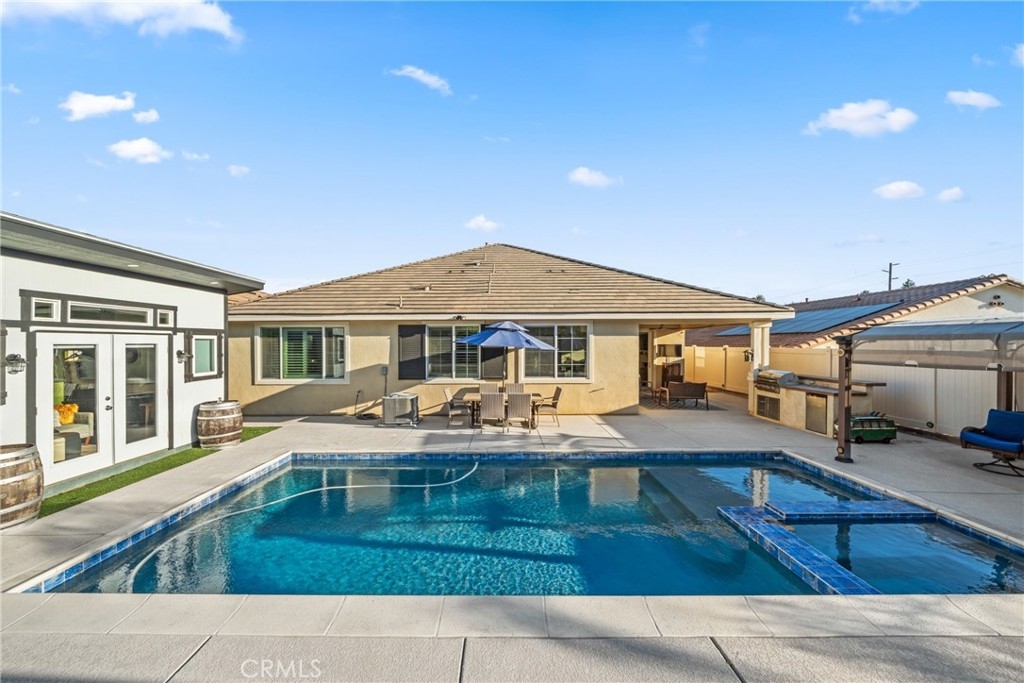 POOL HOME tucked inside the exclusive gated community of Nicolas Heights in the heart of Temecula. This beautifully designed 4-bedroom, 4-bathroom home spans 2,500 square feet and effortlessly blends high-end style with everyday comfort. Every detail has been carefully thought out to give the space a polished yet welcoming feel. The open-concept floor plan is perfect for both quiet evenings at home and lively gatherings. The spacious dining room is ready to host your holiday dinners or casual weekend brunches. In the kitchen, you'll find a chef’s dream setup with a large quartz island, stainless steel appliances—all opening to the living area where oversized pocket sliding glass doors open the interior to the California patio room. Out back, you will find an added room currently used as an office but would make a great pool house or guest room. The covered patio is made for relaxing or entertaining, offering that seamless indoor-outdoor lifestyle Southern California is known for. Whether you're sipping your morning coffee or enjoying an evening glass of wine, this backyard setup is the perfect spot. The primary suite is its own little retreat—plenty of space, a large walk-in closet, and a spa-like bathroom with a soaking tub and separate shower. You’ll also enjoy practical touches throughout the home like an indoor laundry room with tons of storage. Plus, with leased solar panels, you can feel good about energy efficiency too. And let’s not forget the unbeatable Temecula location. From award-winning wineries and charming Old Town to hiking trails, golf courses, parks, and hot air balloon rides, the local lifestyle is all about enjoying the best of Southern California. If you’re looking for luxury, comfort, and a community that feels like home—this is it. Welcome to Mulberry Ct. You’re going to love it here.**Solar on Lease to be transferred to Buyer.