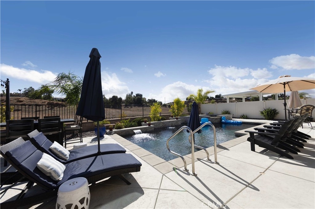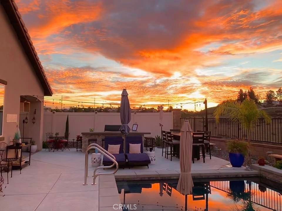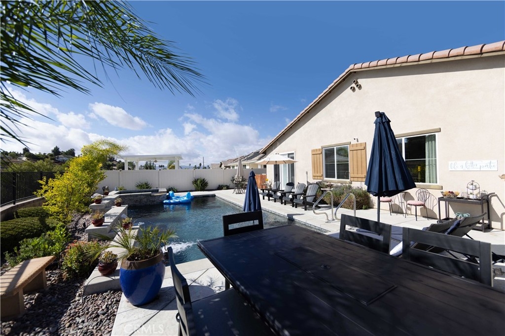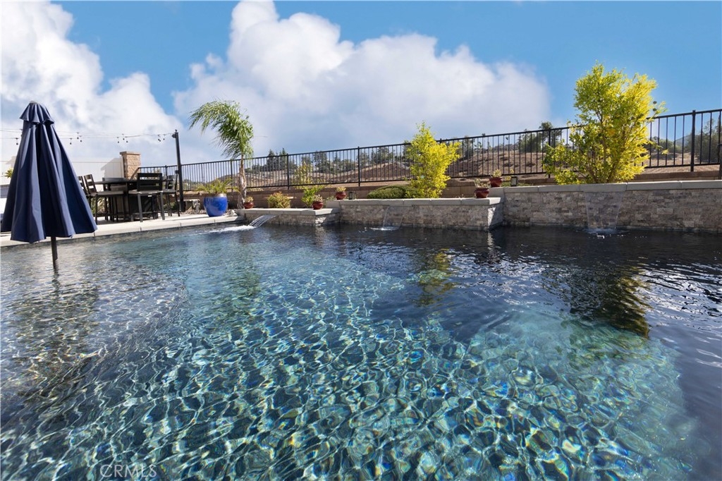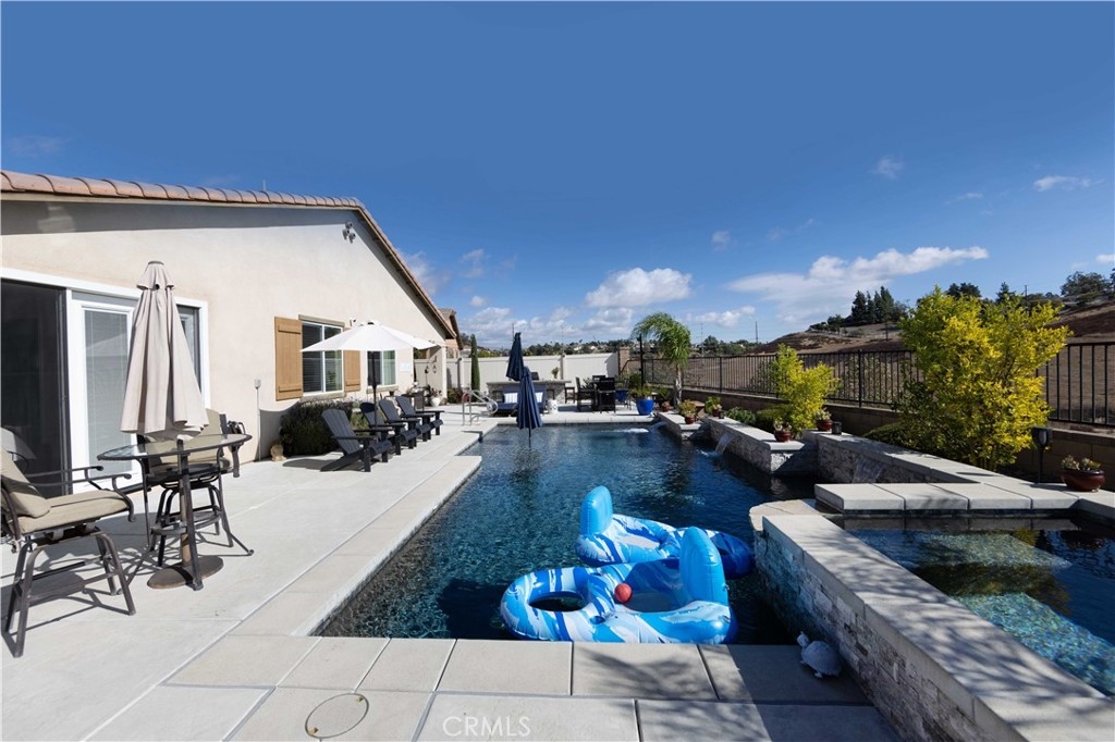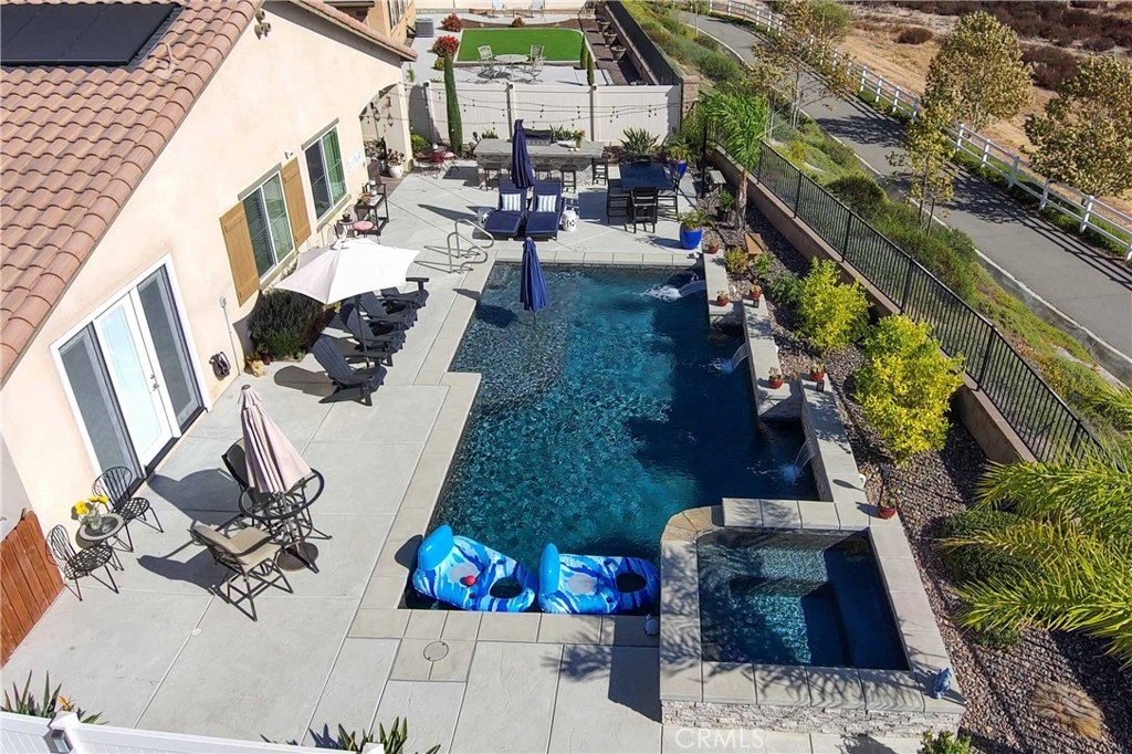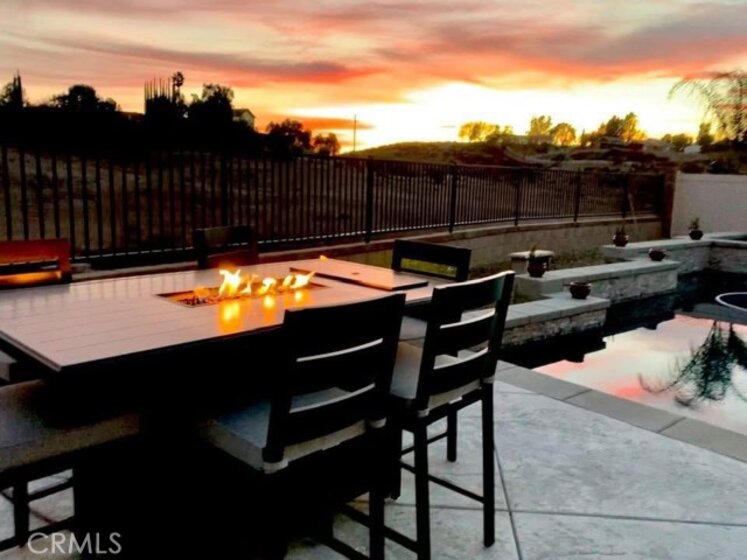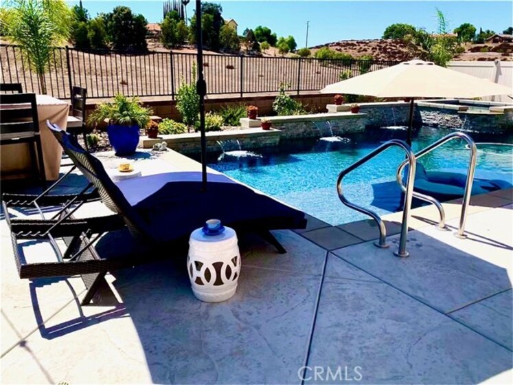 Exceptional luxury single-story residence in the highly sought-after gated Nicolas Heights community. Situated on a premium lot with scenic backyard views and enhanced privacy, this beautifully upgraded home features an open floor plan with crown molding and wood-look tile flooring throughout. Designed for indoor-outdoor living and effortless entertaining, corner sliding doors disappear into the walls, opening to a resort-style backyard oasis with a covered California room, professionally maintained pool and spa with Baja shelf, outdoor kitchen, and gas fire table. The chef’s kitchen offers a large center island, double ovens, custom quartz countertops, white cabinetry with new pull-out shelving, glass backsplash, spacious pantry, and high-end stainless steel appliances. The primary suite features a private en-suite bath and custom walk-in closet. A guest suite with en-suite bath and walk-in closet provides ideal privacy, while two additional bedrooms share a full bath with double vanity. Additional highlights include a three-car garage with built-in storage, indoor laundry with cabinetry, leased solar, tankless water heater, and smart-home technology with Ring security. Residents enjoy community amenities including a splash-pad park, dual gated entrances, and pedestrian access. Ideally located near Temecula’s award-winning wineries, Old Town, shopping, dining, and top-rated schools.