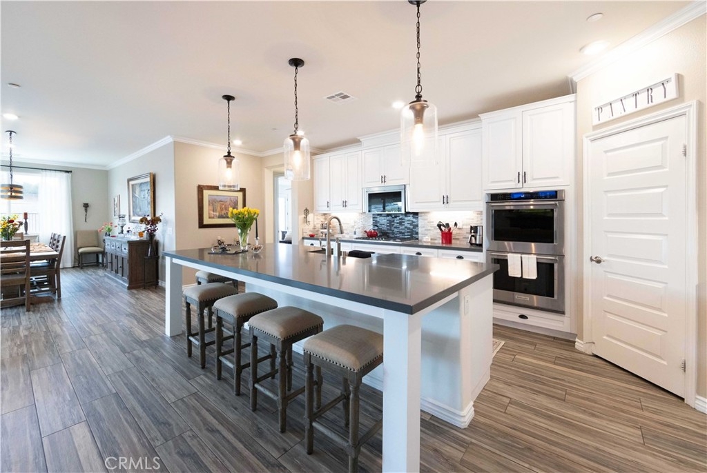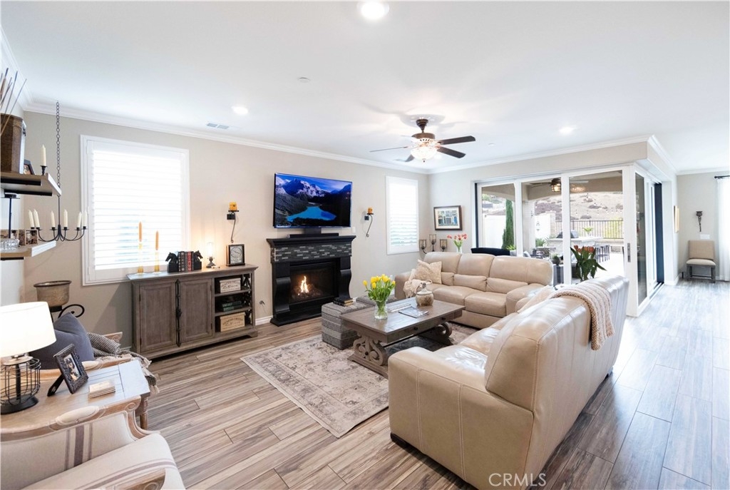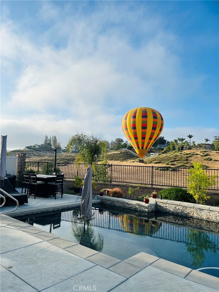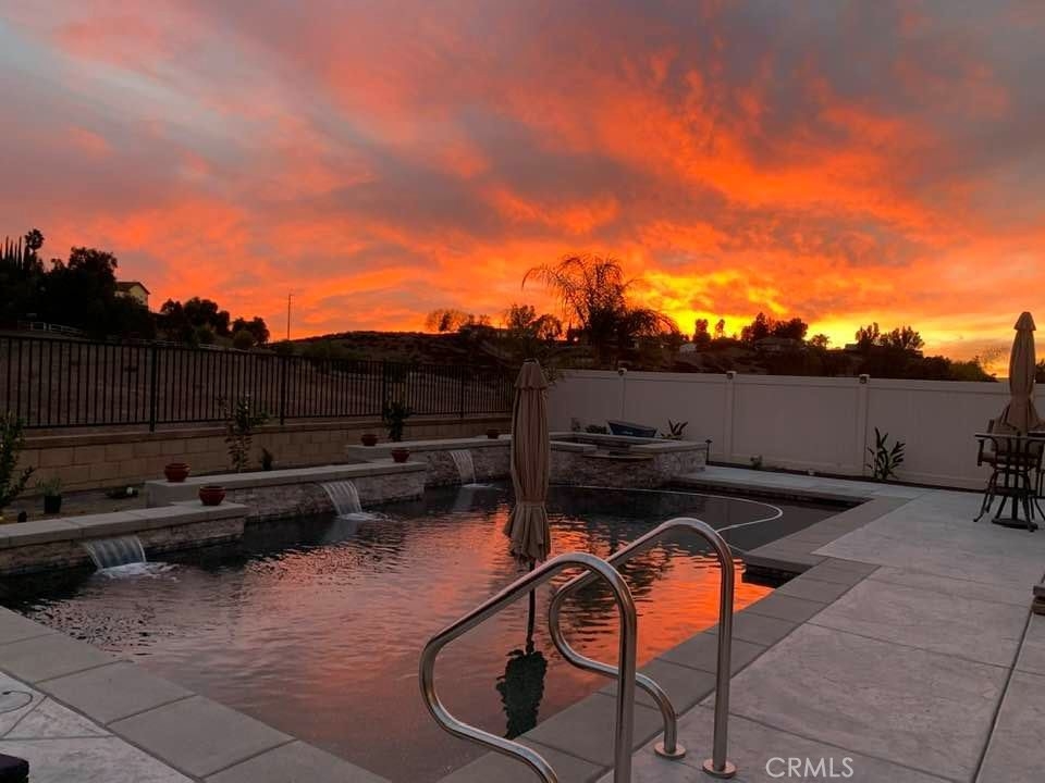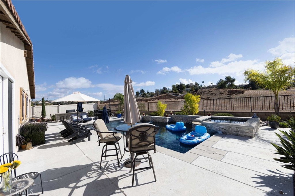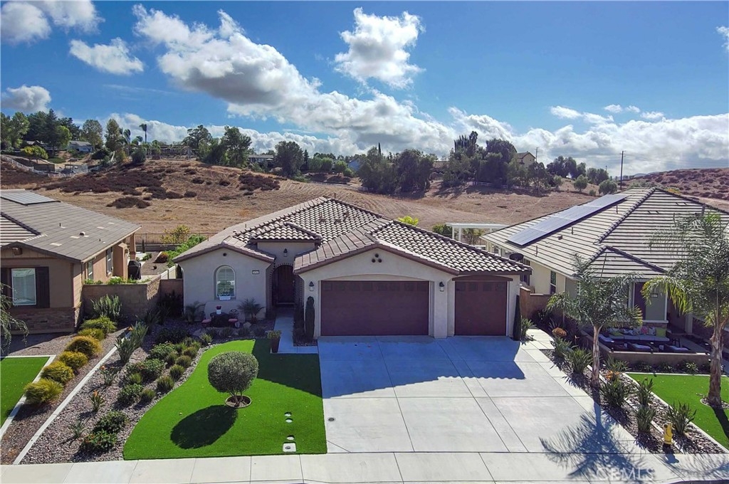 Exceptional luxury single-story residence in the highly sought-after gated Nicolas Heights community. Situated on a premium lot with scenic backyard views and enhanced privacy, this beautifully upgraded home features an open floor plan with crown molding and wood-look tile flooring throughout. Designed for indoor-outdoor living and effortless entertaining, corner sliding doors disappear into the walls, opening to a resort-style backyard oasis with a covered California room, professionally maintained pool and spa with Baja shelf, outdoor kitchen, and gas fire table. The chef’s kitchen offers a large center island, double ovens, custom quartz countertops, white cabinetry with new pull-out shelving, glass backsplash, spacious pantry, and high-end stainless steel appliances. The primary suite features a private en-suite bath and custom walk-in closet. A guest suite with en-suite bath and walk-in closet provides ideal privacy, while two additional bedrooms share a full bath with double vanity. Additional highlights include a three-car garage with built-in storage, indoor laundry with cabinetry, leased solar, tankless water heater, and smart-home technology with Ring security. Residents enjoy community amenities including a splash-pad park, dual gated entrances, and pedestrian access. Ideally located near Temecula’s award-winning wineries, Old Town, shopping, dining, and top-rated schools.