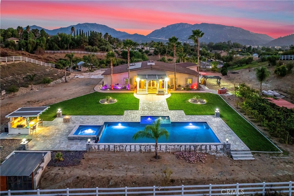 Exquisite Wine Country Estate – Welcome to an unparalleled luxury estate. Current Owners have spared no expense in upgrading & remodelling the entire estate. This magnificent 4-bedroom, 3.5-bath home offers an expansive 2.51 acre oasis that blends sophisticated living with serene countryside charm, catering to those with discerning taste. This estate offers the perfect combination of privacy & proximity to urban conveniences. Features: Outdoor Living: The stunning pool & spa with waterfalls & colored lights is surrounded by spacious patios invites endless days of relaxation entertainment. The outdoor space offers breathtaking views of 4th of July fireworks, ensuring every summer holiday is spectacular. A fruit orchard provides fresh seasonal produce.The private, gated tree-lined driveway is elegantly illuminated at night. The property features a circular driveway for convenient access, & a spacious 3-car garage, providing ample parking for your vehicles & guests. An elevated outdoor kitchen & entertainment area provides the perfect setting for hosting gatherings while enjoying views of the rolling hills & the lush landscape. Architectural Grandeur: Upon entering, you are greeted by a front door that makes an impressive statement with decorative wrought iron work, setting the tone for the elegance found throughout the home. The grand foyer boasts custom marble flooring, intricate molding, & soaring ceilings that evoke timeless elegance. The luxurious formal living spaces are enhanced by a designer chandelier & ornate fireplaces, offering an inviting environment for upscale gatherings. European-Inspired Modern Kitchen: Prepare to be wowed by the European-inspired modern kitchen, featuring cabinetry imported European cabinetry, providing both luxury & durability. This state-of-the-art kitchen is equipped with high-end appliances, ensuring an effortless cooking & dining experience. A sleek espresso bar has been integrated into the kitchen’s design, offering a touch of café-style sophistication. The estate includes a spa-inspired primary suite with a lavish bathroom featuring dual vanities, custom stonework, and a glass-enclosed shower – a perfect private retreat. The sauna adds an extra layer of relaxation to your daily routine. Prime Location: Situated in the prestigious area of Temecula, this estate offers proximity to world-class wineries, renowned golf courses, & charming downtown Temecula. It’s a lifestyle of exclusivity, luxury, & tranquility.