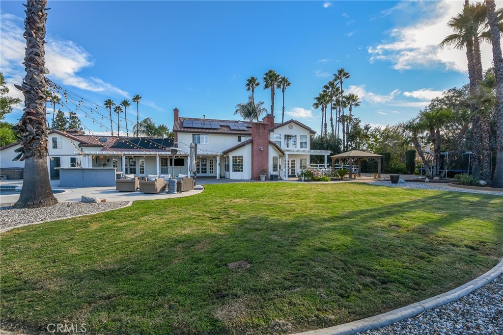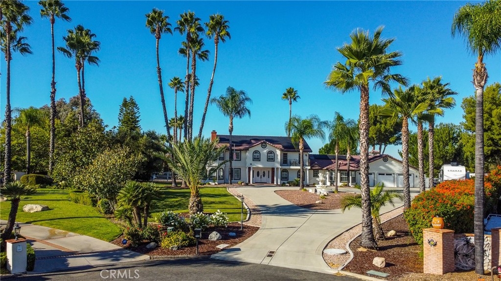 Welcome to Mariposa at Santiago Estates, Temecula’s premier enclave of luxury living. This entertainer’s dream home and horse property combines resort-style amenities with country charm—offering breathtaking views, modern upgrades, and 2.4 acres of usable equestrian land in a peaceful cul-de-sac setting. This expansive 4,533 sq. ft. estate features 5 bedrooms, 4.5 baths, and multiple living spaces designed for both comfort and grand entertaining. Inside, discover a light-filled floor plan with elegant renovations, including a professionally designed chef’s kitchen with new cabinetry, prep island, designer lighting, high-end appliances, and a statement range hood. The formal living and dining rooms set the tone for gatherings, while the spacious family room—with fireplace and built-in bar—opens to the backyard oasis. Upstairs, the primary retreat includes a sitting area, cozy fireplace, and a newly remodeled spa bath with dual sinks, quartz countertops, oversized soaking tub, and walk-in shower. The home also includes a private-entry Next-Gen suite—ideal for guests or multi-generational living—featuring its own living area plus a bonus flex room perfect for a gym, studio, or office. Step outdoors to your resort-style backyard: a relaxing haven with custom saltwater pool, outdoor kitchen and bar with built-in grill and seating, firepit lounge, and open space for entertaining. Enjoy panoramic sunset views, privacy, and annual fireworks from the comfort of home. The grounds include mature fruit trees (orange, lemon, lime, fig, avocado, olive, pomegranate, grapevine) and raised garden beds for farm-to-table living. A detached pool room/office offers a flexible workspace or guest area. Equestrians will love the barn and riding arena on the lower property, perfect for training and care. Additional highlights include new LVP flooring, HVAC, insulation, 400-amp service, new roof (2022), 48 solar panels, and solar-heated pool. The 3-car garage provides abundant storage, and the extended driveway accommodates RVs or recreational vehicles. Located near Old Town Temecula, Wine Country, Pechanga Resort, shopping, and fine dining, this estate delivers the ideal blend of sophistication, space, and lifestyle.