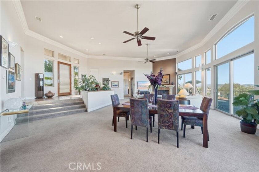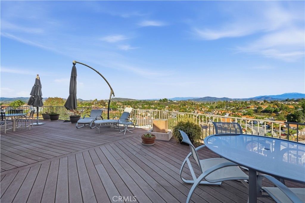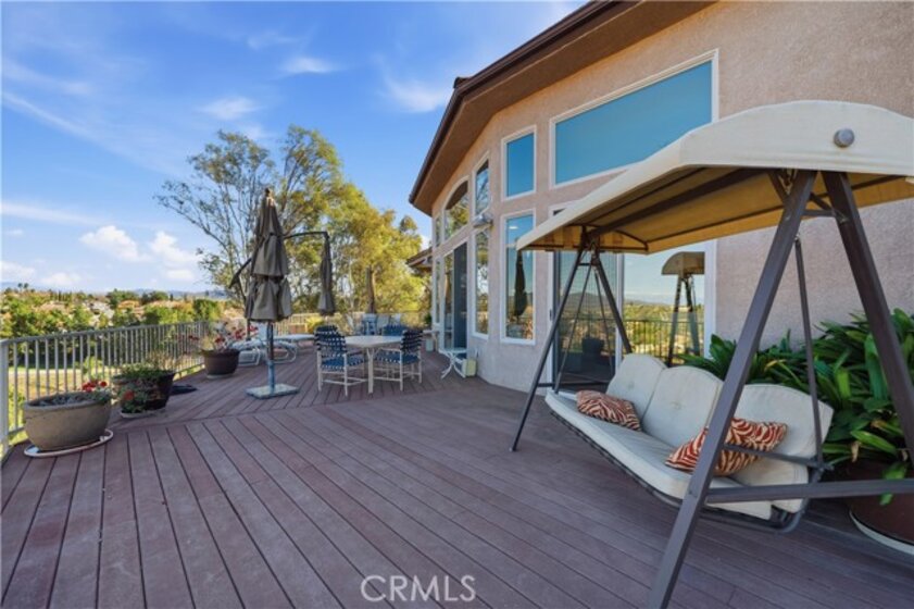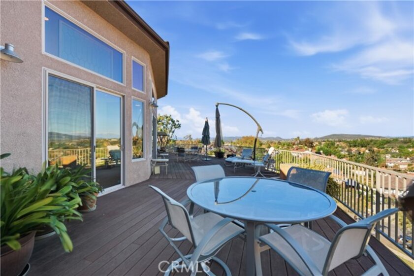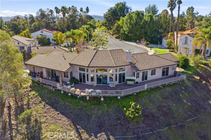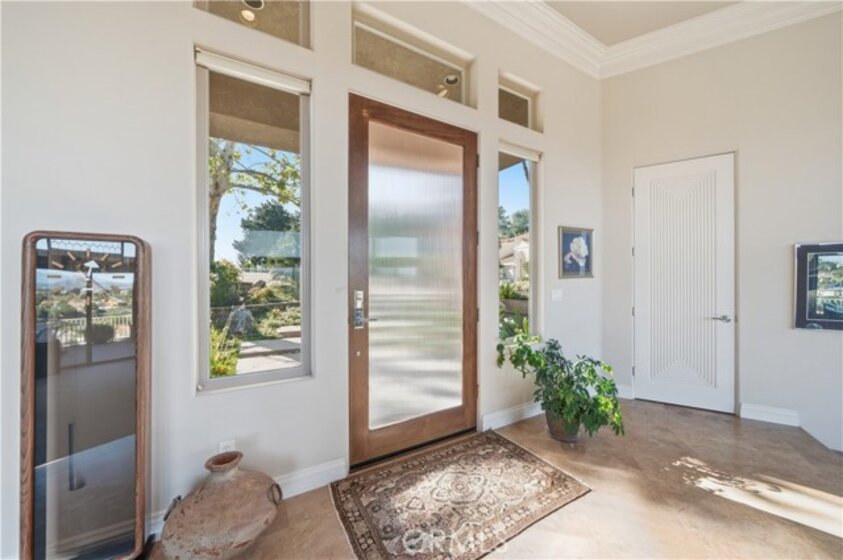 Listed for the first time, this exceptional custom-built single-story residence is gracefully positioned at the end of a private cul-de-sac, elevated to capture sweeping panoramic views. Thoughtfully designed with three bedrooms—including a grand primary suite, a private junior suite, and a guest bedroom. The home welcomes you through a dramatic open-concept entry into expansive living and dining spaces crowned by soaring 14-foot ceilings! Floor-to-ceiling glass windows frame the scenery while a gas fireplace, refined 12-inch crown molding, tall baseboards, and recessed lighting create an atmosphere of understated elegance. A chef's kitchen is both beautiful and functional, showcasing granite countertops, a substantial center island with bar seating, stainless steel appliances, a refined dry bar, and custom wood-and-glass cabinetry ideal for displaying curated collections. The luxurious primary bedroom offers direct access to the balcony through sliding glass doors, a large retreat and features a spa-inspired bath with dual vanities, walk-in shower, separate jetted soaking tub, and a generous walk-in closet. Designed for effortless indoor-outdoor living, six sliding glass doors open to scenic patios and entertaining spaces. Additional highlights include 12x30 RV PARKING, reinforced 2x6 exterior construction for enhanced insulation and durability, solid-core fluted interior doors throughout, and a three-car garage with 8-foot doors, built-in workbenches, and ample storage. Ideally located near Temecula’s renowned wine country and just minutes from premier shopping, dining, and entertainment, this one-of-a-kind residence offers privacy, craftsmanship, and an elevated lifestyle rarely found. Welcome Home!
