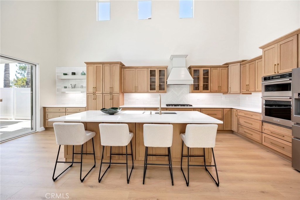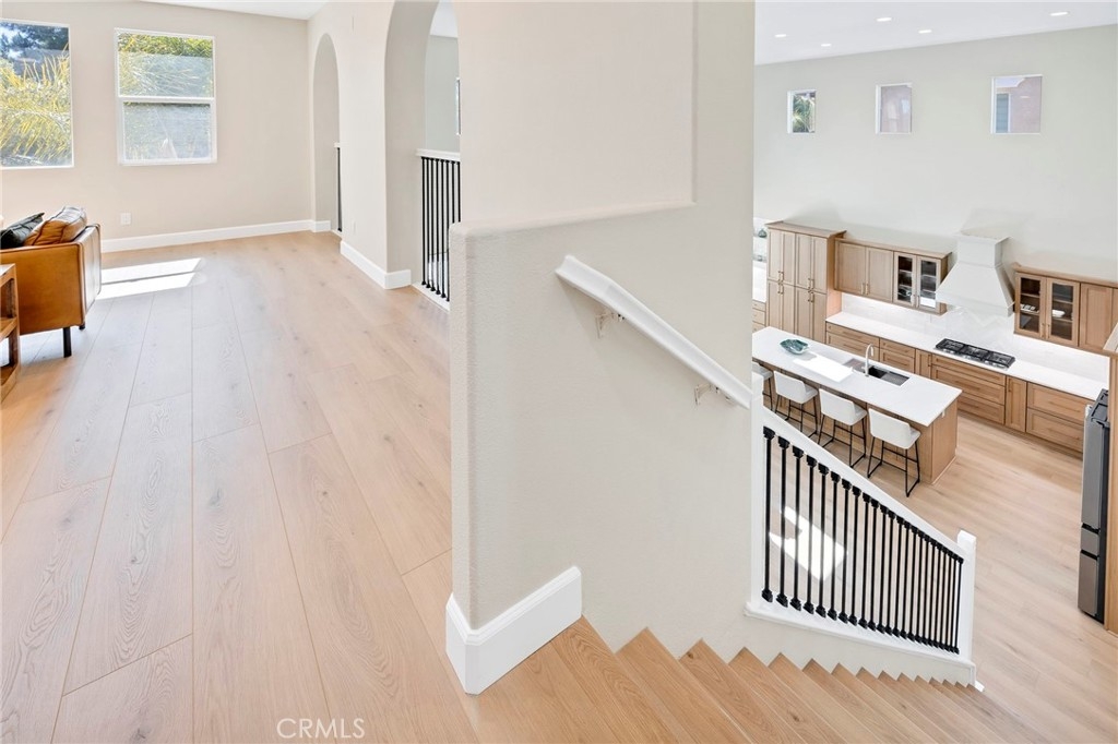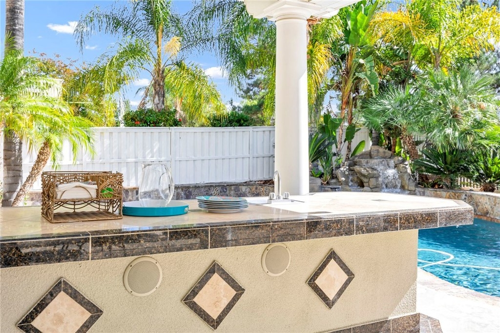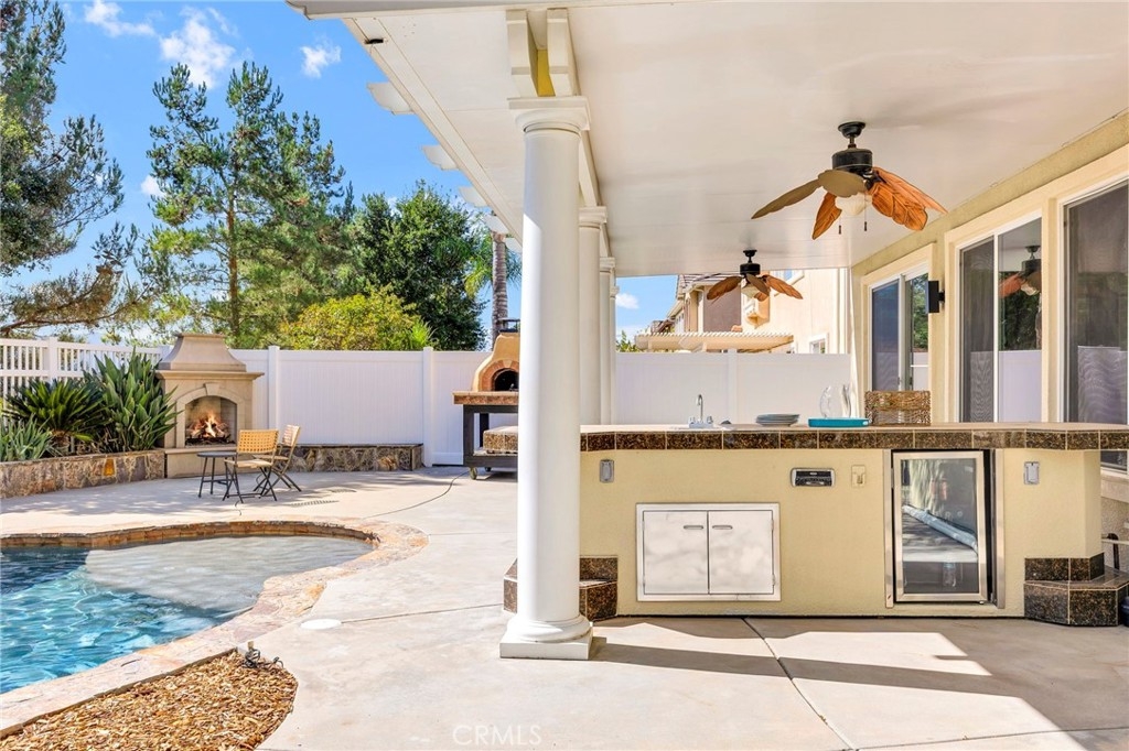 Newly renovated top to bottom, executive pool home in the highly sought-after neighborhood of Paseo Del Sol. Enjoy the sounds of the pool waterfall and sights of a backyard oasis from your brand new kitchen with soft-closing solid wood light oak cabinets, quartz counters, high-end appliances, tiled backsplash, floating shelves, custom range hood and large island. Hard-surface wood look flooring throughout, with a main floor primary suite with huge shower, double vanities, soaking tub, quartz counters, new sinks, lights, faucets, plus large walk-in closet! The upstairs bedrooms are each large with walk-in closets in two, plus built-in office furniture in another. The upstairs loft with built-in cabinets overlooks the vaulted ceiling in the kitchen and open-concept living room with new staircase, railings, and fireplace. The downstairs has a new bathroom and large tiled onyx-look shower along with formal sitting room and dining room while maintaining an open concept with beautiful arched doorways. The primary suite and dining room accent walls were custom built in a contemporary style and complete the luxury interior finishes this home has to offer. The pool was recently redone with a pebbletec surface, variable speed pump for the fountain controlled by an app, new filter and pool light. Your dream backyard has a built-in gas fireplace, wood-burning pizza oven, and island with beverage fridge to entertain throughout the year! With no rear neighborhoods and a quiet street, beautiful palms and landscaping, this is truly a backyard dream! Minimize utilities through a large solar system (28 panels with low monthly lease or buyout option) and pool heating solar as well. The 3 car garage is oversized and comes with an additional storage room. The house is nicely situated in one of the best neighborhoods in Temecula with low low taxes (no Mello Roos), HOA, walking trails, community pools, shopping and schools are all a close distance away.