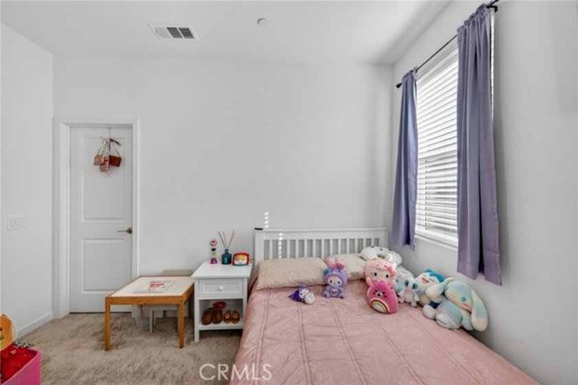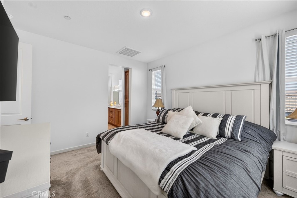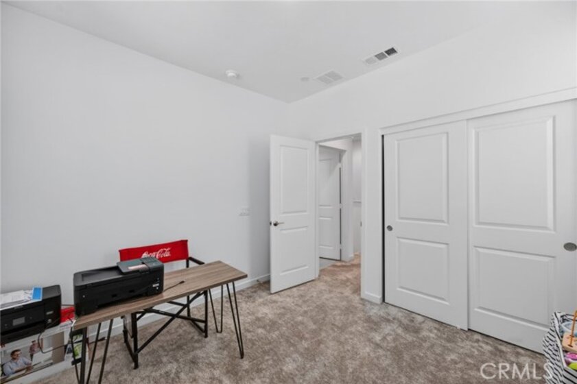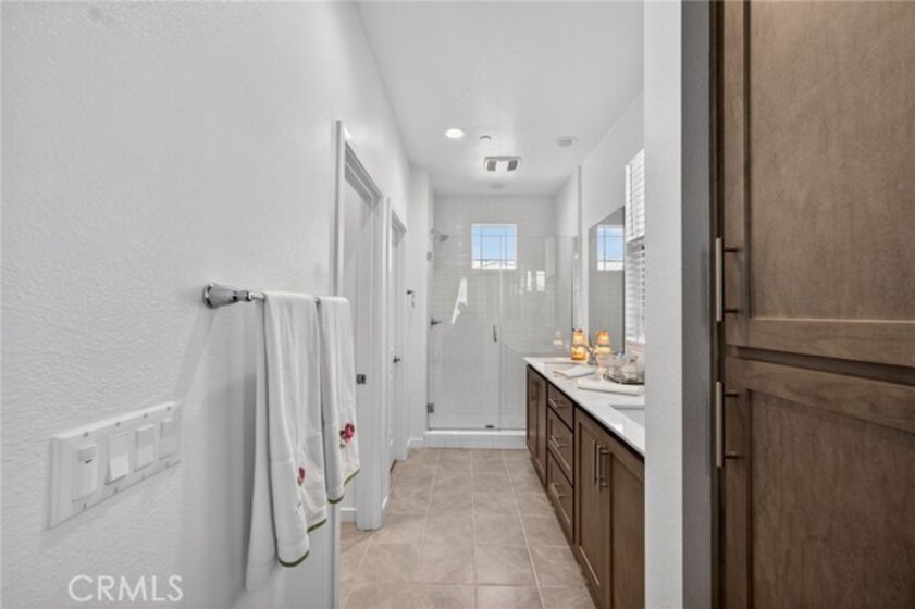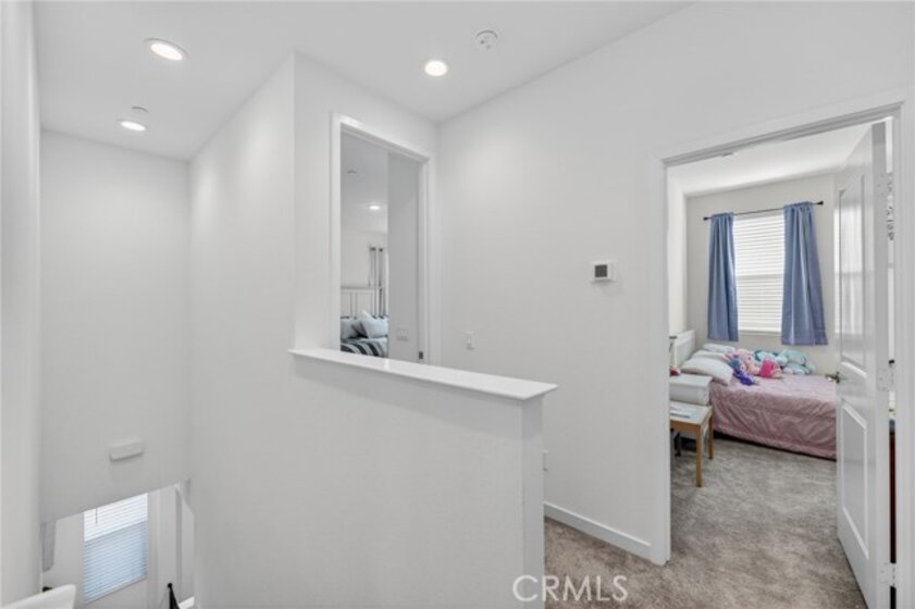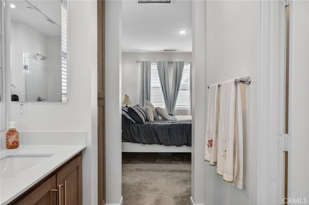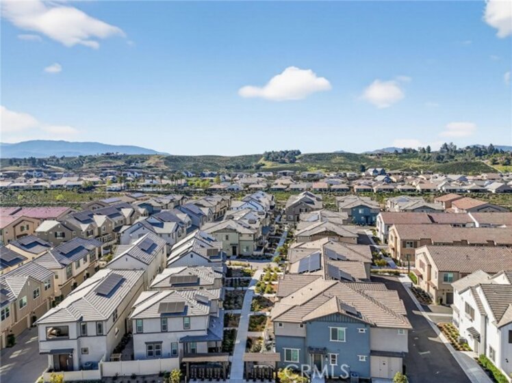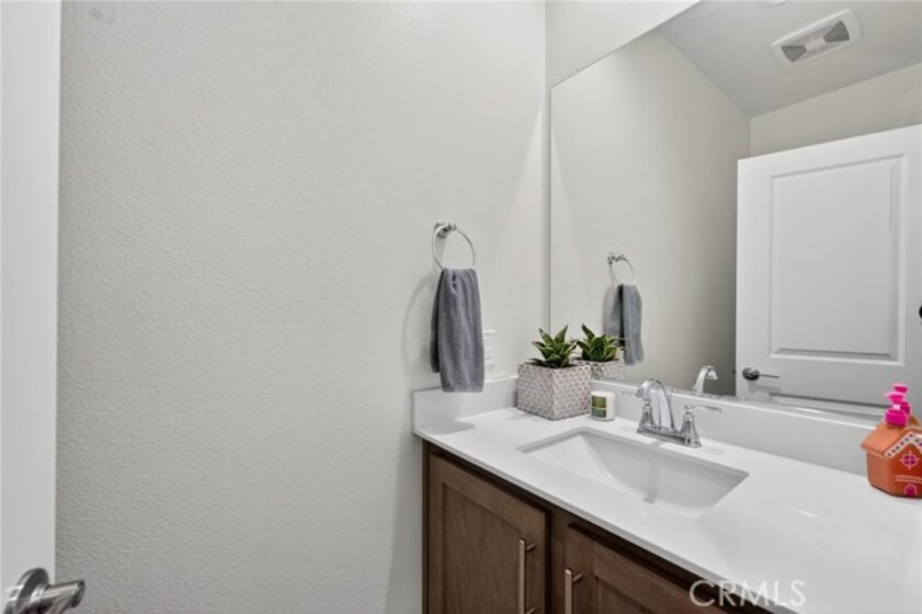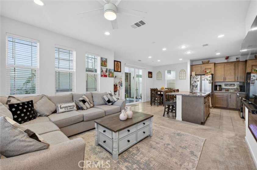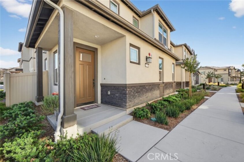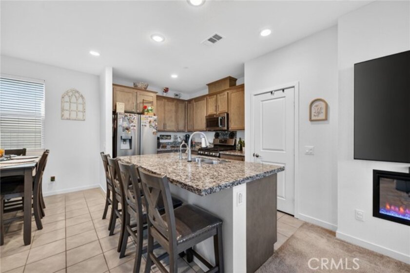 Built in 2023, this 4-bedroom, 3.5-bathroom home offers 1,829 square feet of well-appointed living space in the highly sought-after Sommers Bend community in Temecula. The floor plan includes a private downstairs bedroom with a full en-suite bathroom, a rare feature perfect for extended family, along with a dedicated half bath on the main level for guests. The open-concept kitchen is anchored by a granite center island with an undermount stainless steel sink, warm wood cabinetry, recessed lighting, and stainless steel appliances including a refrigerator and dishwasher. Luxury vinyl plank flooring runs throughout the kitchen and main living area. The dining space opens through a sliding glass door to a private side courtyard with paver hardscape — a low-maintenance outdoor retreat perfect for everyday use or casual entertaining. Upstairs, the primary suite features dual windows with drapes, a dual-sink quartz vanity, framed mirrors, and a glass-enclosed walk-in tile shower. Two additional bedrooms share a full bathroom on the upper level. Carpet runs throughout all bedrooms and the entire upper floor. A carpeted staircase with white wood railing connects both levels. A 2-car attached garage and leased solar panels complete the home. Sommers Bend residents enjoy resort-style amenities including a pool and spa, a designer clubhouse, covered outdoor lounge areas with ceiling fans, basketball courts, tot lots, and miles of walking and biking trails with panoramic mountain and rolling hill views. Situated within the Temecula Valley Unified School District and minutes from Temecula Wine Country, Old Town Temecula, Pechanga Resort Casino, and the 15 Freeway corridor in Southwest Riverside County.
