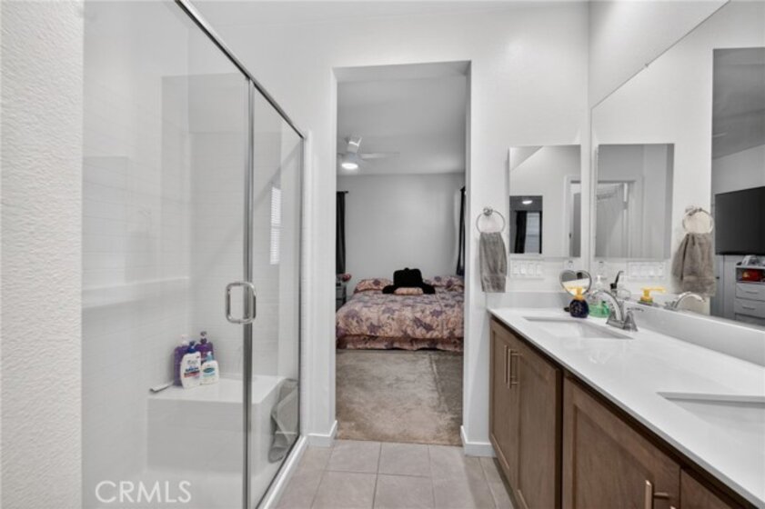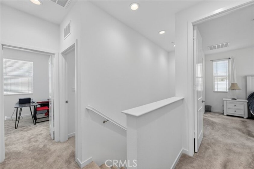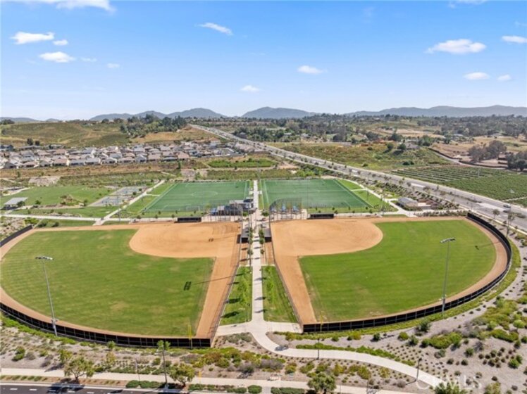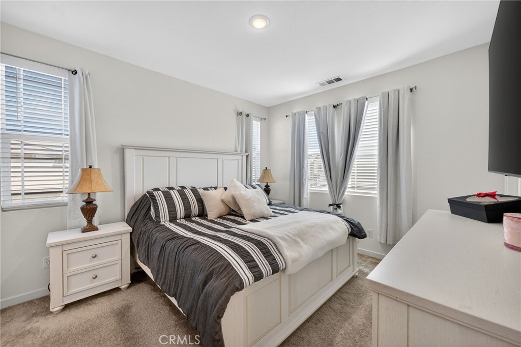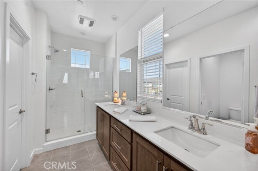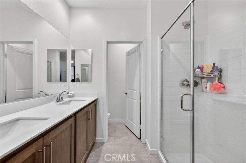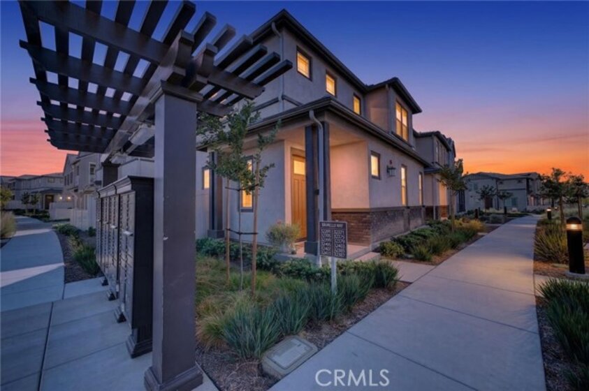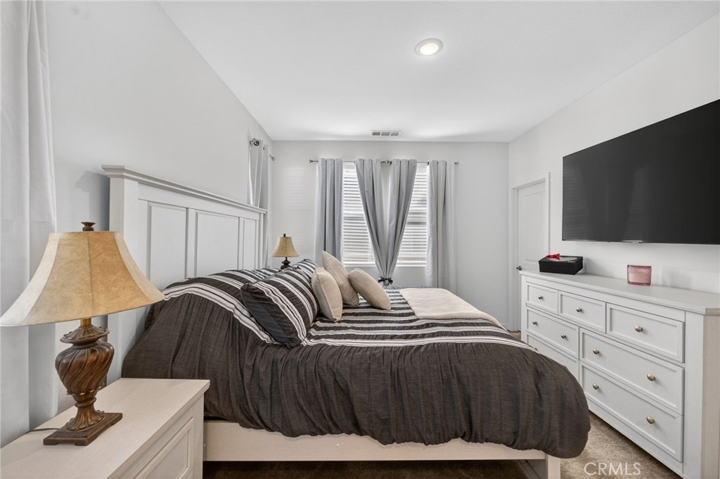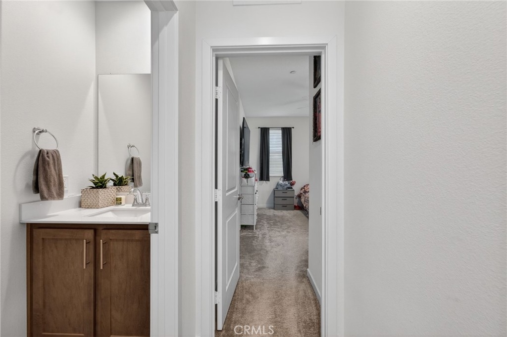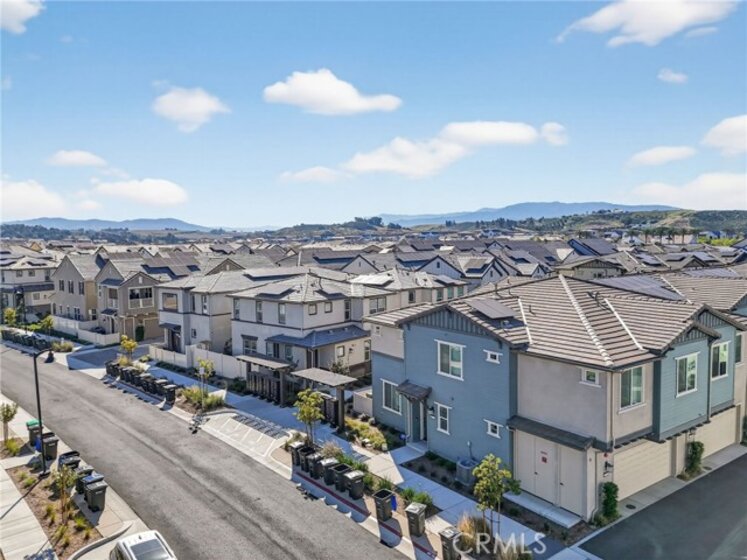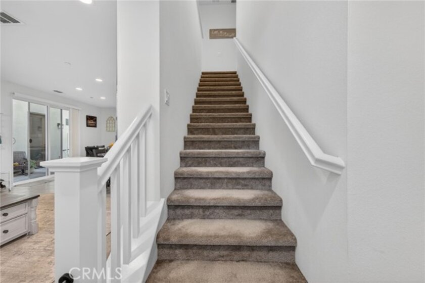 Built in 2023, this 4-bedroom, 3.5-bathroom home offers 1,829 square feet of well-appointed living space in the highly sought-after Sommers Bend community in Temecula. The floor plan includes a private downstairs bedroom with a full en-suite bathroom, a rare feature perfect for extended family, along with a dedicated half bath on the main level for guests. The open-concept kitchen is anchored by a granite center island with an undermount stainless steel sink, warm wood cabinetry, recessed lighting, and stainless steel appliances including a refrigerator and dishwasher. Luxury vinyl plank flooring runs throughout the kitchen and main living area. The dining space opens through a sliding glass door to a private side courtyard with paver hardscape — a low-maintenance outdoor retreat perfect for everyday use or casual entertaining. Upstairs, the primary suite features dual windows with drapes, a dual-sink quartz vanity, framed mirrors, and a glass-enclosed walk-in tile shower. Two additional bedrooms share a full bathroom on the upper level. Carpet runs throughout all bedrooms and the entire upper floor. A carpeted staircase with white wood railing connects both levels. A 2-car attached garage and leased solar panels complete the home. Sommers Bend residents enjoy resort-style amenities including a pool and spa, a designer clubhouse, covered outdoor lounge areas with ceiling fans, basketball courts, tot lots, and miles of walking and biking trails with panoramic mountain and rolling hill views. Situated within the Temecula Valley Unified School District and minutes from Temecula Wine Country, Old Town Temecula, Pechanga Resort Casino, and the 15 Freeway corridor in Southwest Riverside County.