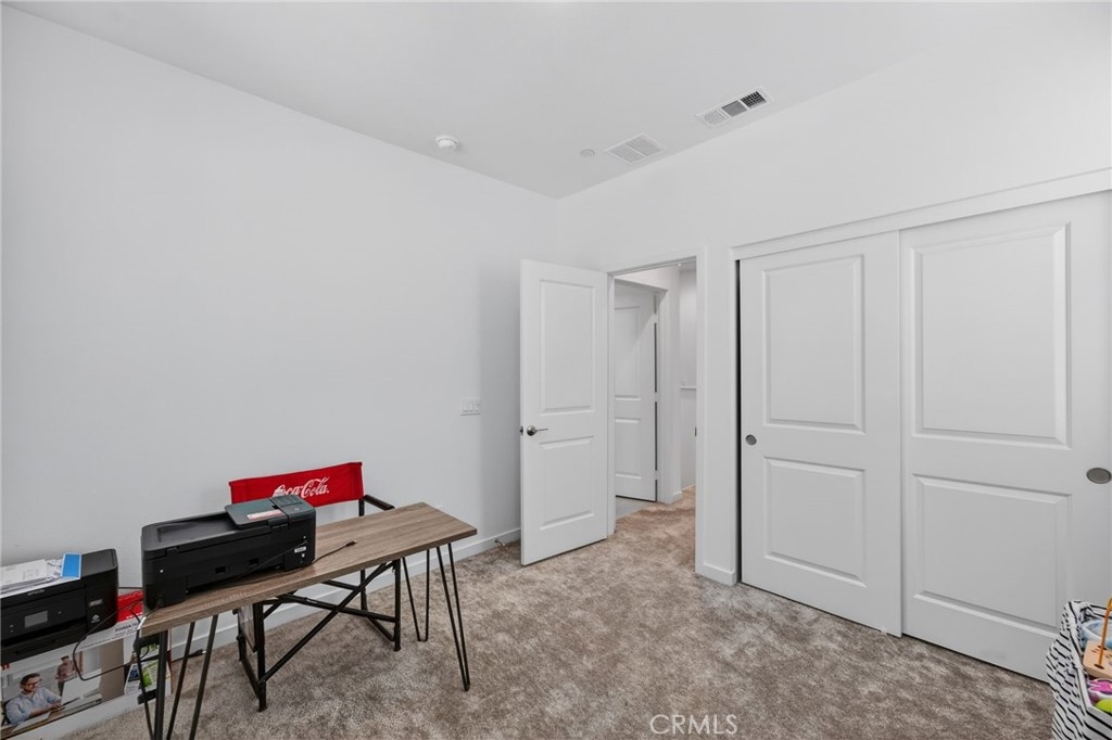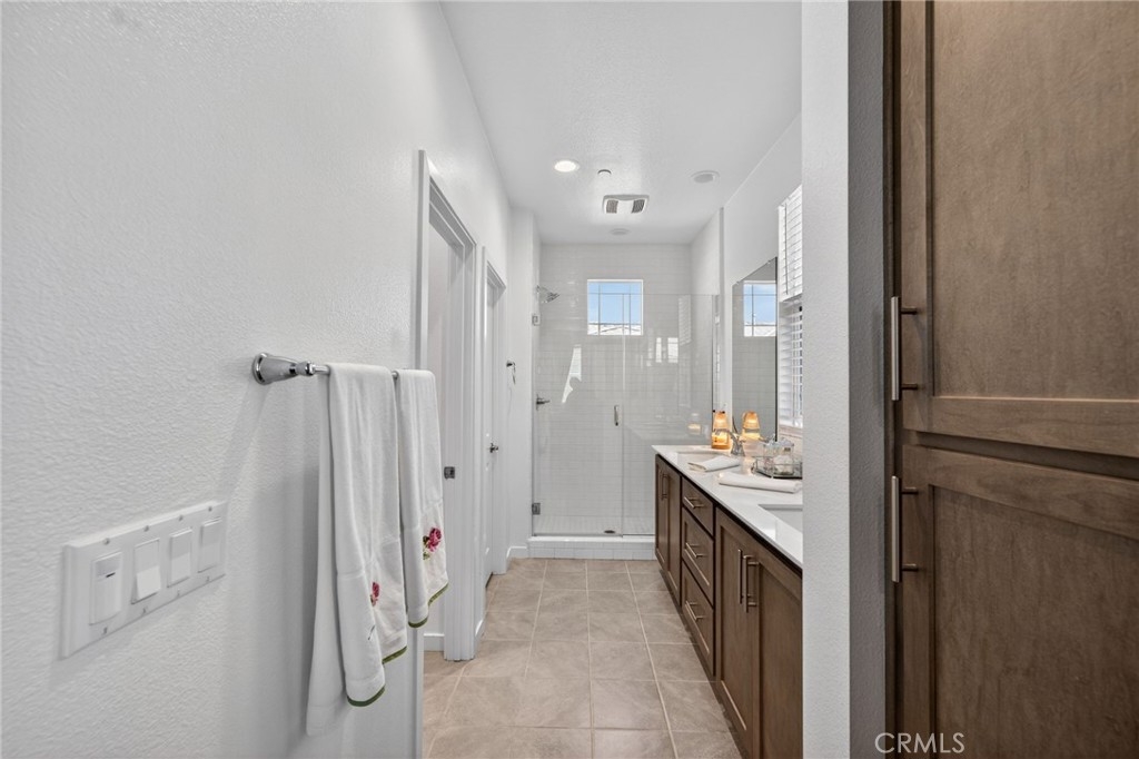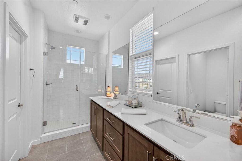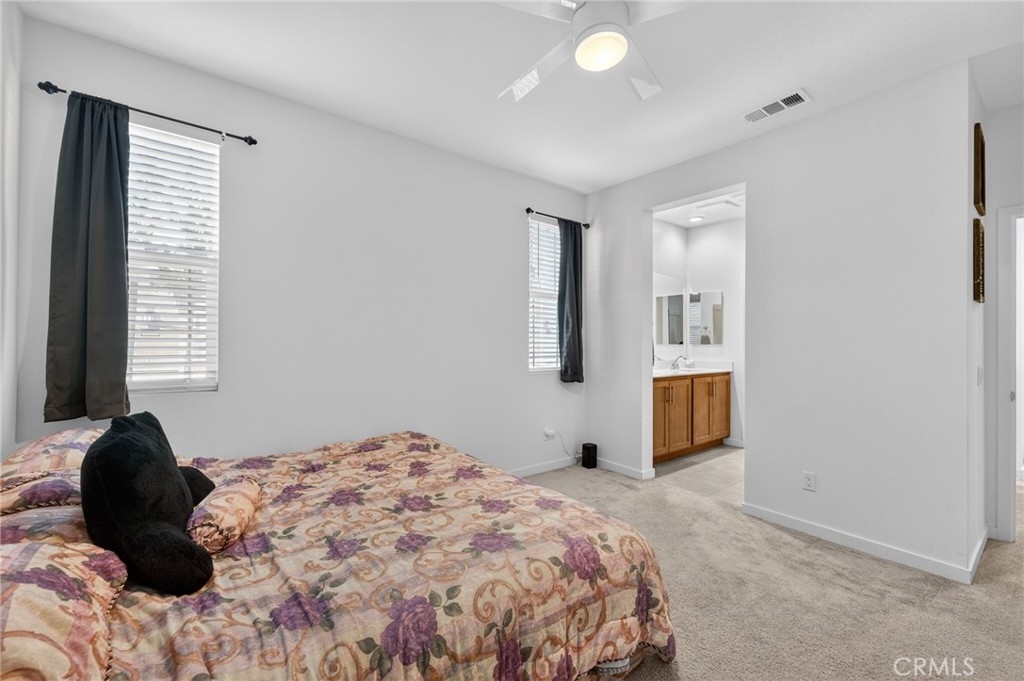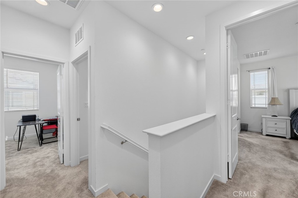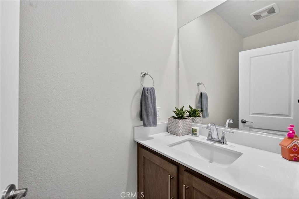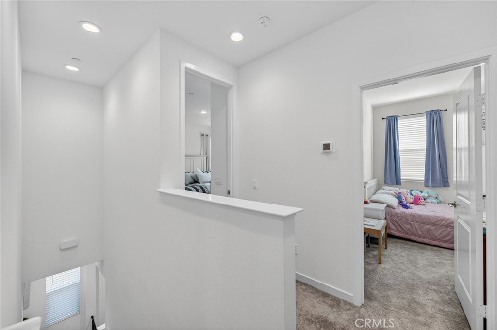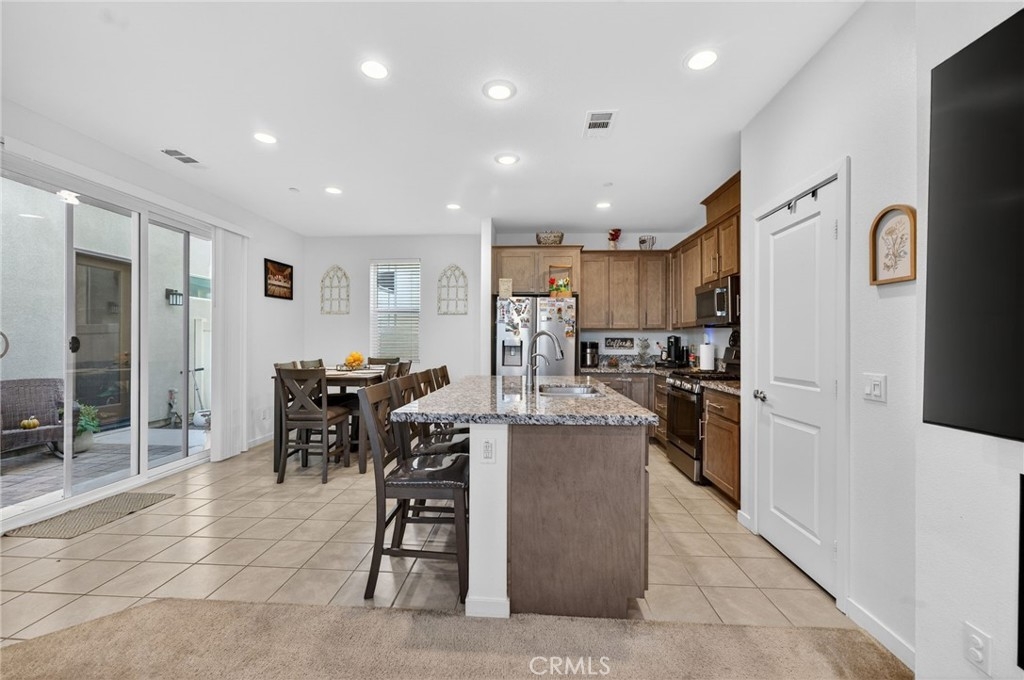 Built in 2023, this 4-bedroom, 3.5-bathroom home offers 1,829 square feet of well-appointed living space in the highly sought-after Sommers Bend community in Temecula. The floor plan includes a private downstairs bedroom with a full en-suite bathroom, a rare feature perfect for extended family, along with a dedicated half bath on the main level for guests. The open-concept kitchen is anchored by a granite center island with an undermount stainless steel sink, warm wood cabinetry, recessed lighting, and stainless steel appliances including a refrigerator and dishwasher. Luxury vinyl plank flooring runs throughout the kitchen and main living area. The dining space opens through a sliding glass door to a private side courtyard with paver hardscape — a low-maintenance outdoor retreat perfect for everyday use or casual entertaining. Upstairs, the primary suite features dual windows with drapes, a dual-sink quartz vanity, framed mirrors, and a glass-enclosed walk-in tile shower. Two additional bedrooms share a full bathroom on the upper level. Carpet runs throughout all bedrooms and the entire upper floor. A carpeted staircase with white wood railing connects both levels. A 2-car attached garage and leased solar panels complete the home. Sommers Bend residents enjoy resort-style amenities including a pool and spa, a designer clubhouse, covered outdoor lounge areas with ceiling fans, basketball courts, tot lots, and miles of walking and biking trails with panoramic mountain and rolling hill views. Situated within the Temecula Valley Unified School District and minutes from Temecula Wine Country, Old Town Temecula, Pechanga Resort Casino, and the 15 Freeway corridor in Southwest Riverside County.