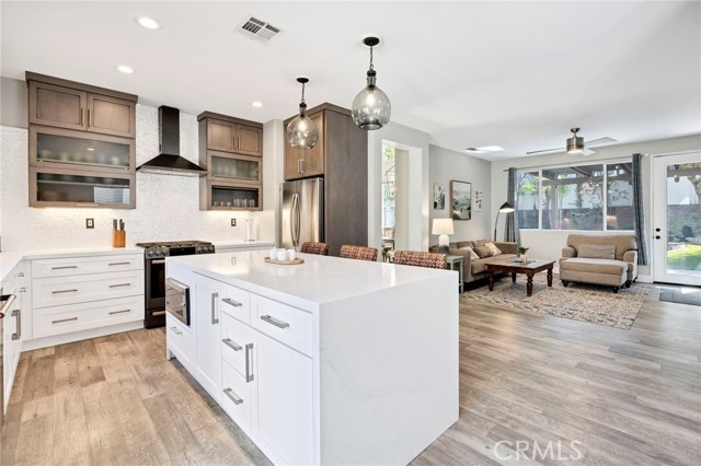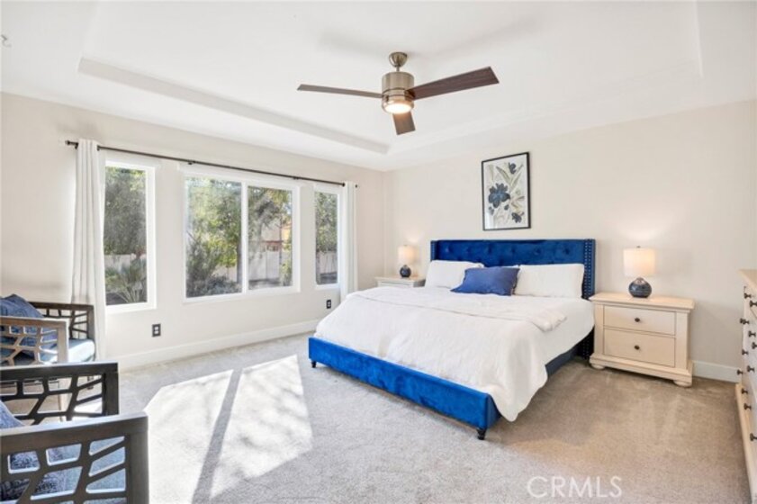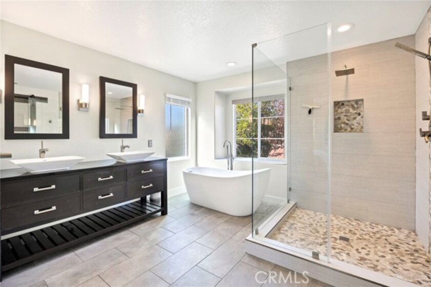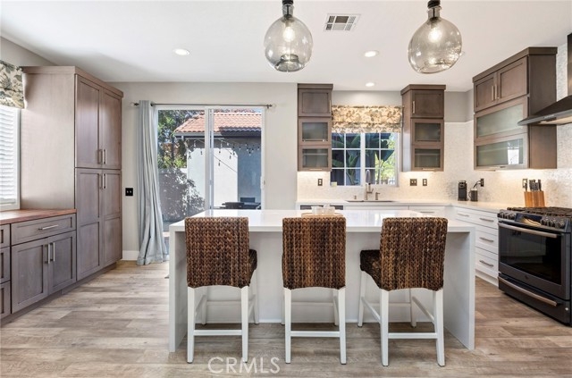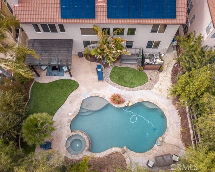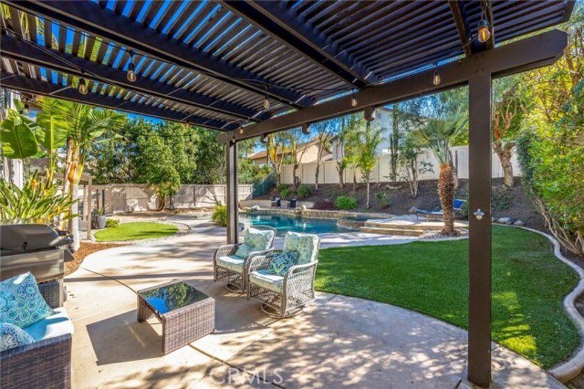 Welcome home to your fully remodeled and upgraded pool/spa home in the highly sought-after Paseo Del Sol community. This bright, spacious, 5-bedroom, 3-bathroom home offers luxurious well-designed living space in one of Temecula’s most desirable neighborhoods complete with 2 resort-like community pools plus tennis, parks, and walking distance to Abby Reinke Elementary. Beyond the gorgeous street presence awaits a secluded front courtyard complete with cafe lights and Saltillo tile. Inside, the functional and open layout with vaulted ceilings in the living and dining areas creates an airy and inviting feel in this unique floor plan - one main floor office/bedroom with no closet adjacent to a full bath. The reimagined kitchen features a large waterfall quartz island, quartz countertops, a custom backsplash with mother of pearl mini subway tile, solid wood Shaker cabinets, contemporary glass euro-hinged upper cabinets, and a walnut countertop between the pantry cabinets, along with upgraded appliances. The primary suite is a contemporary show-stopper with a stand-alone soaking tub, huge tiled and glass shower with two powerful showerheads, plus a freestanding double sink vanity with vessel sinks and recessed medicine cabinets. The primary bedroom has a custom acacia wood accent wall along with a cavernous walk-in closet. Upstairs, the interior doors are solid alder. The large and private backyard is perfect for relaxing and entertaining, boasting a pebbletec pool and spa, newer pool equipment, artificial turf plus a pergola and swing. A rare bonus is the detached 3rd car garage, with endless possibilities for storage, workspace/flex-space uses, or the option to finish to living space. Paid-for solar panels, two new AC units, whole-house fan, plus smart home features like Nest thermostats, Ring cameras, and many new high-end windows help keep energy costs down year-round. The main floor has high-end LVP, 5” baseboards, and a custom concrete ramp sink in the downstairs bathroom. Must see to appreciate all the unique features of this beautiful home. Low taxes, low HOA, no Mello Roos. Ideally located close to Temecula’s best amenities, such as top-rated schools, parks, golf courses, wine country, shopping, dining, and more.