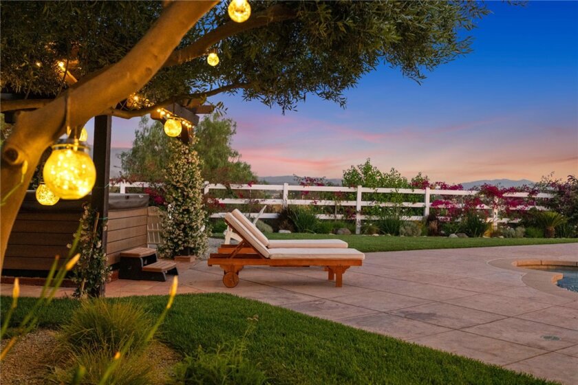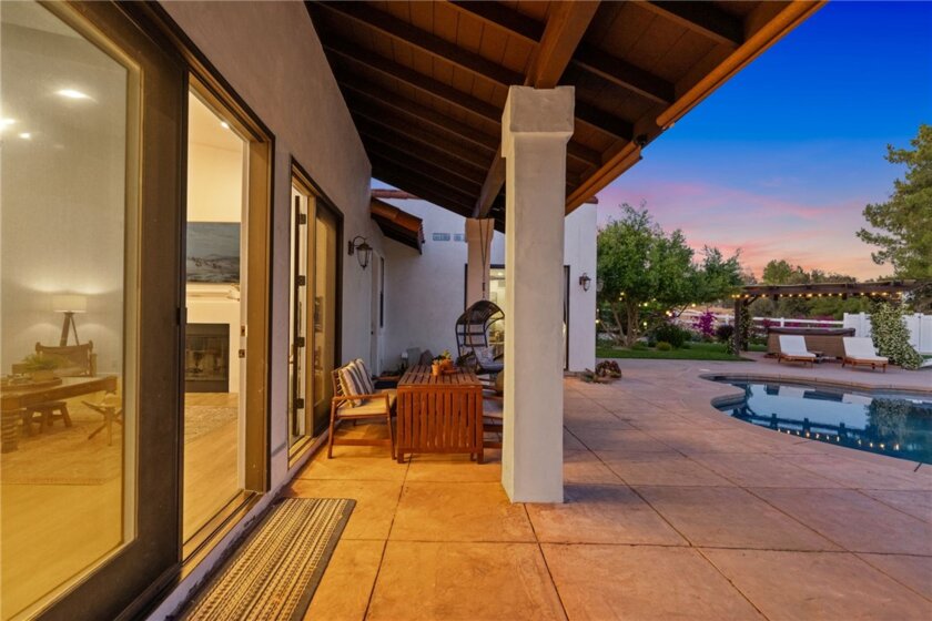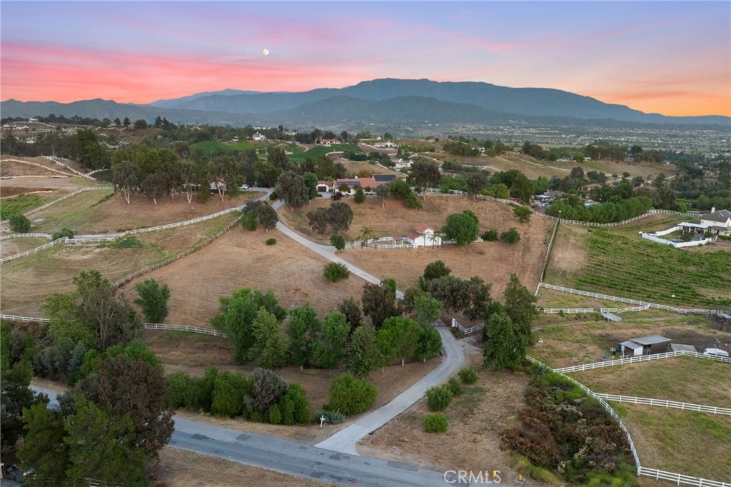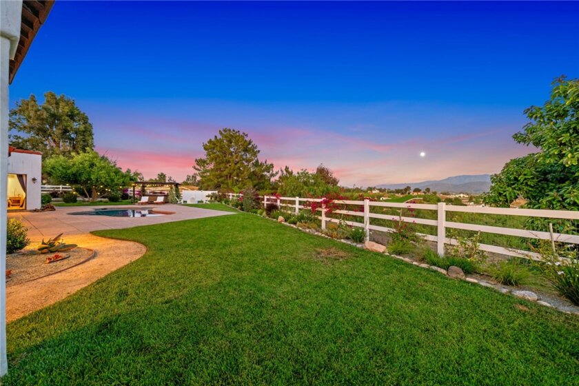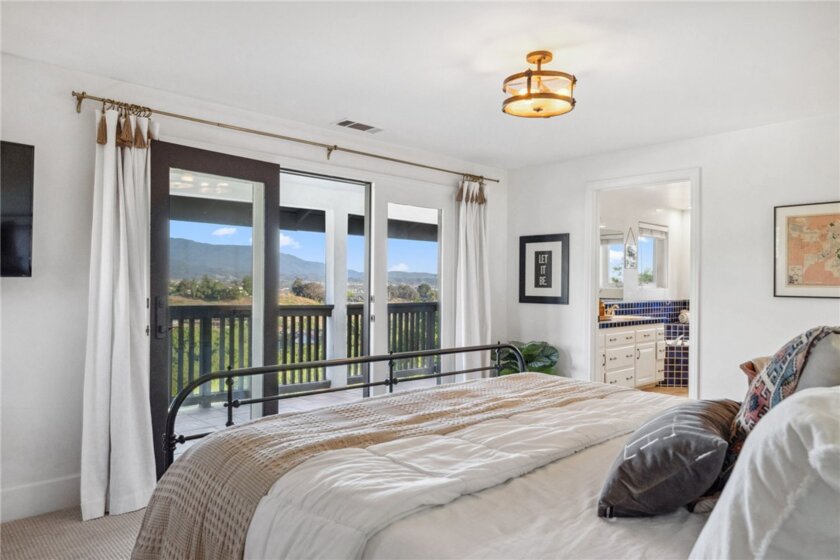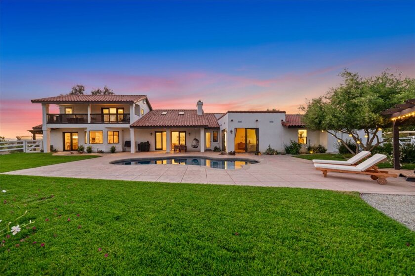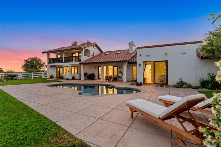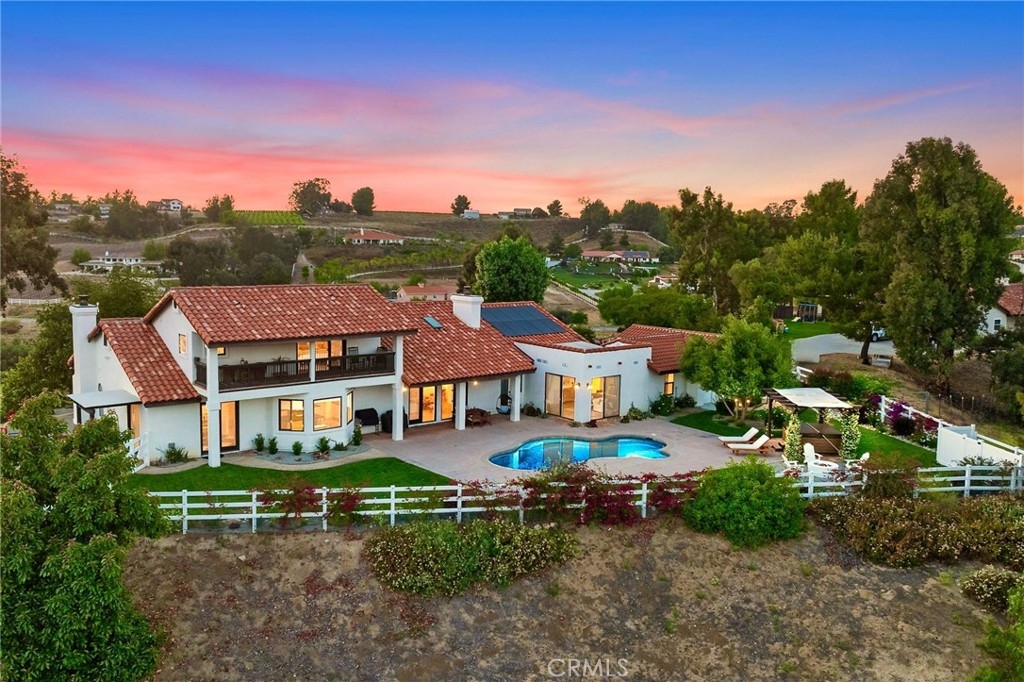Temecula Wine Country Ranchette: An exquisite modern Spanish-style estate nestled in one of the most prestigious communities. Perfectly situated for convenience, you’re just 10 minutes from freeway access, top-rated schools, grocery stores, and over 40 renowned wineries. Perched atop nearly 5 acres, this exceptional property offers a spacious main house and a separate income-producing guest house. The main residence, spanning over 4,000sqft, boasts four ensuite bedrooms and two additional bathrooms. Designed for single-story living, the main living quarters, two guest bedrooms, and the primary suite are conveniently located on the first level. The primary bedroom features a luxurious, designer-inspired walk-in closet and floor-to-ceiling sliding doors that open to the stunning backyard and pool. The ensuite bath features heated floors, a large soaking tub, and an oversized walk-in shower. The second story offers a private guest suite with a stunning veranda, a spacious walk-in closet, and a spa-like bathroom. Enjoy breathtaking sunrises and watch the hot air balloons drift by from your own private balcony. The chef’s dream kitchen is a centerpiece of the home, featuring custom cabinets, a panel-ready refrigerator, and a large center island with a workshop sink and wine fridge. Open shelves and a custom hood complement the Wolf range and stone countertops. The kitchen also includes double Thermador ovens, bar seating, and provides stunning views of the mountains, backyard, and pool. Adjacent to the kitchen and family room, the dining area showcases luxury porcelain checker-tiled floors and French doors that open to the expansive backyard. High ceilings, an open floor plan, skylights, and endless upgrades define this home. Enjoy new laminate flooring, a walk-in butler’s pantry, a custom bar with a high-end cocktail ice maker, refrigerator, and sink, brand-new drought-tolerant landscaping, a new pool bath with a separate entrance, Restoration Hardware fixtures, fruit trees, 45 brand-new solar panels, new electric water heaters with instant hot water, LED lighting throughout, and Wi-Fi-controlled pool equipment. The income-producing guest house has been recently remodeled to the highest standards, featuring custom cabinets, stone countertops, a large kitchen island, new appliances, flooring, and bathrooms. This additional living space is perfect for guests or as a rental property, providing an excellent source of extra income.
