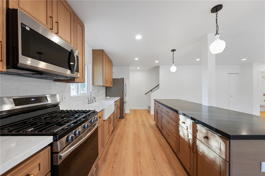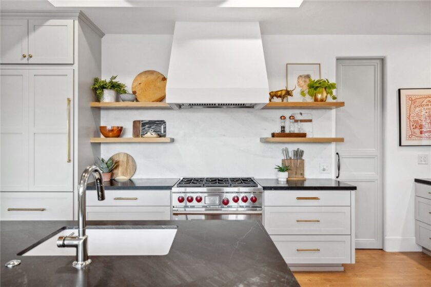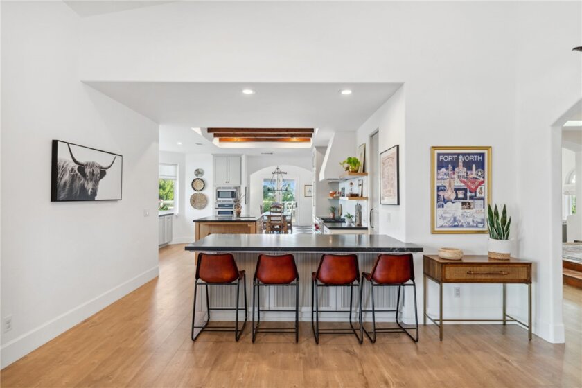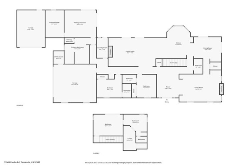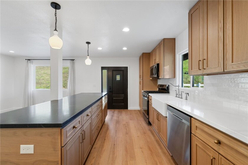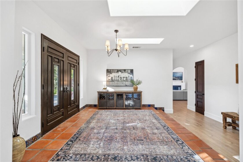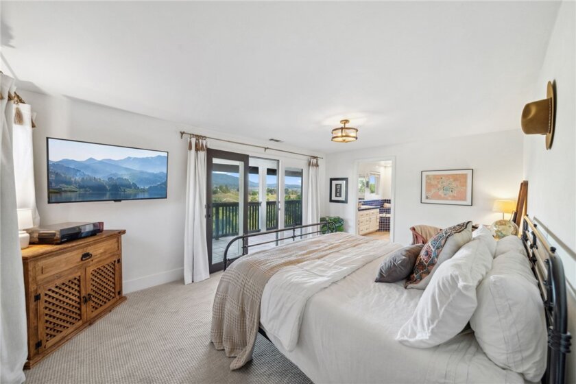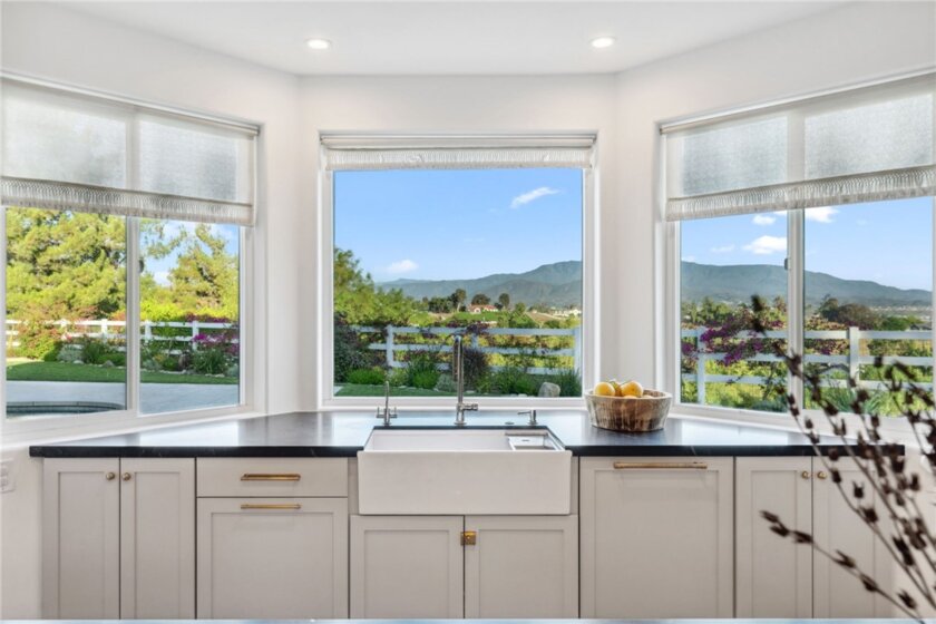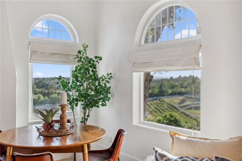 Temecula Wine Country Ranchette: An exquisite modern Spanish-style estate nestled in one of the most prestigious communities. Perfectly situated for convenience, you’re just 10 minutes from freeway access, top-rated schools, grocery stores, and over 40 renowned wineries. Perched atop nearly 5 acres, this exceptional property offers a spacious main house and a separate income-producing guest house. The main residence, spanning over 4,000sqft, boasts four ensuite bedrooms and two additional bathrooms. Designed for single-story living, the main living quarters, two guest bedrooms, and the primary suite are conveniently located on the first level. The primary bedroom features a luxurious, designer-inspired walk-in closet and floor-to-ceiling sliding doors that open to the stunning backyard and pool. The ensuite bath features heated floors, a large soaking tub, and an oversized walk-in shower. The second story offers a private guest suite with a stunning veranda, a spacious walk-in closet, and a spa-like bathroom. Enjoy breathtaking sunrises and watch the hot air balloons drift by from your own private balcony. The chef’s dream kitchen is a centerpiece of the home, featuring custom cabinets, a panel-ready refrigerator, and a large center island with a workshop sink and wine fridge. Open shelves and a custom hood complement the Wolf range and stone countertops. The kitchen also includes double Thermador ovens, bar seating, and provides stunning views of the mountains, backyard, and pool. Adjacent to the kitchen and family room, the dining area showcases luxury porcelain checker-tiled floors and French doors that open to the expansive backyard. High ceilings, an open floor plan, skylights, and endless upgrades define this home. Enjoy new laminate flooring, a walk-in butler’s pantry, a custom bar with a high-end cocktail ice maker, refrigerator, and sink, brand-new drought-tolerant landscaping, a new pool bath with a separate entrance, Restoration Hardware fixtures, fruit trees, 45 brand-new solar panels, new electric water heaters with instant hot water, LED lighting throughout, and Wi-Fi-controlled pool equipment. The income-producing guest house has been recently remodeled to the highest standards, featuring custom cabinets, stone countertops, a large kitchen island, new appliances, flooring, and bathrooms. This additional living space is perfect for guests or as a rental property, providing an excellent source of extra income.