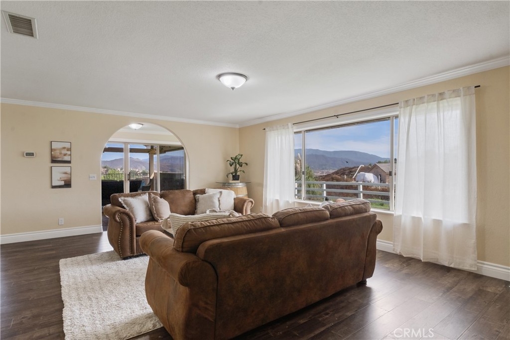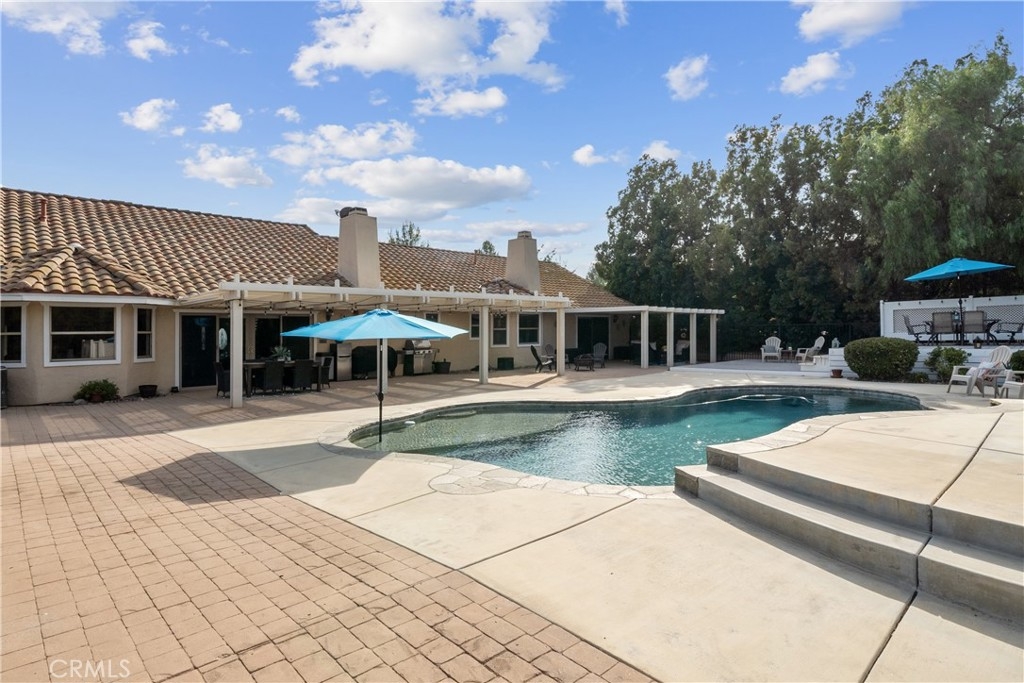 Located in the heart of Temecula Wine Country, this private, gated single-story estate offers 4 bedrooms, 3 bathrooms, and over 3,200 sq. ft. of living space on an expansive 87,991 sq. ft. lot—ideal for a future ADU. Interior highlights include wood and stone flooring, crown molding, and a stacked-stone fireplace. The gourmet kitchen features granite counters, stainless steel appliances, and a center island that opens to the family room and breakfast nook. A formal living room with balcony access provides an inviting space for entertaining or enjoying morning views of hot air balloons. There are two fireplaces: one in the living room and one in the primary suite, uniquely positioned between the bedroom and bathtub—creating the perfect ambiance while soaking in the tub. The primary suite also offers a bath, walk-in closet, and patio access. Secondary bedrooms are generously sized, with two sharing a Jack-and-Jill bathroom. A versatile bonus room provides the ideal space for a home office, gym, or playroom. The backyard is designed for resort-style living with a sparkling pool, full-length covered patio, and elevated sun deck with panoramic views. The property also includes fruit trees, RV parking, western-style outbuildings, and fully paid-for solar panels for energy efficiency and cost savings. All just minutes from award-winning wineries, Lake Skinner, shopping, and top-rated schools.
