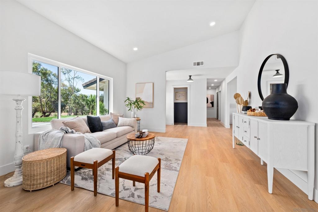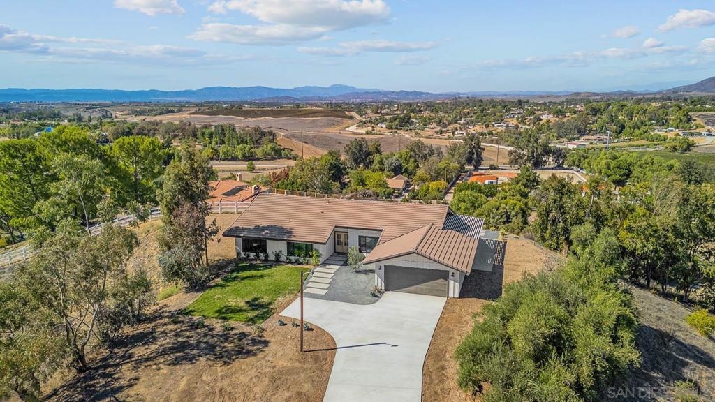 Stunning 4 bed 2.5 bath remodel on expansive 3.9 acre lot perched on a hilltop with panoramic views of wine country! Brand new driveway! Meticulous attention to detail with this Temecula home featuring a bright & open single story floorplan, vaulted ceilings, large family room, abundance of windows, modern fixtures & finishes, chef's kitchen with contrasting white and gray cabinetry, spacious bedrooms and covered patio area off living space. Palatial master retreat featuring spa-like bath with large walk-in, tiled shower. Home features a newly paved driveway, 2 car attached garage and enormous detached garage/workshop. The 3.9 acre lot provides space for potential ADU, pool, vehicles, horse stables, hobbies & toys while offering privacy and quiet. Perfect location for your own peaceful sanctuary!