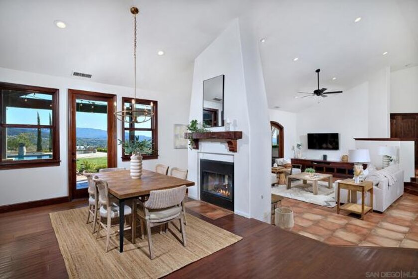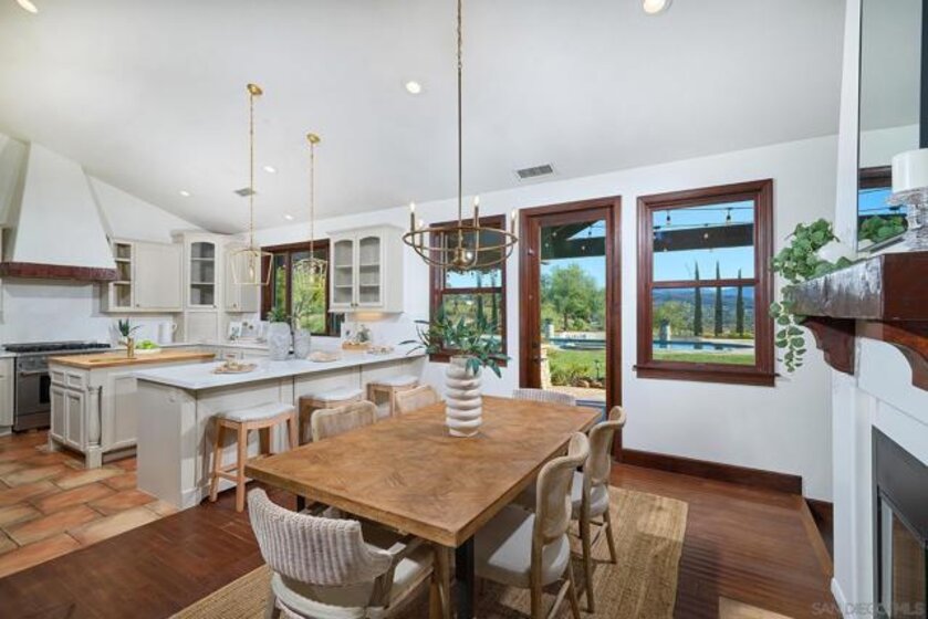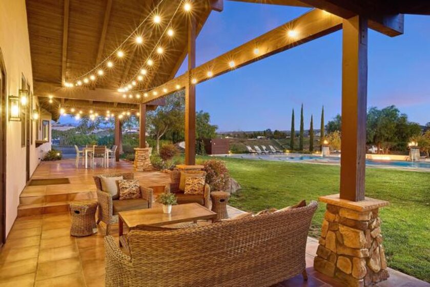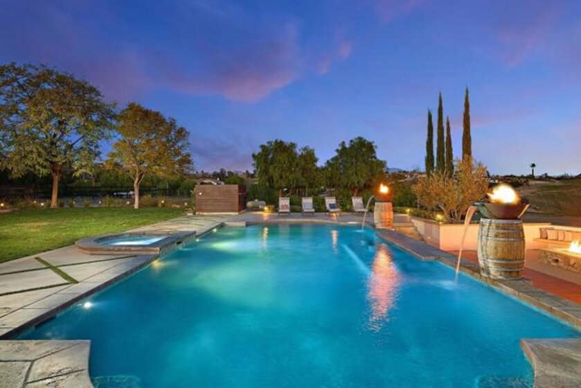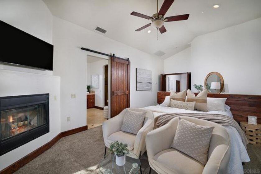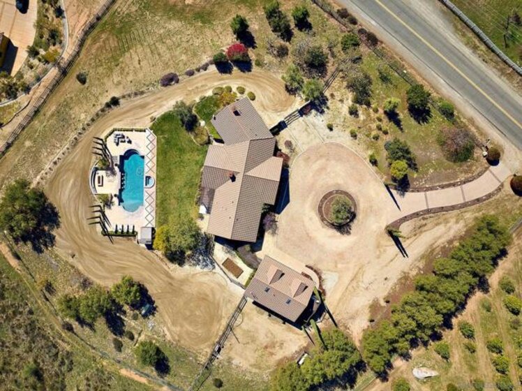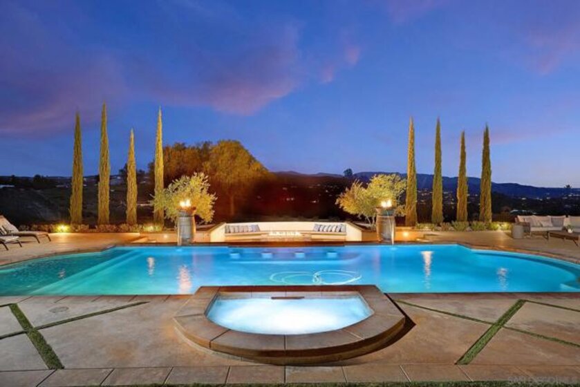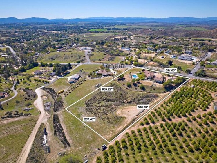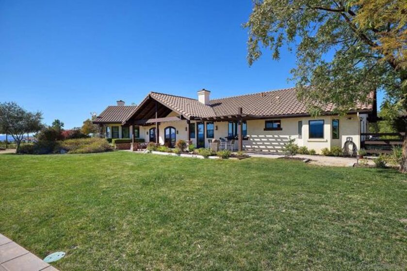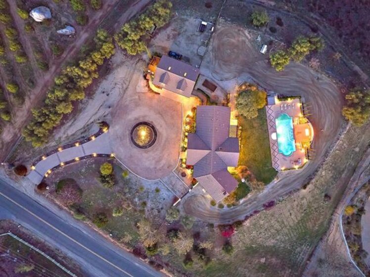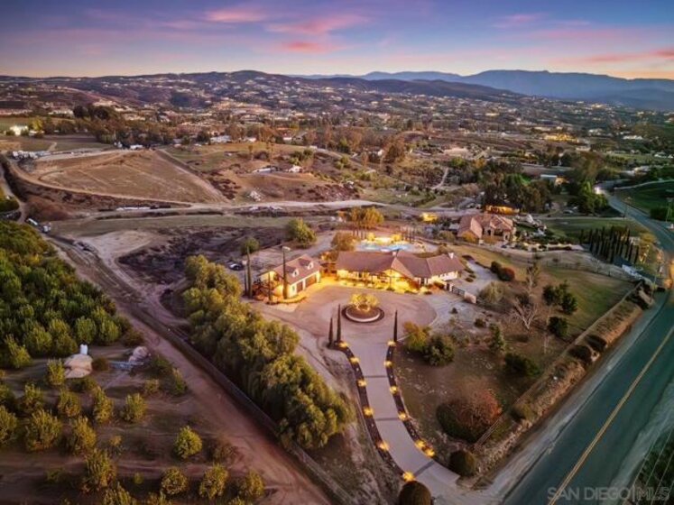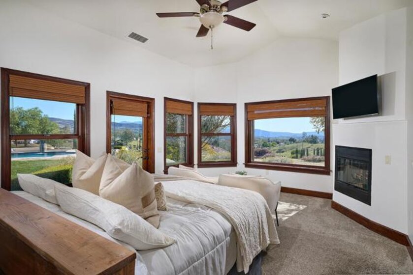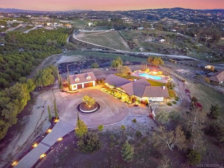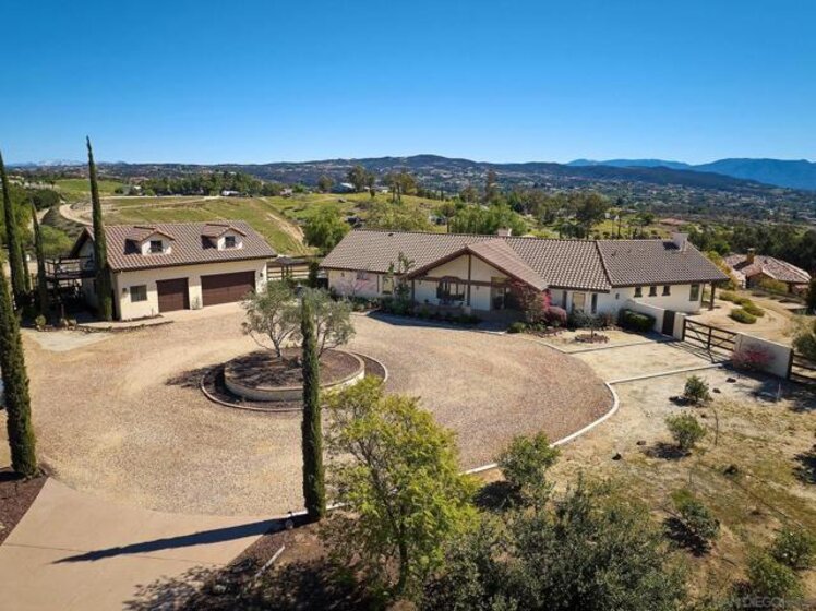 Exquisite Sunset Orientation, set amidst the rolling vineyards and breathtaking landscapes of Temecula’s Wine Country, this extraordinary well built with attention to detail, single-story 4.7-acre estate is on the market for the first time. It is a masterpiece of refined luxury and resort-style tranquility, offering a true retreat experience. A winding illuminated driveway lined with cypress trees and drought-tolerant landscaping leads to an elegant circular motor court, where stately olive trees evoke the charm of a private vineyard retreat. Enjoy expansive open spaces, sophisticated craftsmanship, and panoramic sunset views. The main residence is approximately 3,000 square feet, accompanied by an 800-square-foot one-bedroom casita over the garage. An additional pad is available for a larger ADU, casita, guest house, RV storage, car collection, workshop, stables, sport court, or ideal for equestrian facilities. 2x6 construction, R19 insulation make this home very energy efficient. Every element of the estate has been meticulously designed to deliver a seamless blend of luxury, durability, and convenience. The East Wing welcomes you with a bright, inviting great room. Floor-to-ceiling Milgard double-pane windows showcase rolling vineyard vistas. A striking fireplace connects the great room to a casual dining area. The gourmet kitchen features luxurious countertops and an open-concept flow into a formal dining room—perfect for elegant gatherings. Thoughtful attention to construction details, 2x6 construction and R19 insulation provide cost effective heating and air conditioning. Every element of the estate has been meticulously designed to deliver a seamless blend of luxury, durability, and convenience. The East Wing welcomes you with a bright, inviting great room. Floor-to-ceiling Milgard double-pane windows showcase rolling vineyard vistas. A striking fireplace connects the great room to a casual dining area. The gourmet kitchen features luxurious countertops and an open-concept flow into a formal dining room—perfect for elegant gatherings. This wing also includes two spacious bedrooms, two full bathrooms, and a dedicated laundry room. In contrast, the West Wing serves as a private sanctuary with a sumptuous primary suite featuring sunset views, its own fireplace, direct outdoor access, and a spa-like en-suite bath with an InstaHOT water heater. An additional versatile bedroom offers an ideal space for a study, home office, library, or craft room. Superior craftsmanship is evident throughout, with energy-efficient 2x6 exterior stud framing, R-19 insulation, 5/8” drywall, a three-zone HVAC system with independent thermostats, and a galvanized duct system for sound insulation. An oversized foundation with engineered footings allows for future expansion, while an expandable leach field ensures long-term sustainability. A 24-inch roof overhang optimizes shade and energy conservation, and an EV/RV 30-amp plug in the garage meets modern needs. Beyond the interior, the estate transforms into an outdoor resort-inspired oasis. A saltwater pool and spa, heated by a dedicated 240-gallon propane tank, set the stage for ultimate relaxation. The innovative PentAIR system wirelessly controls the pool, jacuzzi, and all fire and water features for effortless resort-style living. Twin fire bowls atop wine barrels with a water feature cast a warm glow over the water, while a sunken lounge with a linear fire pit offers a cozy space for enjoying panoramic sunset views. Tall cypress trees frame the lush landscaping, enhanced by modern hardscape elements, neutral-toned stonework, and geometric grass inlays. A beautifully landscaped garden pathway, adorned with native plants and flowering accents, leads to a detached ADU with a private entry, full kitchen, living room, private laundry, and full bath ideal for multi-generational living, guests, or short-term rental potential. The ADU’s private balcony provides front-row sunset views over the vine...