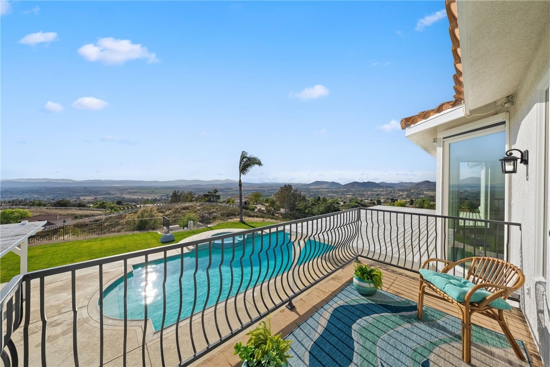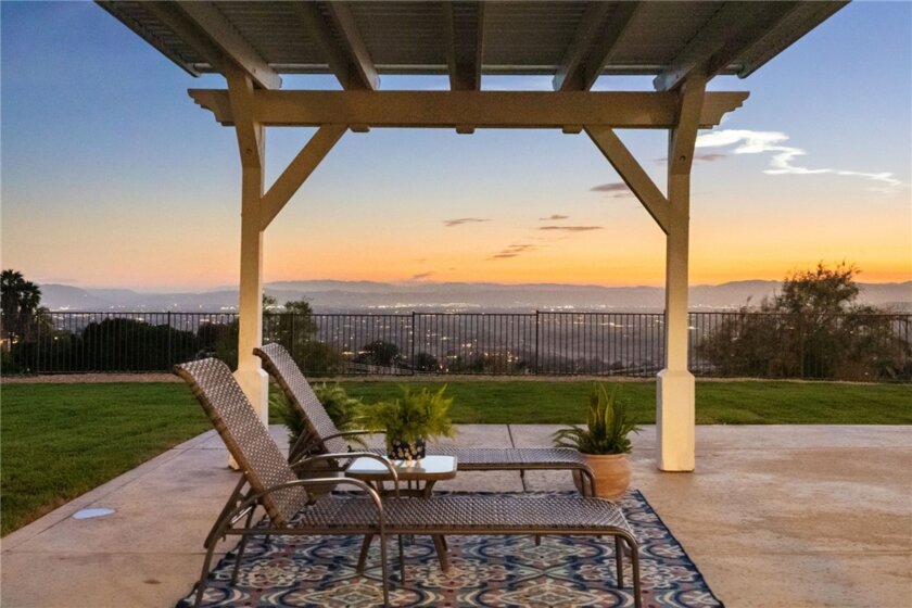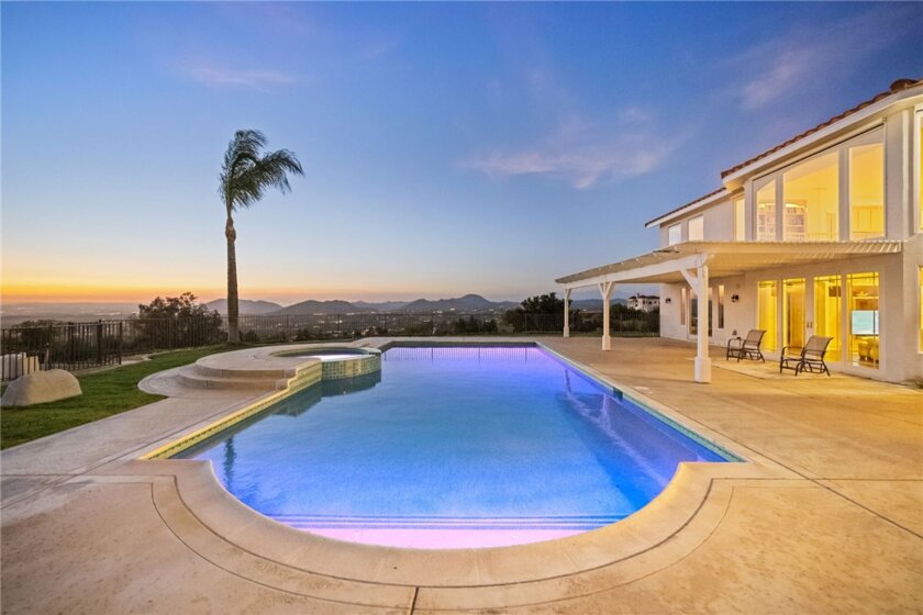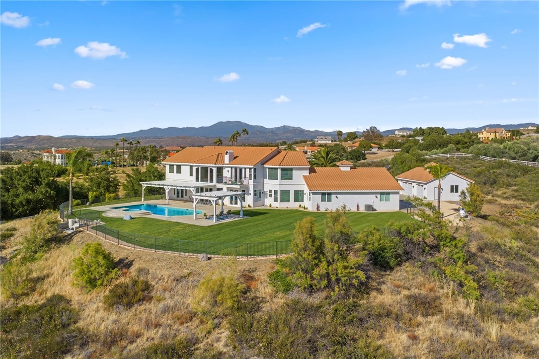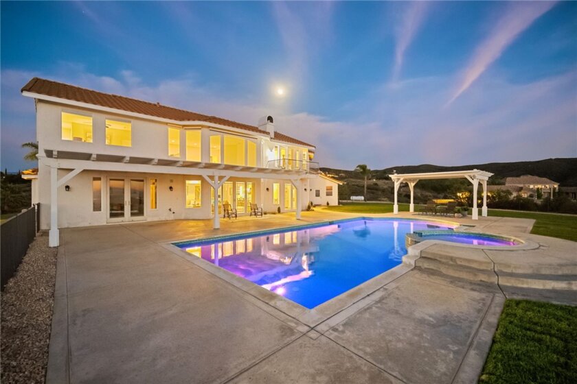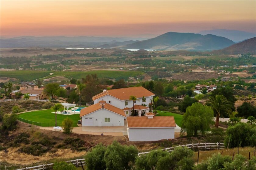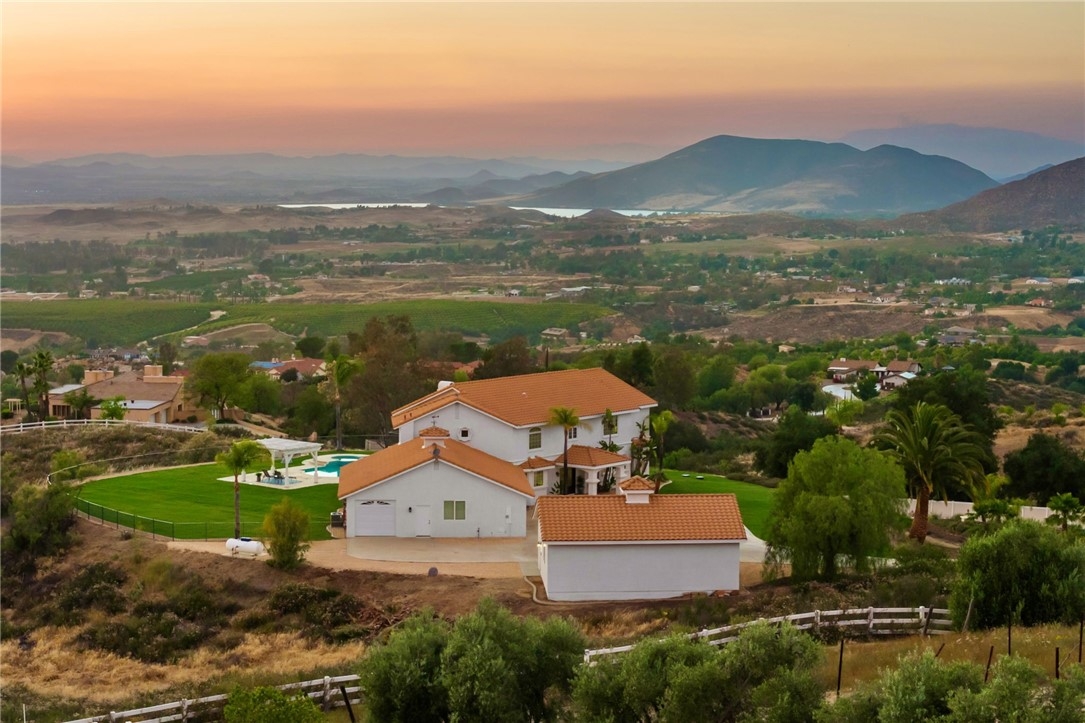 Welcome to this exceptional home in one of Temeculas most desirable locations, perched on top of a hill in Glen Oaks. With panoramic sunset views, city lights and hot air balloon sightings, this home offers a lifestyle that is truly hard to replicate. Situated on nearly 5 acres, this home was built in 2001 with a serene setting with freshly landscaped front and back lawns. The backyard is an entertainer’s dream, complete with a sparkling 43x20 pool and spa, all perfectly positioned to take in the views. Large windows throughout the home flood the interior with natural light and frame the scenery from nearly every room, while 20 foot ceilings create an open and inviting atmosphere. Spanning 4,230 sq. ft. this home features 5 bedrooms and 3.5 bathrooms, including two conveniently located downstairs bedrooms, along with a full bathroom and a guest bathroom. As you enter, you’re immediately welcomed by views of the backyard, the pool, and the bright open layout, with a central fireplace connecting the family and dining rooms. An additional downstairs room offers the perfect space for a home office with inspiring views. Car enthusiasts and those desiring extra space will appreciate the garage setup, featuring an oversized 3 car garage, an additional 2 car garage with separate access, and a detached 3 car garage, ideal for an ADU, Airbnb, workshop, or additional storage, bringing the total to 8 garage spaces. Upstairs, the layout continues to impress. The primary suite is privately situated and includes two large walk in closets, a fireplace, private balcony, spacious bathroom with dual vanities, and a versatile bonus room ideal for a nursery, office, or sitting area, all overlooking the stunning landscape. Just outside the primary suite is a conveniently located laundry room. Across the catwalk, you’ll find two additional bedrooms, each featuring spacious walk in closets and connected by a Jack and Jill bathroom. Just outside the bedroom is a library style bookshelf with lighting and continued views completing this thoughtfully designed space upstairs. Original owners have made numerous updates adding comfort and efficiency to the home. Ideal location in Glen Oaks, with paved roads, without the burden of HOA, this home offers low taxes, close proximity to wineries, and a setting that captures the very best of Temecula living. This is truly a special property that must be experienced in person. This is truly a special property that must be experienced in person.