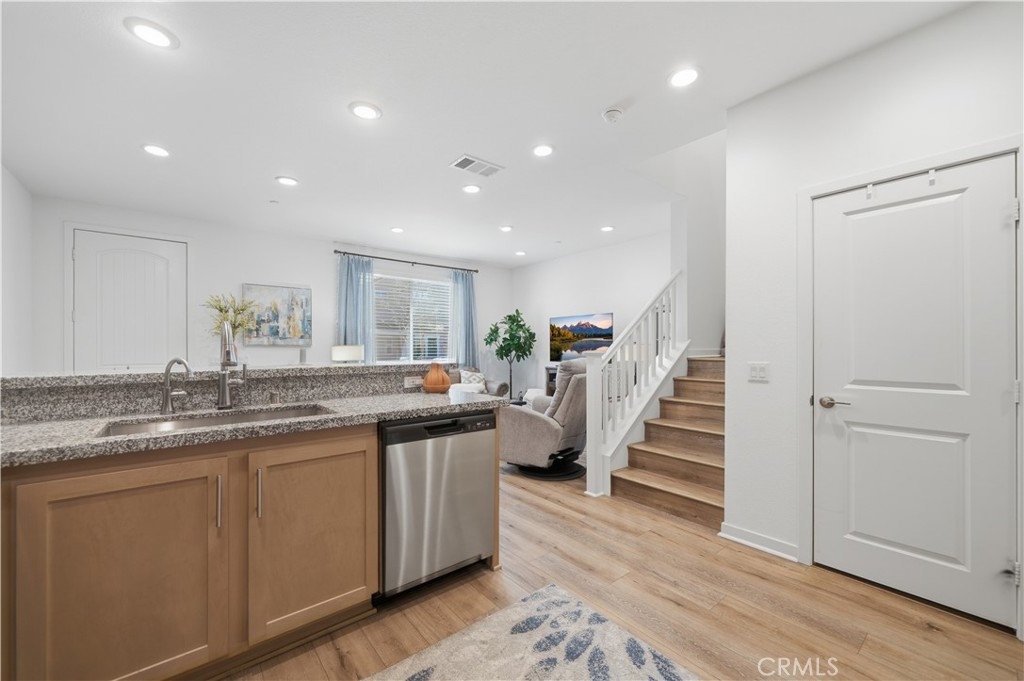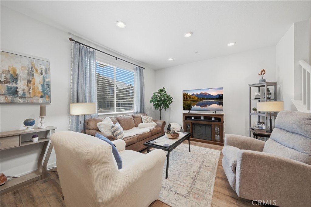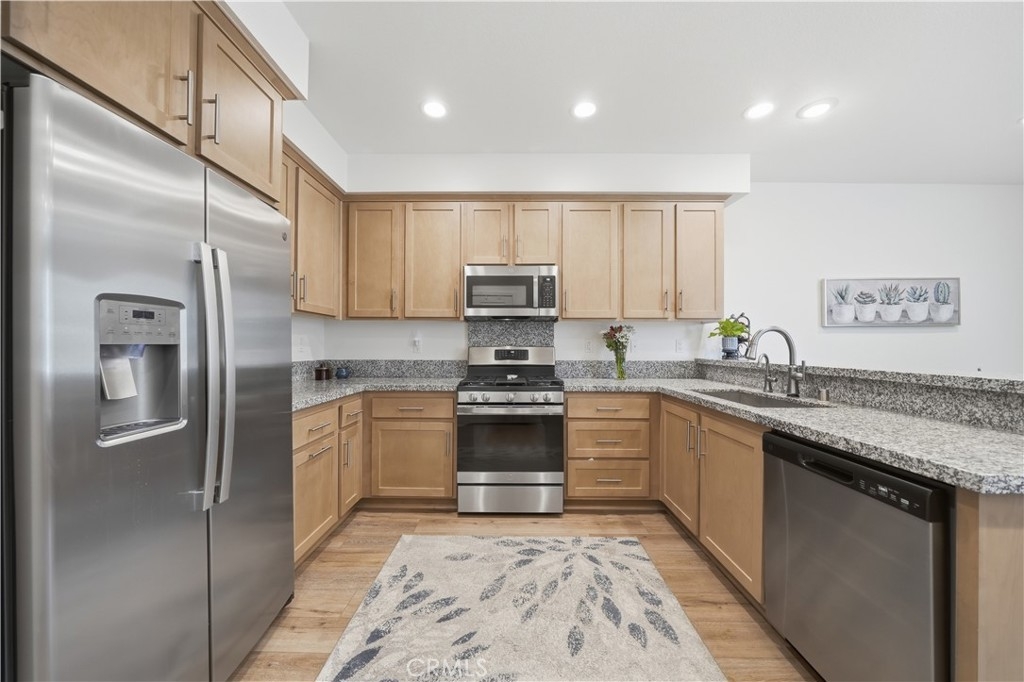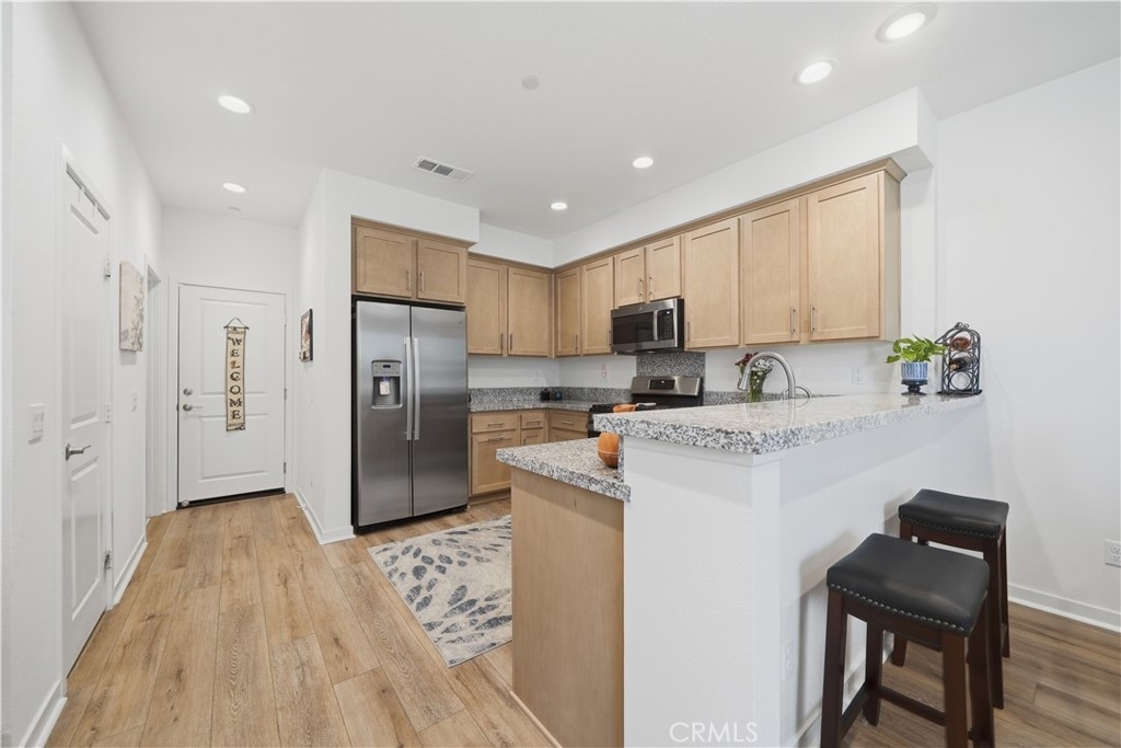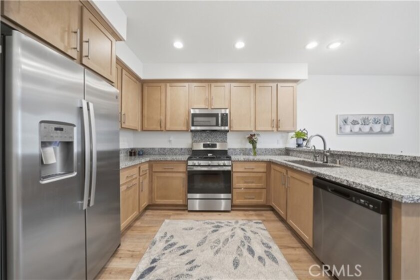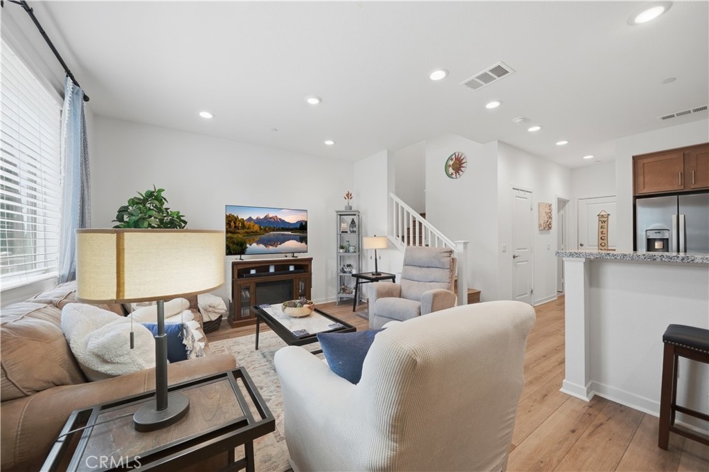 Private front porch entry sets the tone for this well-maintained 3-bedroom, 2.5-bathroom condo located in the highly desirable Sommers Bend community of Temecula. The main level offers an open-concept layout with a combined living and family room that flows directly into the kitchen, creating a nicely connected living space. The kitchen offers stainless steel appliances, granite countertops, bar seating, and ample cabinet storage—well-suited for entertaining. Luxury vinyl flooring runs throughout the main living areas. (very nice) A powder room and direct access to the attached garage are also located on the first floor. Upstairs, a spacious hallway leads to the primary suite, which features a private balcony with community views. The primary bathroom includes a separate tub and shower, dual vanity, and a large walk-in closet. Two additional bedrooms and a full hallway bathroom complete the upper level. Additional features include recessed lighting, Leased Solar, built-in elements, and a clean, well-cared-for interior. Residents of Sommers Bend have access to a range of amenities, including resort-style pools, clubhouse, fitness facilities, parks, walking trails, and community gathering spaces, all within close proximity to schools, shopping, and Temecula Wine Country! Welcome Home!