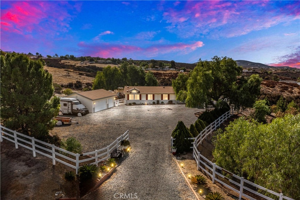 VIEWS! VIEWS! VIEWS! Welcome to the beautiful Temecula Wine Country community of Spanish Hills Ranchos tucked back off of East Benton. This beautiful equestrian community is located only minutes from Temecula's award winning wineries, restaurants, shopping and dining locations. Escape to your private retreat situated on 5 serene acres! Come explore this charming 3 bed, 2 bath home with covered porch and detached 3-car garage! This property is very unique offering the perfect blend of comfort and seclusion. A thoughtfully designed, open floor plan features spacious living areas filled with natural light, tasteful upgrades and Awe-inspiring views from every window! In the heart of the home you'll find a large kitchen complete with granite counters, custom cabinetry, dual-oven stove and a peninsula island with bar seating. This chef's kitchen flows seamlessly to the dining room- ideal for serving meals and entertaining. The main living area offers a cozy fireplace, perfect for those cooler Temecula evenings. Down the hall you'll discover 3 bedrooms including the primary bedroom featuring a massive closet and private bath with free-standing dual-sink vanity and spectacular custom step-in shower! A full secondary bathroom and spacious laundry room complete the home. Outside you'll immerse yourself in nature. Ample covered sitting areas combined with raised gardens lead to private on-site hiking trails that wind through the picturesque property where you'll experience breathtaking views of the surrounding landscape. During the rainy season, enjoy a seasonal creek flowing through the land, adding a touch of tranquility to your outdoor adventures. This property is ideal for those seeking seclusion while remaining close to the attractions of Temecula, including world-class wineries, charming shops, and fine dining. This unique property has room to add an ADU! HAS RV PARKING! LOW TAXES! Come live in harmony with nature!