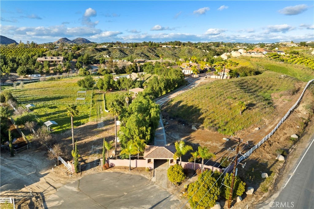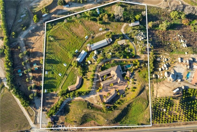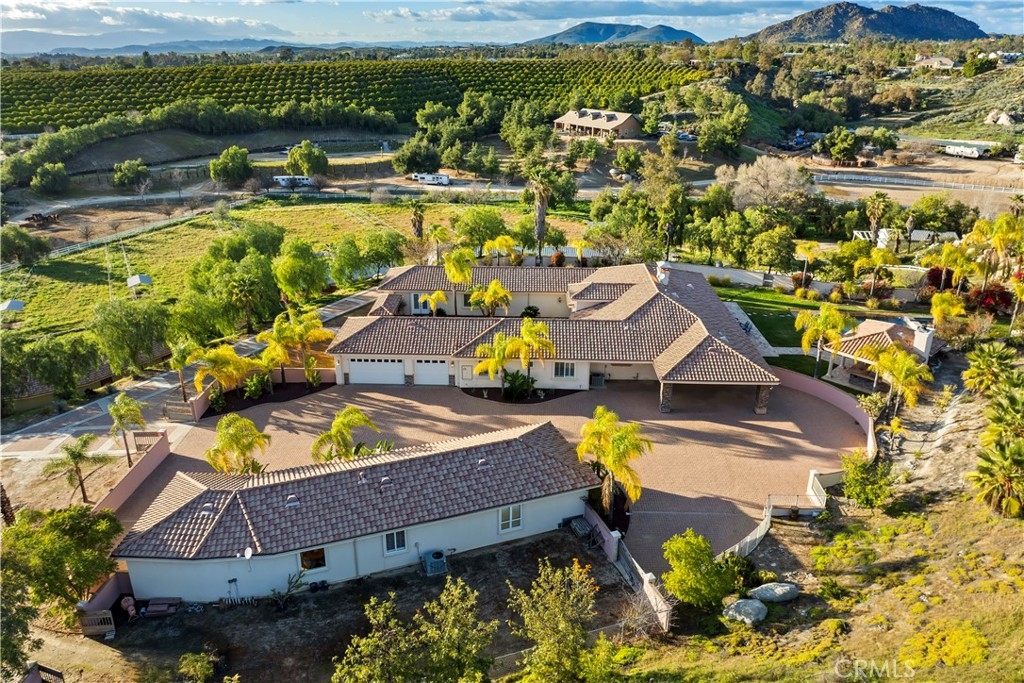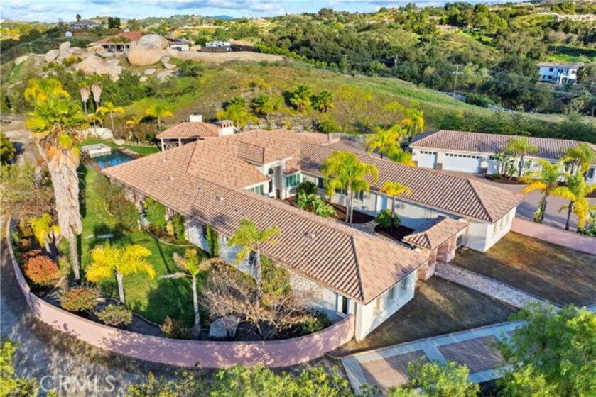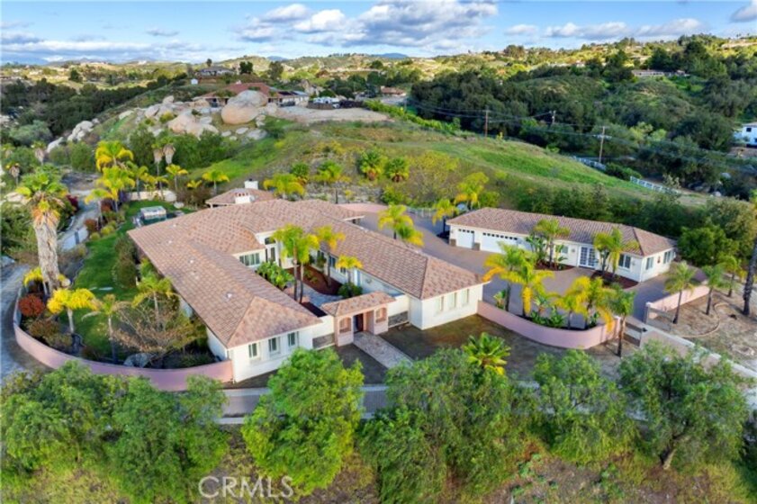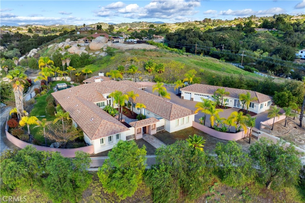 This is a rare opportunity to own a private Wine Country estate that seamlessly blends natural beauty, usable land in one of Temecula’s most desirable locations.Wake up to hot air balloons rising in the early morning sky and unwind with breathtaking sunsets over your own private estate! Spanning approximately 5,507 square feet, this custom-built 5-bedroom, 5-bath residence sits atop 9.15 acres of scenic land. A detached 1,000-square-foot guest villa (1 bed, 1 bath ADU) with ideal flexibility for multi-generational living, guests, rental income, or on-site staff.A long custom paver driveway leads up the hill to the home, creating a grand sense of arrival. At the entrance, you’re welcomed by an expansive courtyard-style setting (atrium), allowing natural light to pour into the surrounding rooms and enhancing the home’s bright, airy feel throughout.Inside, soaring high ceilings and crown molding elevate the space. The open-concept kitchen and family room form the heart of the home, designed for both entertaining and everyday living. The chef’s kitchen features high-end stainless steel appliances, including matching Viking refrigerator and freezer units, a Fisher & Paykel 6-burner range, and a Thermador oven. The kitchen opens seamlessly to the family room with custom cabinetry and a fireplace, while formal living and dining rooms with elegant spaces to host guests.The bedroom layout is thoughtfully designed for privacy and comfort. In addition to the magnificent primary suite, two secondary bedrooms share a well-appointed Jack-and-Jill bathroom, while two additional bedrooms each enjoy their own private en-suite bathrooms. A spacious loft with high ceilings—currently set up with a ping pong table—serves as a versatile entertainment area, perfect for a game room, media space, or lounge. Both the primary suite and the living room feature French doors that open directly to the backyard, where you can enjoy the custom pool and beautifully designed BBQ area—ideal for relaxing afternoons or hosting unforgettable gatherings under the Wine Country sky.Equestrian facilities include horse stalls, a mare motel, barns, and pasture areas. With six garage spaces, abundant additional parking, and room to accommodate multiple RVs, this property is also a dream for car collectors and outdoor enthusiasts.A true Temecula Wine Country lifestyle, versatility, privacy, and long-term value in one extraordinary setting.
