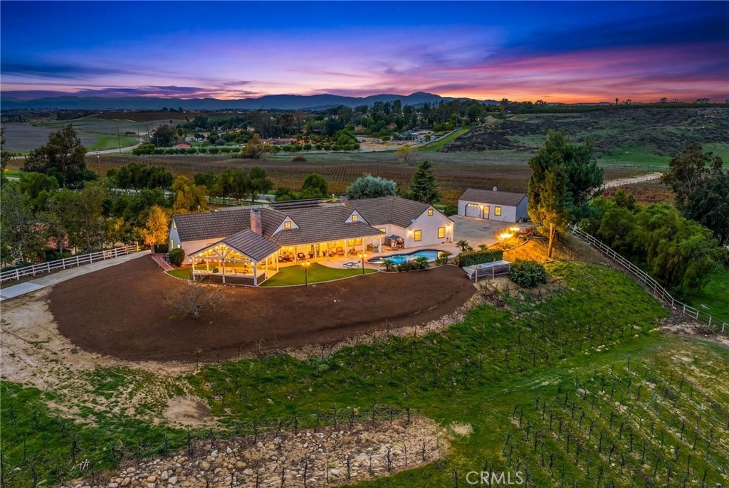 SPECTACULAR MODERN FARMHOUSE ESTATE IN GLENOAK HILLS! Perched on an elevated 3.01-acre lot with breathtaking views, this masterfully upgraded residence at 40333 Chaparral Drive offers the ultimate Wine Country experience. The main home features 4 spacious bedrooms, 3 bathrooms, and a versatile office/loft configuration. The downstairs Master Suite provides luxury and convenience with a spa-like bath and walk-in closet. Inside, you will find hardwood flooring, a stunning wood staircase, and a remodeled kitchen with GE Cafe appliances. The open-concept layout includes a large living room with a cozy fireplace and a separate formal dining room. The grounds are a private resort featuring a sparkling pool and spa, an expansive outdoor kitchen, artificial turf, and a custom putting green. A separate, fully finished detached guest house offers additional living space or rental potential. The property is secured by a gated entrance and features a long paved driveway leading to an oversized 4-car garage with ample storage. BONUS: The house solar system is FULLY PAID FOR. Low HOA and scenic GlenOak Hills community amenities (tennis, clubhouse, trails). From the panoramic valley views to the meticulously manicured grounds, this GlenOak Hills masterpiece is ready to be your private sanctuary. Properties of this caliber—offering paid solar, a guest house, and an oversized 4-car garage—are a rare find in Temecula. Don’t miss your opportunity to own the dream—schedule your tour of this Modern Farmhouse today!