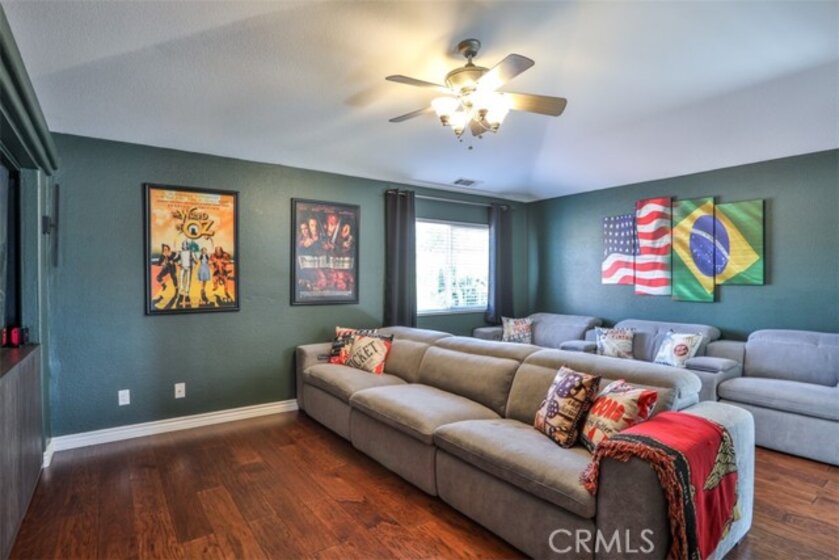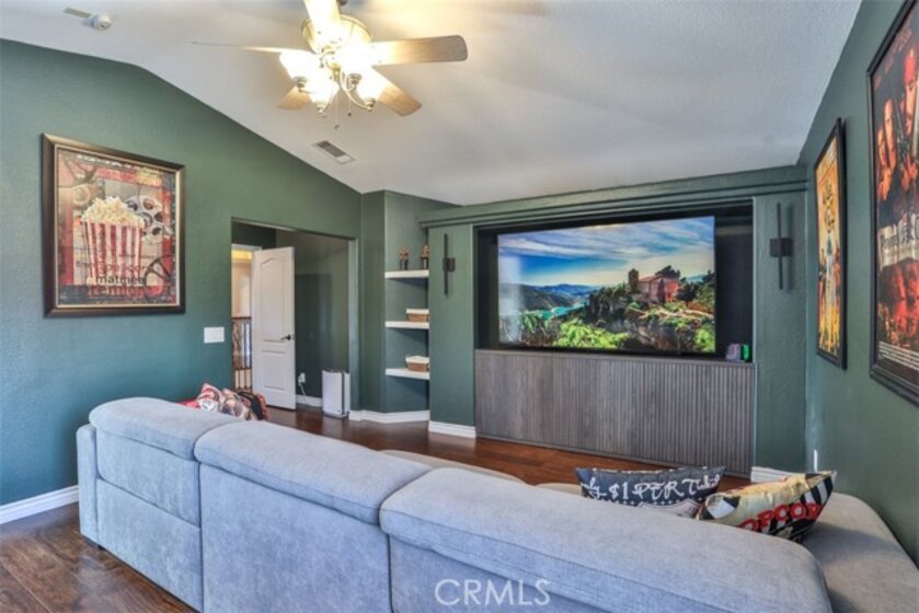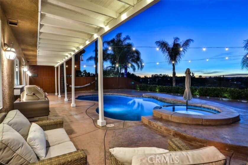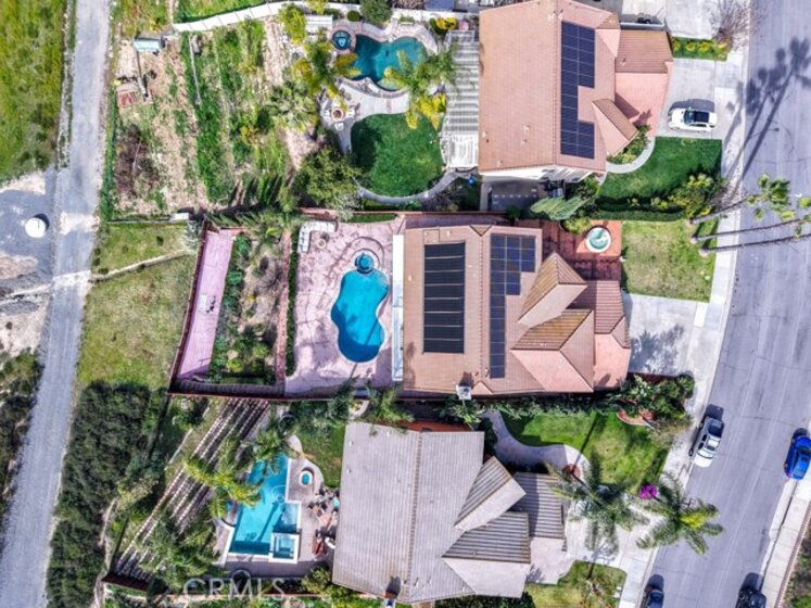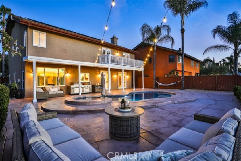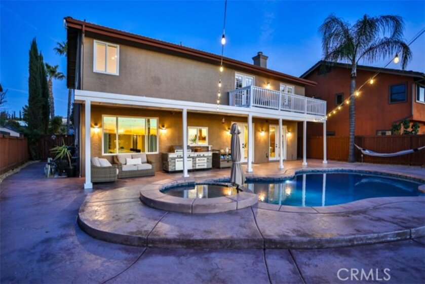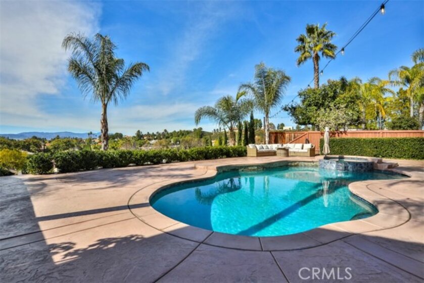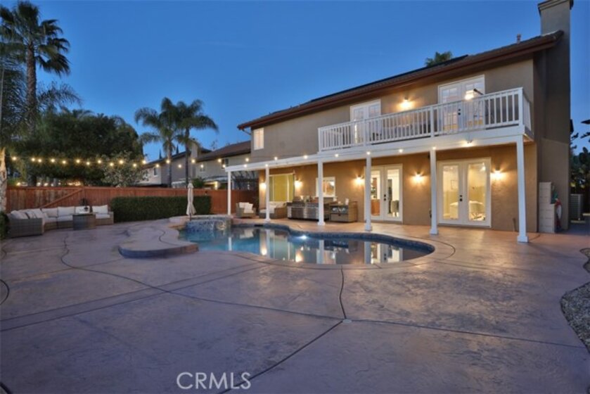Elegant, Sophisticated and Spacious Temecula Residence in Quiet Neighborhood. Inviting Curb Appeal and Charming Water Fountain Lead to Beautiful Double Door Entry. Impressive Foyer, Living Room and Formal Dining Room are Flooded with Natural Light and Gorgeous Lighting Fixtures and Chandeliers Throughout the Home Add Sparkles and Glam. Stylish Kitchen Includes Center Island, Coffee Bar, Walk-In Pantry and Opens to Cozy Family Room with Fireplace and Two Sets of French Doors Leading to Wonderful Backyard. Main Level Also Includes Bedroom/Office, Bathroom and Laundry Room with Direct and Convenient Access to Backyard for Your Pool Guests. Elegant Staircase Leads Upstairs to Luxurious Primary Suite with Vaulted Ceilings, Oversized Soaking Tub, Separate Shower, Two Walk-In Closets with Organizers and Double Vanity. Two Additional Bedrooms Have Direct Access to Large Balcony to Enjoy Forever Views and Spectacular Sunsets. Unwind and Relax in Your Private Theater and Enjoy Endless Movie Nights on a Large Screen TV. Home Theater Can Be Easily Turned Into Second Master Bedroom, and it Includes Spacious Bathroom. Dedicated Home Office/Work/Study Space with Four Desks Is Also Located Upstairs. Enjoy Entertaining in Style; Sparkling Salt Water Pool, Spa and Oversized Patio. BBQ Island is Included. Step Down to the Orchard with Numerous Fruit Trees; Lemon, Lime, Orange, Apple, Asian Pear, Plum and Peach. Relax on Your Bottom Patio, or Treat Yourself to Yoga or Workout Session. Opportunity to Plant More Trees or Grow Your Garden on the Remaining Part of Your 1/3 Acre Lot. Close Proximity to Town, Excellent Schools, Shopping, Dining, Golf and Temecula Wine Country. No HOA, Low Property Tax Rate, Paid Solar System. This Truly Stunning Property is Perfect Blend of Luxury and Comfort. 3.25% Assumable Loan for Qualified VA Buyers. Welcome Home!