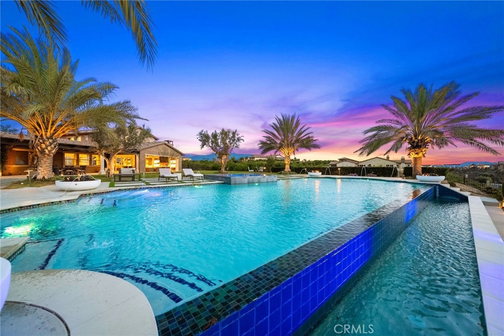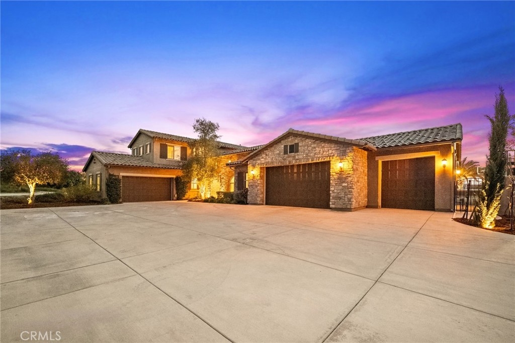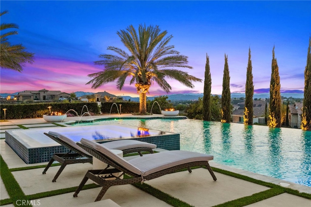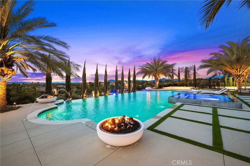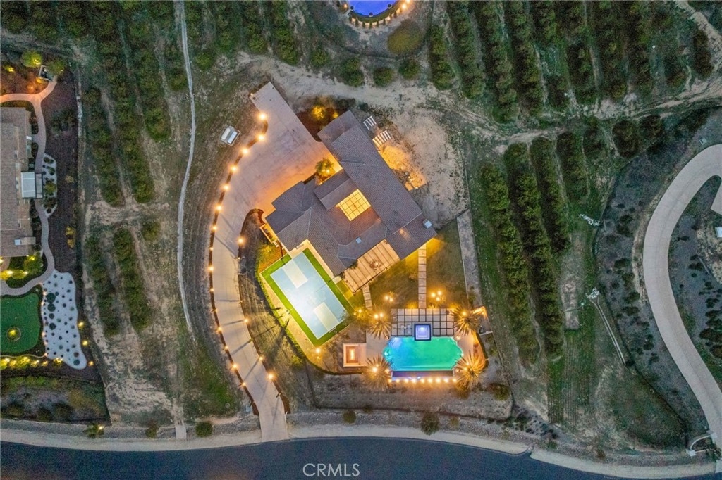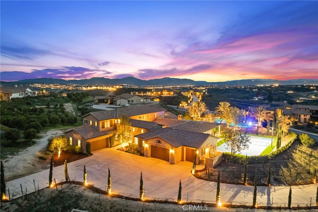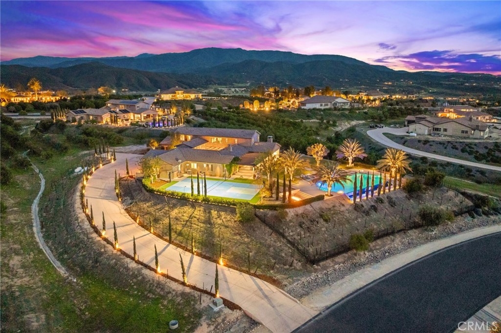 Welcome to luxury living in The Groves, one of Temecula’s most sought-after gated communities with low turnover. This stunning 6-bedroom, 6.5-bathroom estate was built in 2017 and sits on 2.08 acres of usable land, offering the perfect blend of elegance, comfort, and resort-style amenities. As you arrive, a long private driveway lined with stately Italian cypress trees leads you to this magnificent 5,287 sq. ft. home. The backyard is an entertainer’s dream, featuring a near 60-foot infinity-edge pool, a large spa, and elegant pavers with turf inlays, all surrounded by lush cypress trees and palms. The expansive yard includes a sport court, ideal for tennis, pickleball, basketball, and more. A sprawling grass area adds to the home’s outdoor appeal, while a block wall discreetly conceals the pool equipment. The covered California room extends the home's luxurious outdoor living space, complete with a fireplace, outdoor heater, electric shades, and a spacious dining area—all perfectly positioned to take in breathtaking sunset views. Additionally, a large pad on the side of the home is ready for an RV garage with hookups already in place. Inside, the thoughtfully designed floor plan offers a first-floor primary suite with a private retreat and oversized walk-in closet. The master bathroom features an expansive walk-in shower for a spa-like experience. An additional secondary bedroom with an en-suite bath on the main level provides a private space for guests or multi-generational living. The heart of the home is the chef’s kitchen, boasting high-end appliances, two dishwashers, and picturesque backyard views. Oversized stackable glass doors seamlessly blend indoor and outdoor living, while an additional large slider opens to a serene central patio with beautiful tile flooring. A wine cellar and a second kitchen area in the front wing enhance the home’s functionality and style. Upstairs, a spacious loft and additional bedrooms, each with en-suite bathrooms, provide ample privacy and space for family members or guests. Located in a secure, gated community with wide roads perfect for walks and play, this estate offers an unparalleled lifestyle in Temecula Wine Country. With a 5-car garage and ample parking, this property is as practical as it is luxurious.