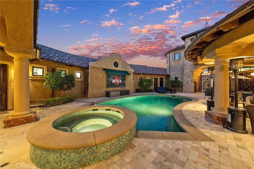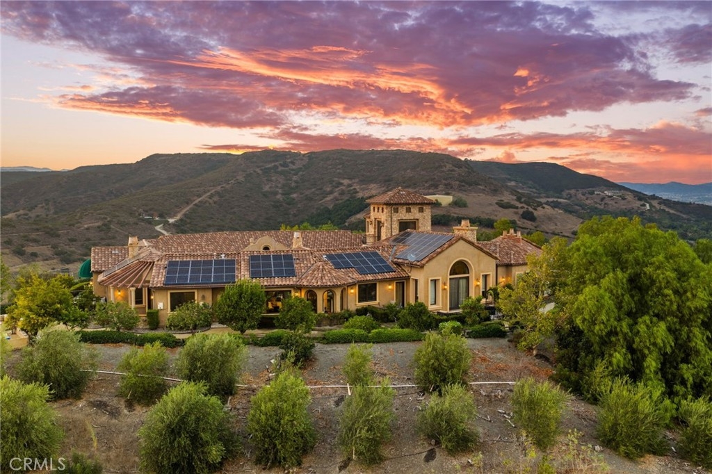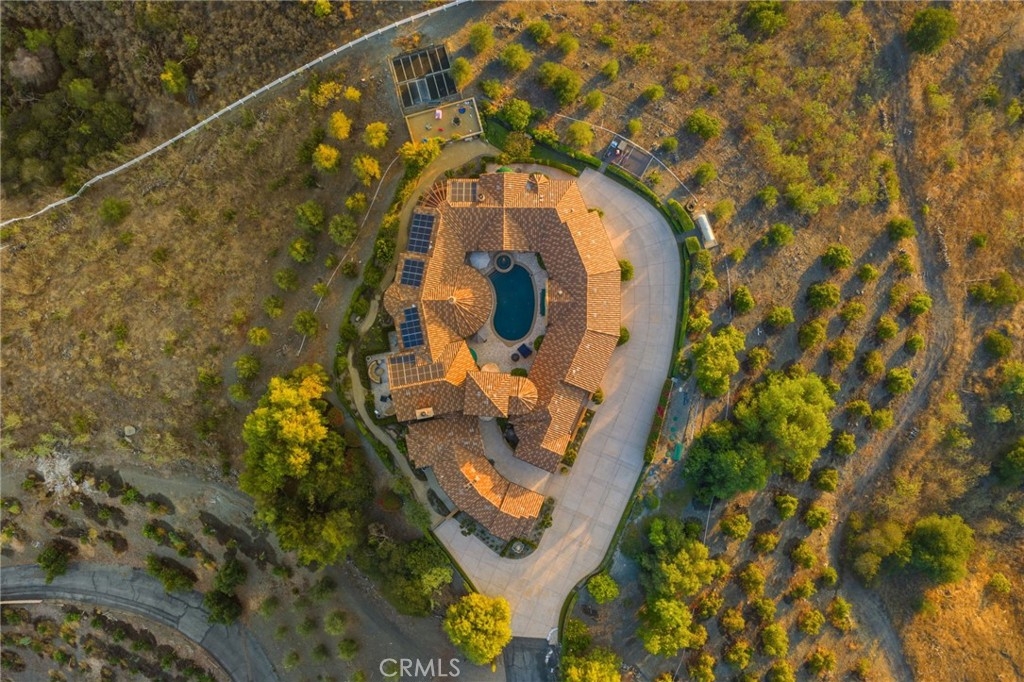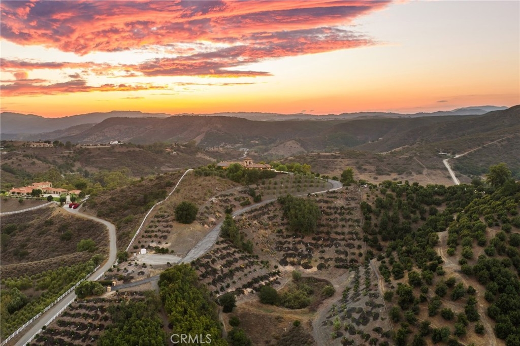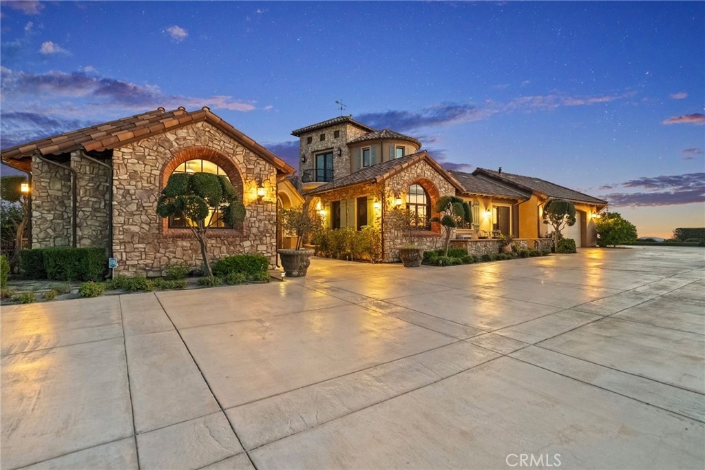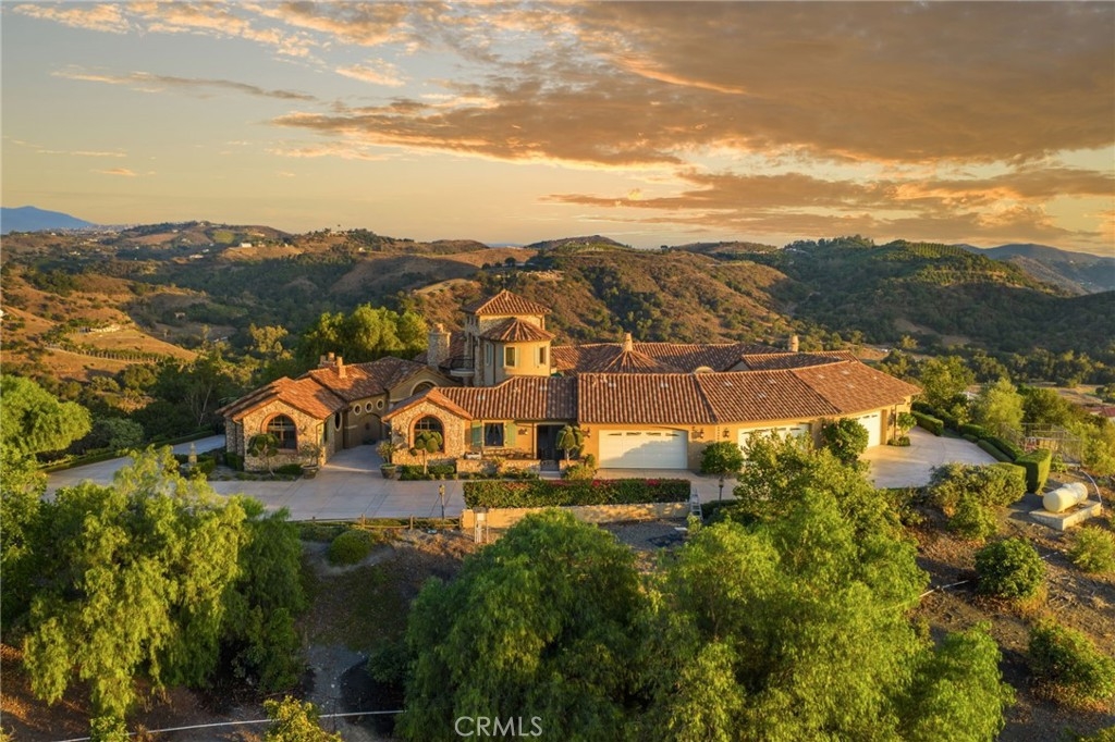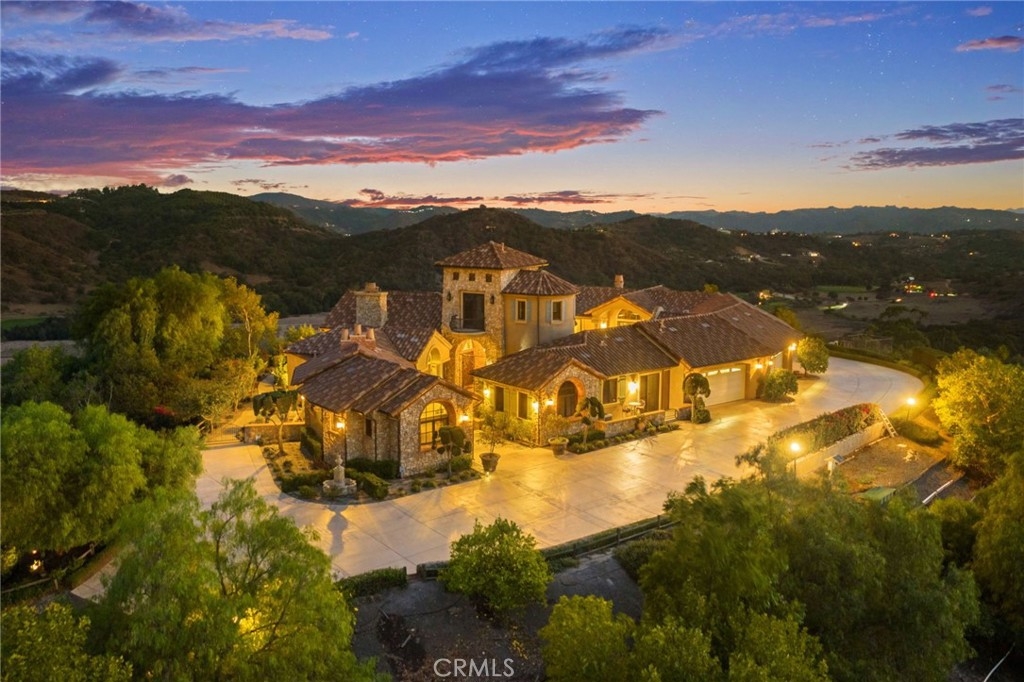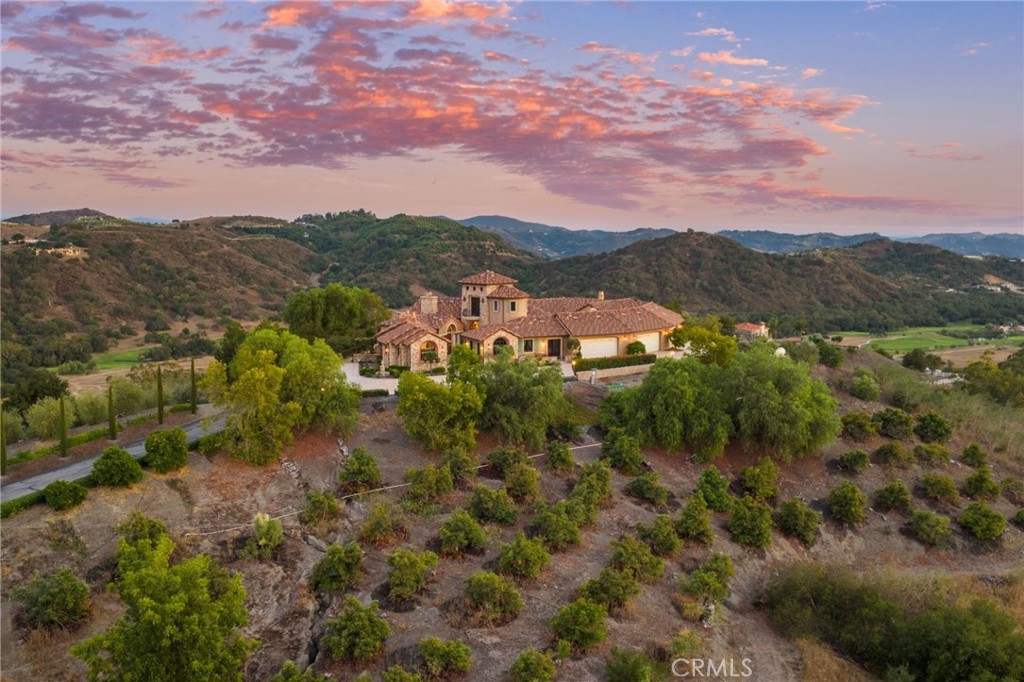 Welcome to Villa Girasole, a breathtaking Tuscan-inspired estate gracefully perched atop 15.6 acres in Temecula’s prestigious De Luz community. Evoking the romance of Italy’s hill towns, this architectural masterpiece blends old-world craftsmanship with modern luxury, surrounded by rolling vineyards, olive trees, fruit orchards, and hundreds of mature, producing avocado trees that blanket the hillsides in timeless beauty. Spanning approximately 6,588 square feet, this single-level residence was designed for both grand entertaining and intimate living. The thoughtfully curated floor plan features six bedrooms, seven bathrooms, a private executive office, a state-of-the-art home theater, and the signature Nexus tower. The tower boasts a stunning architectural focal point of the property, offering a curved staircase, arched windows, and panoramic balcony views of the Temecula Valley. A separate, fully appointed casita with its own entrance, kitchen, living room, bedroom, and bath provides luxurious accommodations for guests or extended family. At the heart of the home lies an extraordinary open-air piazza, an architectural centerpiece that connects every main living space. The saltwater pool and spa are sheltered within this elegant courtyard, framed by an outdoor fireplace, built-in BBQ, and a retractable projector for movie nights beneath the stars. This piazza was intentionally designed as the social core of the estate, offering a space equally suited for serene mornings or lively gatherings. Inside, the attention to detail is unmatched. Vaulted wood-beamed ceilings, handcrafted brick archways, and intricate stonework create a sense of timeless permanence. The gourmet kitchen is a culinary showpiece, featuring dual center islands, a La Cornue range, built-in refrigerator, walk-in pantry, and an effortless flow into both casual and formal dining areas. The primary suite serves as a tranquil retreat, complete with a cozy fireplace, spa-style bathroom, soaking tub, and views that stretch over the groves and valleys beyond. Additional highlights include a six-car garage, four tankless water heaters, a private well with a 5,000-gallon storage tank, and thoughtfully placed olive and fruit trees enhancing the estate’s agricultural charm. Villa Girasole is not just a home; it is a statement of elegance, privacy, and craftsmanship. A true sanctuary where architectural artistry meets the serene beauty of Temecula.