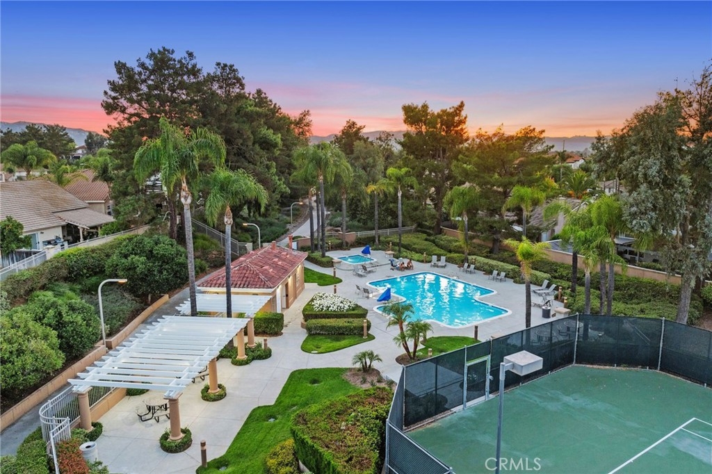 Ideal Paloma Del Sol location at the end of a cul-de-sac and a super short walk to a community pool and tennis courts. Wonderful single story floor plan with great architectural details. Spacious living and dining room with high ceilings and arched entry into the bright and airy open kitchen with granite counter tops and center island with a counter for a quick breakfast or lunch. The family room and kitchen open to a patio and private backyard with mature shade trees. There is a fireplace in the family room/kitchen area and a travertine look tile throughout the entry and into the kitchen that is a lovely neutral color. The primary bedroom and bath are located at rear of the home and open to the backyard for privacy & quiet. The primary attached bathroom has dual sinks, private tub & shower, a private toilet area and walk-in closet. Two spacious bedrooms plus second bathroom add to the charm of this home. The laundry room is conveniently located next to the bedrooms. This community has incredible amenities. You'll love all that Paloma Del Sol has to offer, from the 5 sparkling swimming pools and spas, 3 lighted tennis courts, miles of running/walking trails and 100 + acres of parks, picnic areas, basketball courts, recreation areas, greenbelts and more. All this and you are in the award-winning Temecula school district too! This delightful home is close to Pechanga Casino, Temecula Valley wineries and world class golf and Old Twon Temecula with its renowned dining, shopping and entertainment.