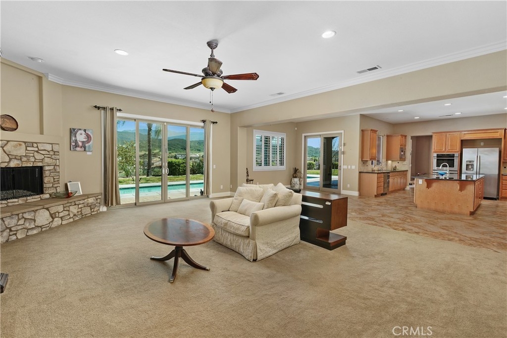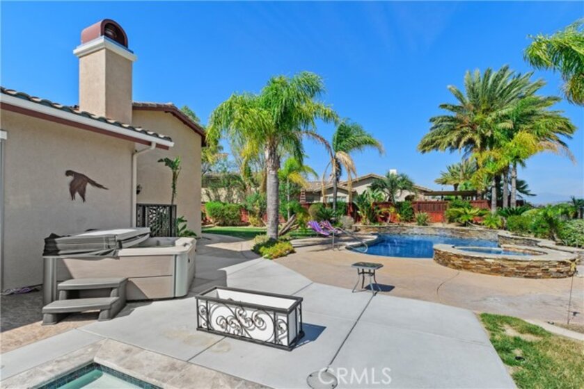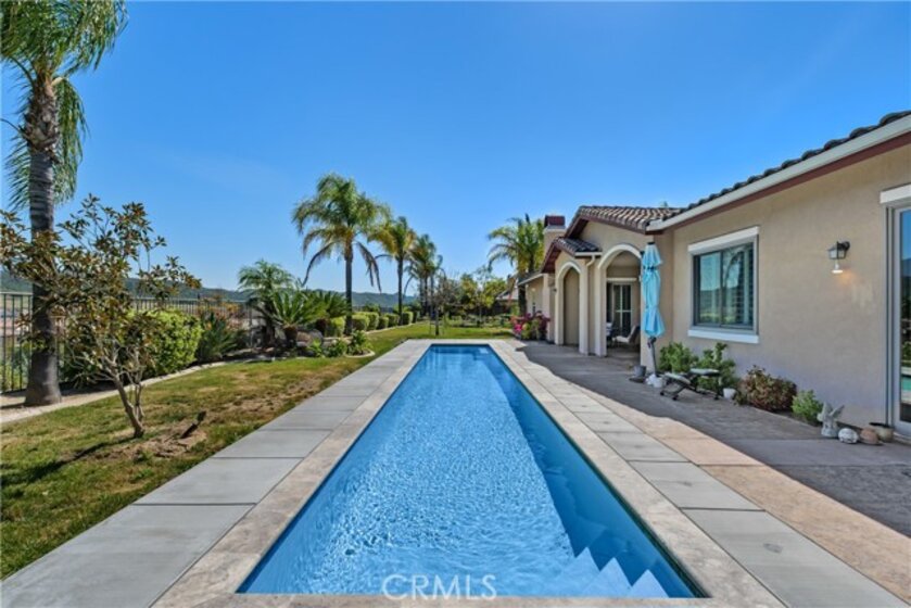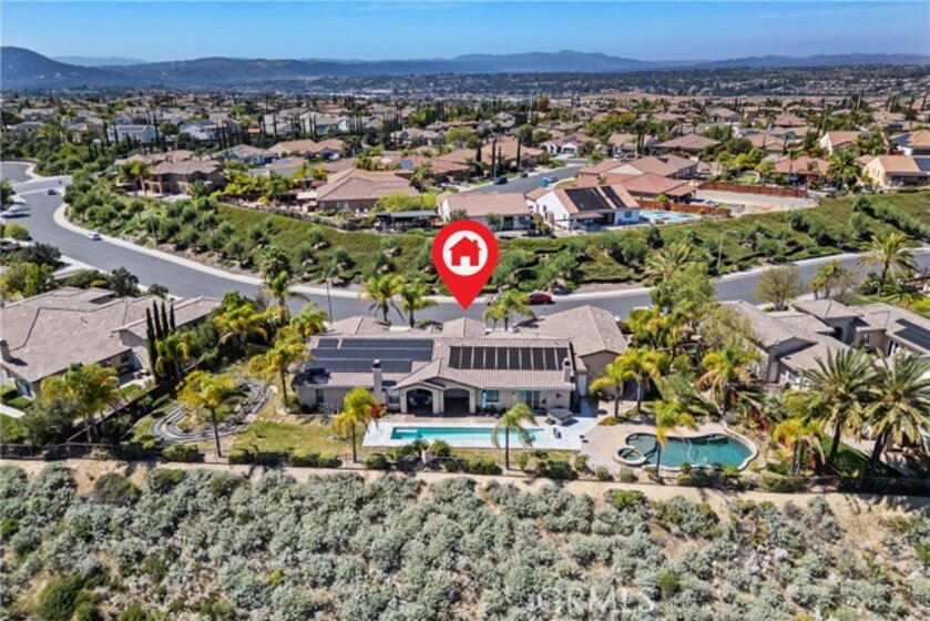 Discover your dream home nestled in Morgan Hill on Frogs Leap Street, the most desirable neighborhood in the Temecula area. This spacious 5 Bedroom, 3 Bath home, on approximately one-half acre, boasts panoramic views of mountains with ranches below, offering a peaceful retreat for relaxation and inspiration. Host gatherings by the sparkling pool or stay fit with the dedicated lap pool. Relax in the hot tub. The interior features neutral colors, crown moldings, custom shutters, a dining room with a coffered ceiling leading into a beautiful living room. Hallways lined with ample storage cabinets. Dream kitchen with granite counters, stainless steel appliances, complete with a large island, walk-in pantry and tile floor opens into the relaxing family room with a cozy fireplace. The main bedroom overlooks the scenic landscape and leads to an expansive backyard under roof lanai. Four additional bedrooms, including one used as an office, provide plenty of space. The property also features a relaxing rose-lined zin garden path. Owned solar has a battery for power storage. The 3-car garage could also accommodate RV storage, and has an EV car charger, central vacuum, and water softener. Morgan Hill Club House is located just doors down the street, HOA amenities include large pool and toddler pool, tennis court, basketball court, gym, kitchen, entertainment areas, and a room for children’s activities and play yard. Enjoy luxurious living in a tranquil environment that feels like a daily escape. Schedule a private showing today.