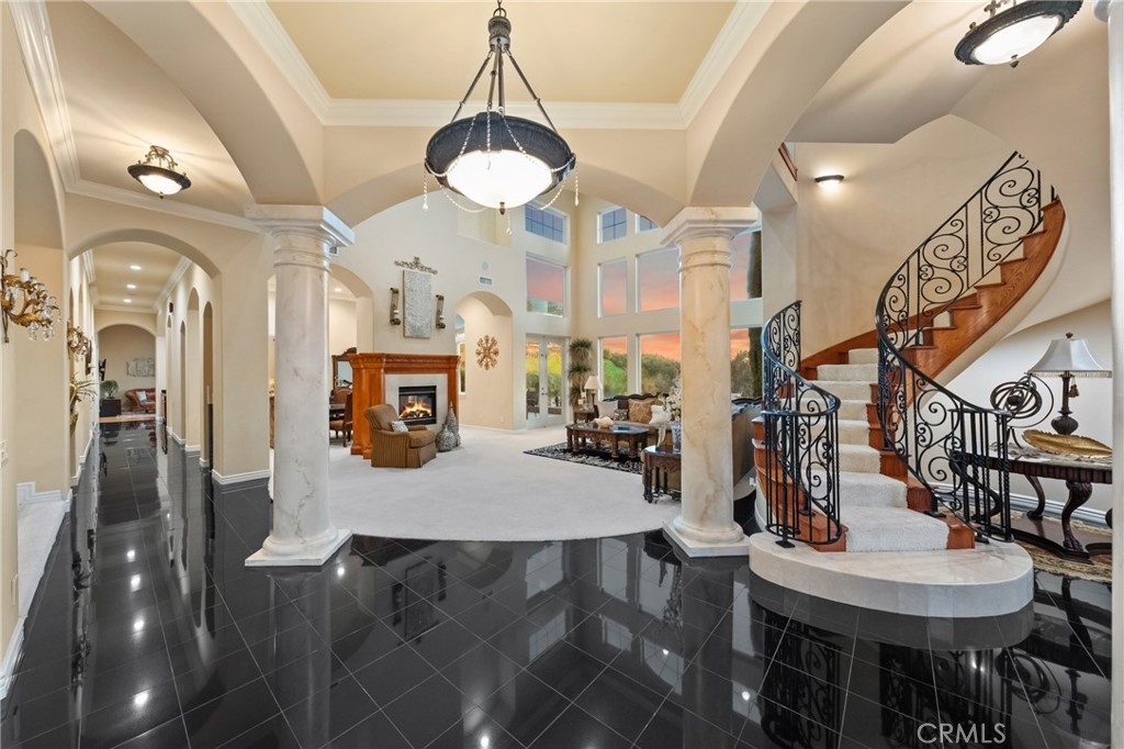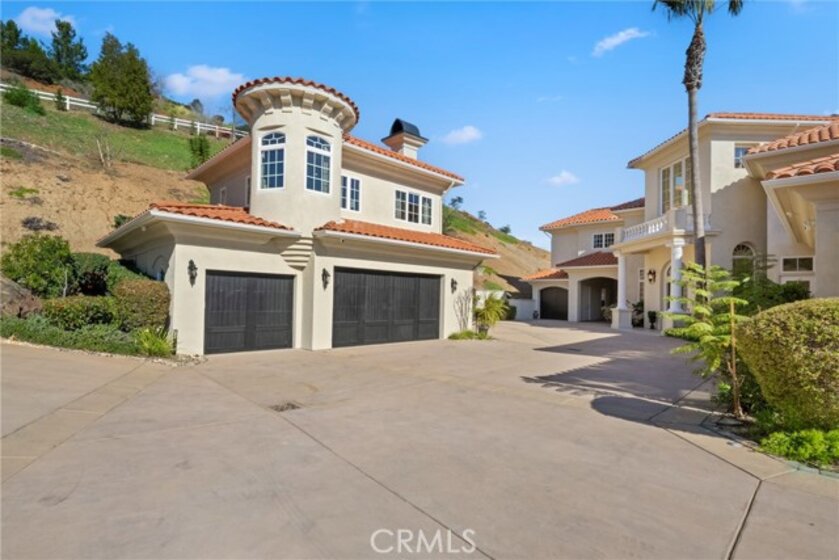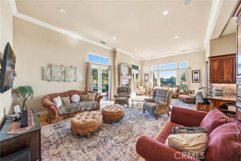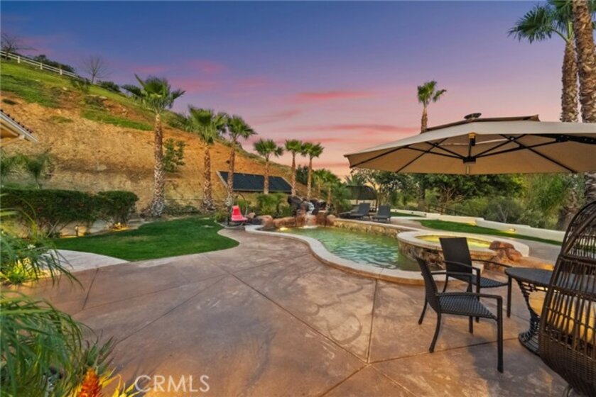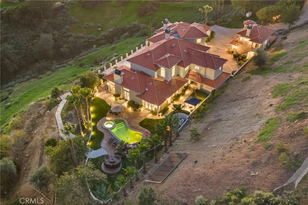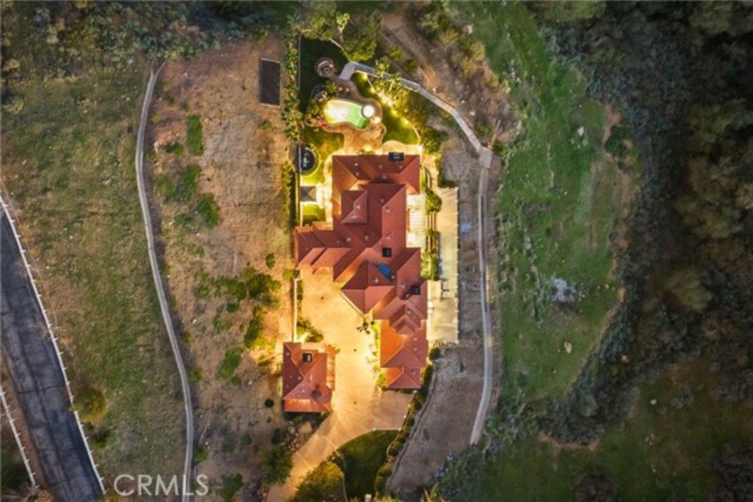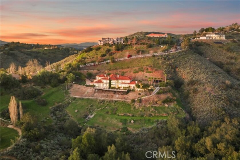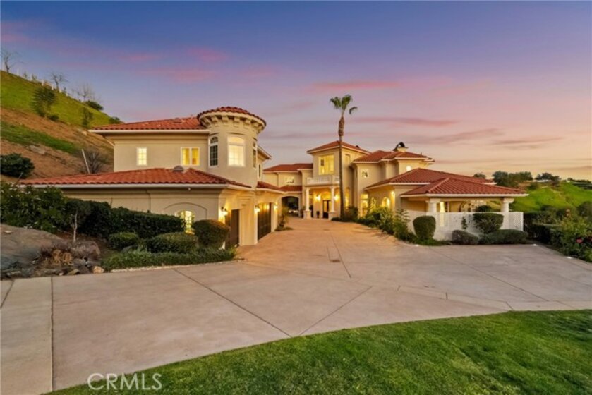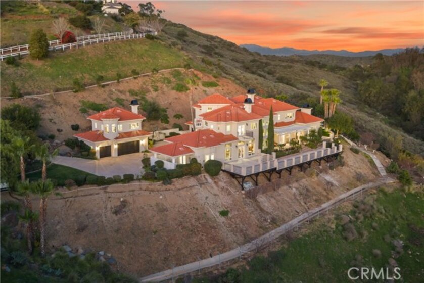 A breathtaking luxury estate in the prestigious gated Renaissance Estates community where timeless architecture converges on five acres and over 7,000 square feet of living space. Masterfully built, this residence has panoramic picturesque views of surrounding hills and valleys, tranquility and privacy. Experience high-end living, impeccably maintained landscapes, and various fruit trees, creating an atmosphere that elevates daily living just minutes from Old Town Temecula. The main residence welcomes you through glass double doors and cathedral ceilings with clerestory windows, illuminating the living room with Temecula’s stunning sunrise. Downstairs unveils a unique theater space and a ready-to-install elevator that makes this home stand out from all the rest. A formal dining room with a fireplace is adjacent to the gourmet kitchen that includes a center island with granite countertops, wine rack, butler's kitchen, high-quality milled wood cabinetry, reverse osmosis water system, and top of the line Bertazzoni six burner stove top with electric griddle. In the right wing, you’ll find the primary spa-like suite, which includes a jetted tub, double vanities, oversized closets, and double doors leading to the sweeping terrace overlooking majestic hills. The left wing offers another commodious guest suite with its own entry doors to the home. As you pass through corinthian marble pillars and walk up the grand staircase, you’ll find five spacious ensuite bedrooms with generous closet spaces, bathrooms, and a bonus room with built-in shelving. Additional home features include thirteen foot ceilings, a laundry chute, and lots of storage space. Entertain with ease when you step into the outdoor living space where you’ll find a spa, pool with its own paid-off solar, and a winding path leading you down to multiple fruit trees and vines. The separate guest house above a two car garage offers multi-generational living and includes a full kitchen, living room, one bedroom, and a full bath. Outdoors you’ll also find an additional car garage, comprehensive security system, and a brand new Generac generator with wifi. This home is a rare opportunity to own a private luxury residence in the heart of De Luz with close access to the 15 freeway.