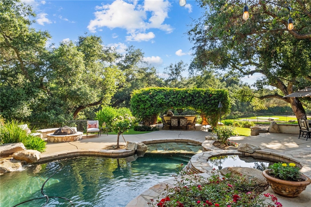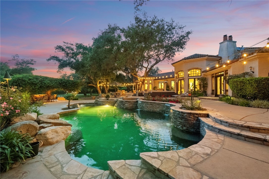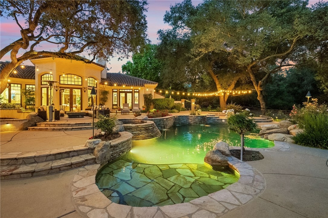 Tucked beneath a canopy of majestic oak trees, this breathtaking single-story estate spans 4,507 sq ft w/ 5 bdrms, 4.5 baths, & unparalleled artisan details, this architectural jewel designed w/ intention by renowned architects John Scholz & Dennis Orr blends timeless Old World Mediterranean charm w/ modern functionality & one of a kind craftmanship. Hand-troweled plaster walls, deep-set custom Portofino windows, custom Portofino doors, cedar-lined ceilings, & three fireplaces create warmth & elegance. The chef’s kitchen features a built-in Sub-Zero fridge, Thermador range, Miele dishwasher, walk-in pantry, solid wood cabinets & hand-designed tile details. The luxurious primary suite includes French doors to the pool, fireplace, soaking tub w/ garden view, dual shower heads, dual sinks, custom built-ins, & walk-in closet. One secondary bdrm is ideal for an office or nursery, while three others offer ensuite baths & privacy on the opposite wing. Outdoors, a year round creek flows through the property bordered by stone paths, a saltwater pool/spa, w/ flagstone decking, paid solar, solar pool heating, & a roof of hand-laid Deleo tiles in a European style blend. Located just minutes to Old Town Temecula, this is more than a home – it is a generational estate crafted to inspire.