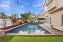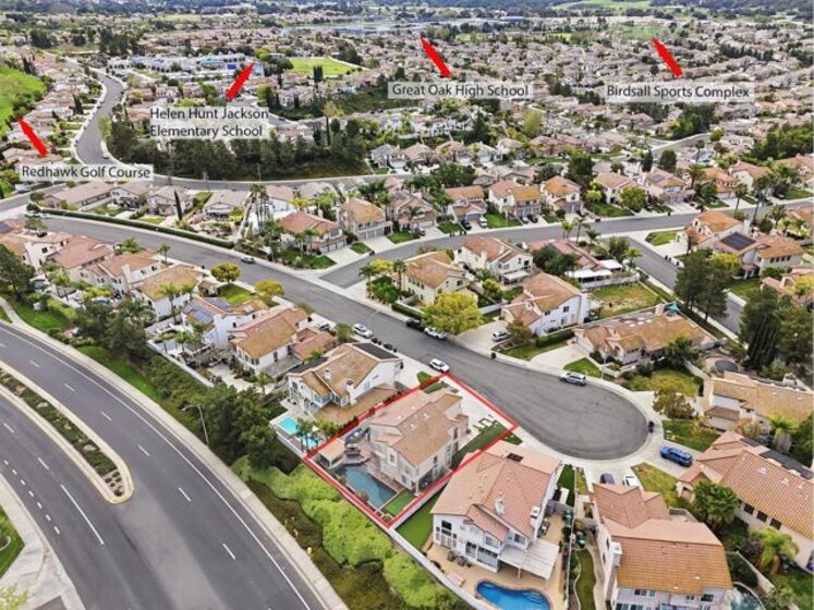 Welcome to a rare opportunity in the highly sought-after Redhawk community of Temecula. This beautifully updated 5-bedroom home (4+1 bonus, currently a dance studio), proudly owned and meticulously maintained by the original owner, is ideally located on a quiet cul-de-sac and within walking distance of top-rated schools, including the award-winning Great Oak High School. The private backyard is the true highlight of the home. With no neighbor directly behind, it offers a resort-style setting featuring a custom pool and spa, built-in outdoor fireplace, putting green, slate tile hardscape, and a raised patio cover. The built-in BBQ island with sink and refrigerator creates the perfect space for entertaining, while multiple sitting areas and custom brick planters complete this exceptional outdoor retreat. RV parking adds additional flexibility and convenience. Inside, soaring ceilings and extensive upgrades create a warm and refined atmosphere. The home features slate flooring throughout the downstairs, hardwood flooring, upgraded baseboards, crown molding, custom window casings, and ceiling fans throughout. The formal living room showcases a dramatic floor-to-ceiling natural stone feature wall, while the family room features a custom slate and stone fireplace with metal fire doors. The upgraded kitchen offers granite and slate finishes, and the bathrooms feature custom tile, granite, and upgraded fixtures. A 3-car garage and beautiful natural stone exterior accents complete this exceptional Redhawk home.