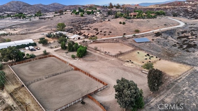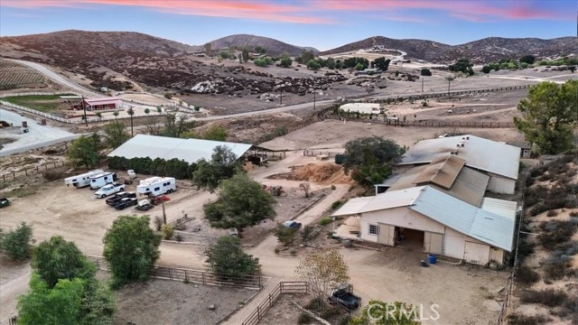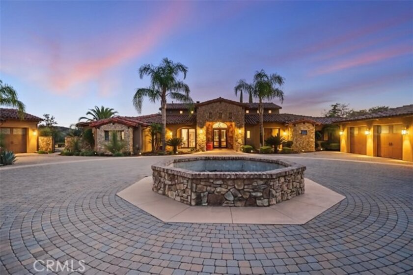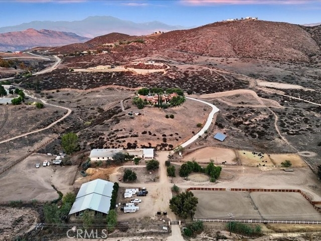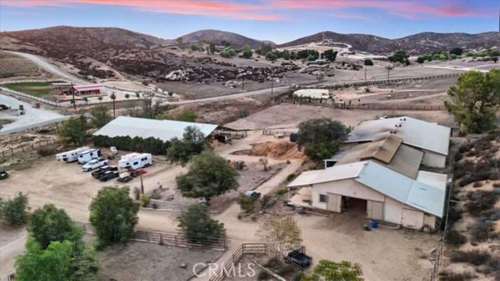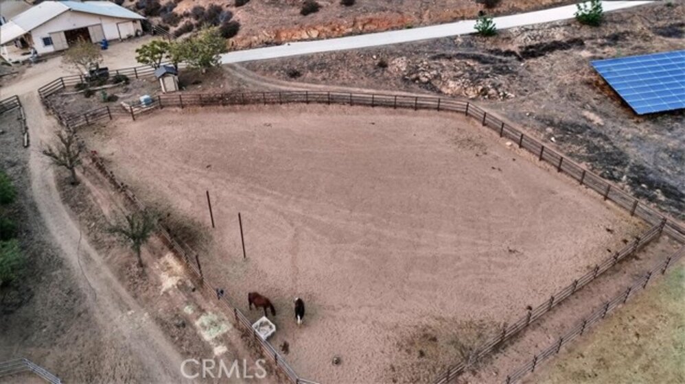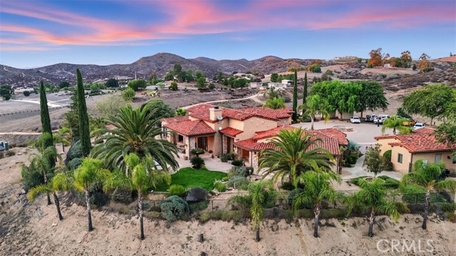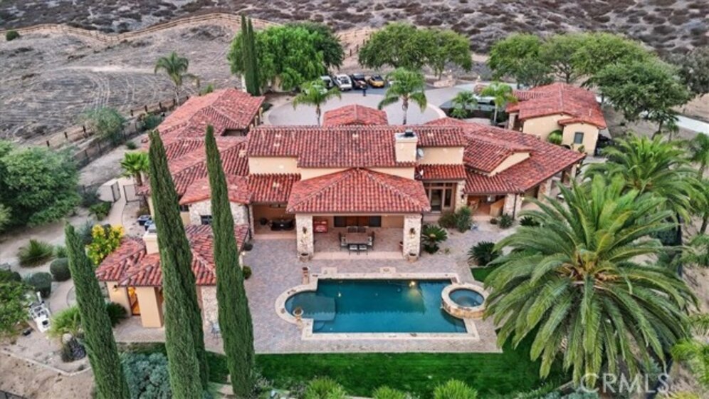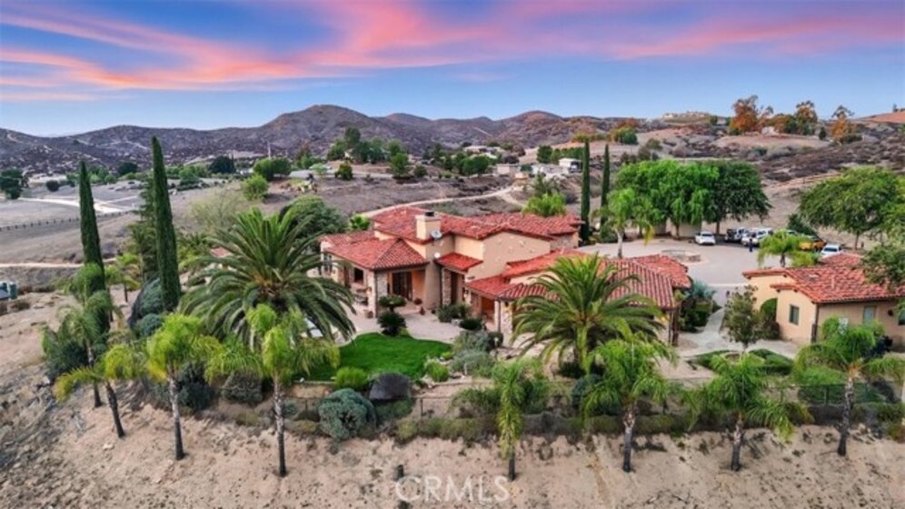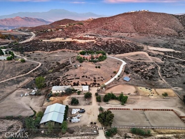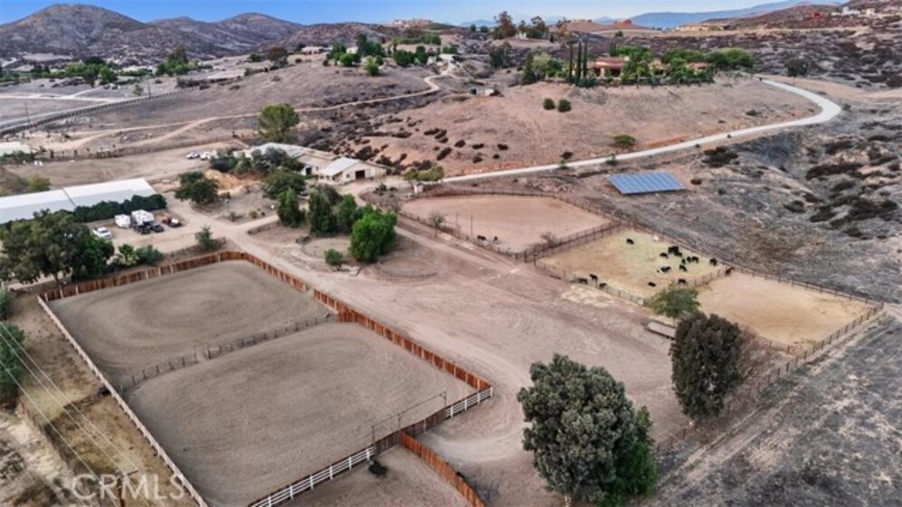 Nestled within the exclusive Oakridge Ranch Estates, this extraordinary 15.6-acre property perfectly combines refined country living with modern luxury. Designed for comfort and sophistication, it offers a rare balance of elegance, privacy, and functionality. Surrounded by scenic horse trails, the estate features extensive equestrian facilities and income-producing opportunities, making it ideal for horse enthusiasts or investors seeking a serene ranch setting. The main residence offers 3 spacious bedrooms and 3.5 bathrooms, while a detached guest house provides 1 bedroom and 1 bathroom, perfect for extended family or guests. Inside there are vaulted ceilings, chandeliers, and exquisite tile flooring for a luxurious living. This home is equipped with smart home technology that allows full control of lighting, climate, and security from anywhere in the world with aHomeWorks lighting system & three-zone HVAC. The living room is inviting with a beautiful stone fireplace and built-in mini bar, perfect for entertaining. The gourmet kitchen is a chef’s dream, complete with a walk-in pantry, double oven, center island with built-in refrigerator, and premium Wolf cooktop. Adjacent, the dining area is filled with natural light and offers breathtaking views of the property. The primary suite is a true retreat, with its own fireplace, a luxurious bathroom with walk-in shower, tub, vanity area, and expansive walk-in closet that has its own washer and dryer. Step outside to a private paradise: a resort-style backyard with a sparkling pool and spa, built-in BBQ, outdoor shower, mounted TV, and a spacious covered patio, ideal for relaxing or entertaining. The equestrian facilities are a standout feature and currently generate income. These include a 20+ stall show barn with office, 18-stall mare motel, a large fenced performance arena, and multiple fenced pastures—all designed for efficient, easy operation. Supporting infrastructure includes an Artesian well, a commercial-grade reverse osmosis water system producing up to 2,800 gallons per day, an oversized propane tank, and commercial traffic-rated septic systems for both homes. The reinforced concrete driveway is engineered to support the weight of an 18-wheeler, and a lease-free solar system adds long-term energy efficiency. More than just a home, this Oakridge Ranch Estates property offers a lifestyle with luxurious amenities, income, and the serenity of ranch living.